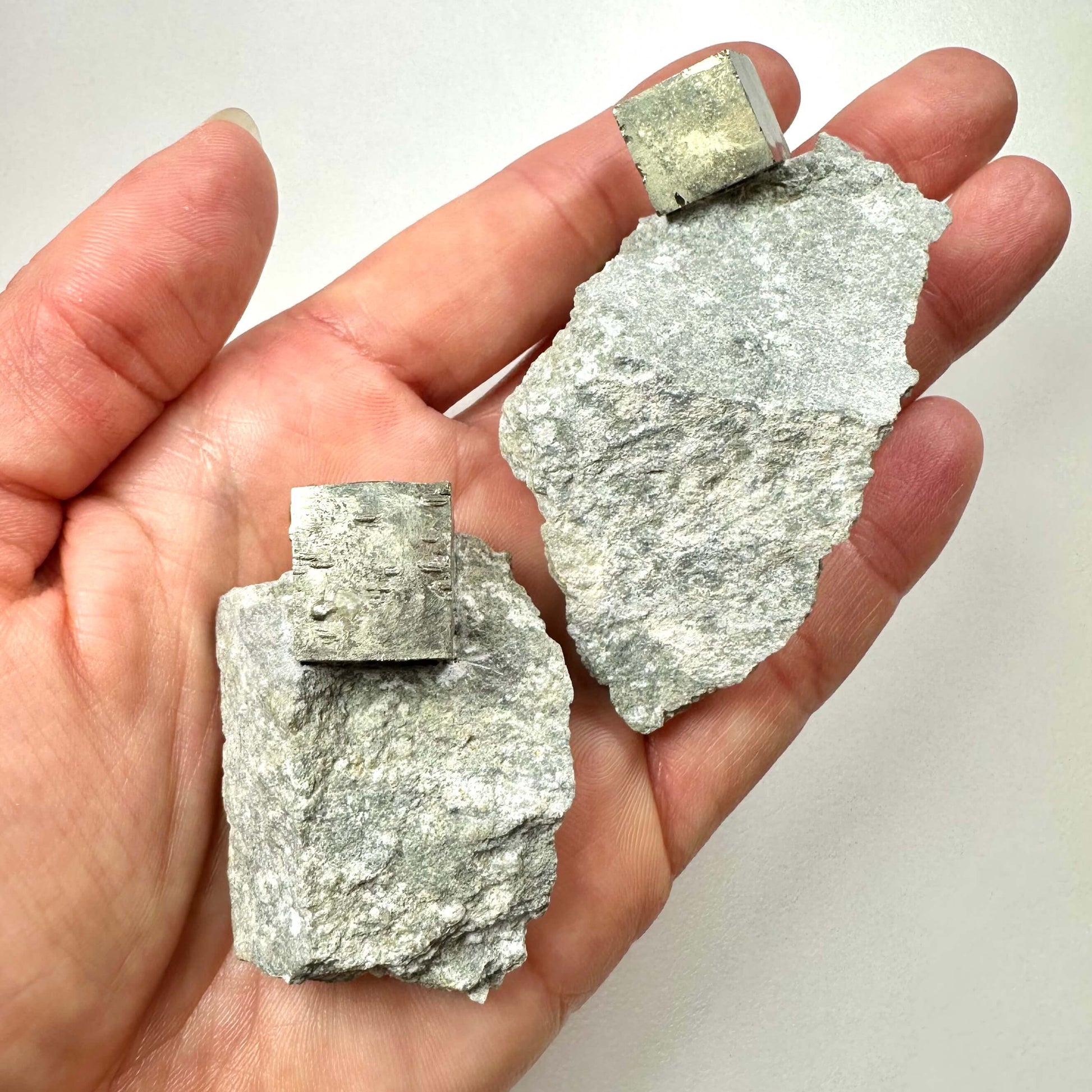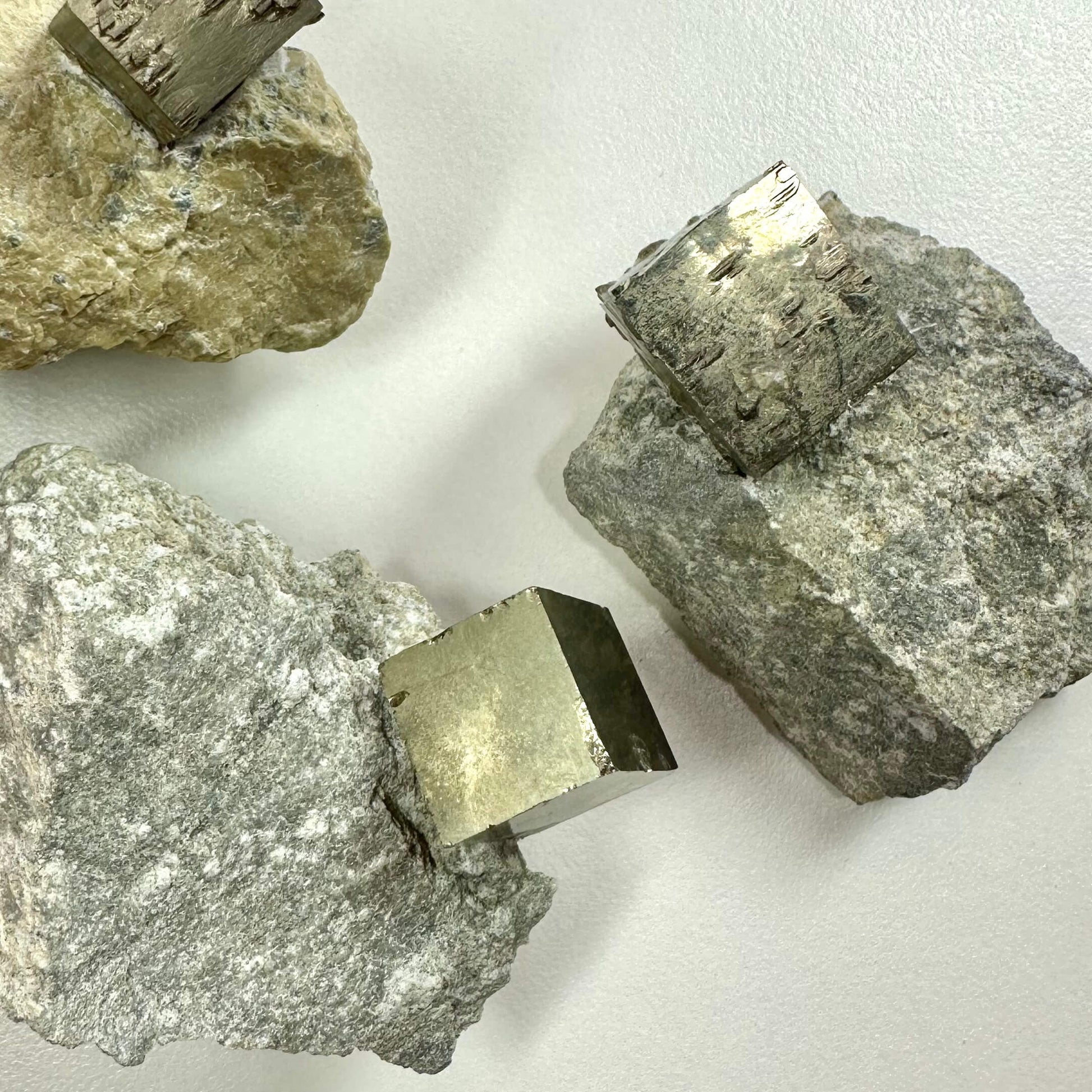 Pyrit dannes under højt tryk og temperatur i jorden, hvor jern og svovl kombineres. Den unikke kubiske krystalform opstår oftest i sedimentære, hydrotermale eller metamorfe miljøer. 'På modersten' refererer til, når stenen stadig er forbundet med sin naturlige værts- eller matrix-sten, hvilket bevarer artefaktens autenticitet og rå skønhed.