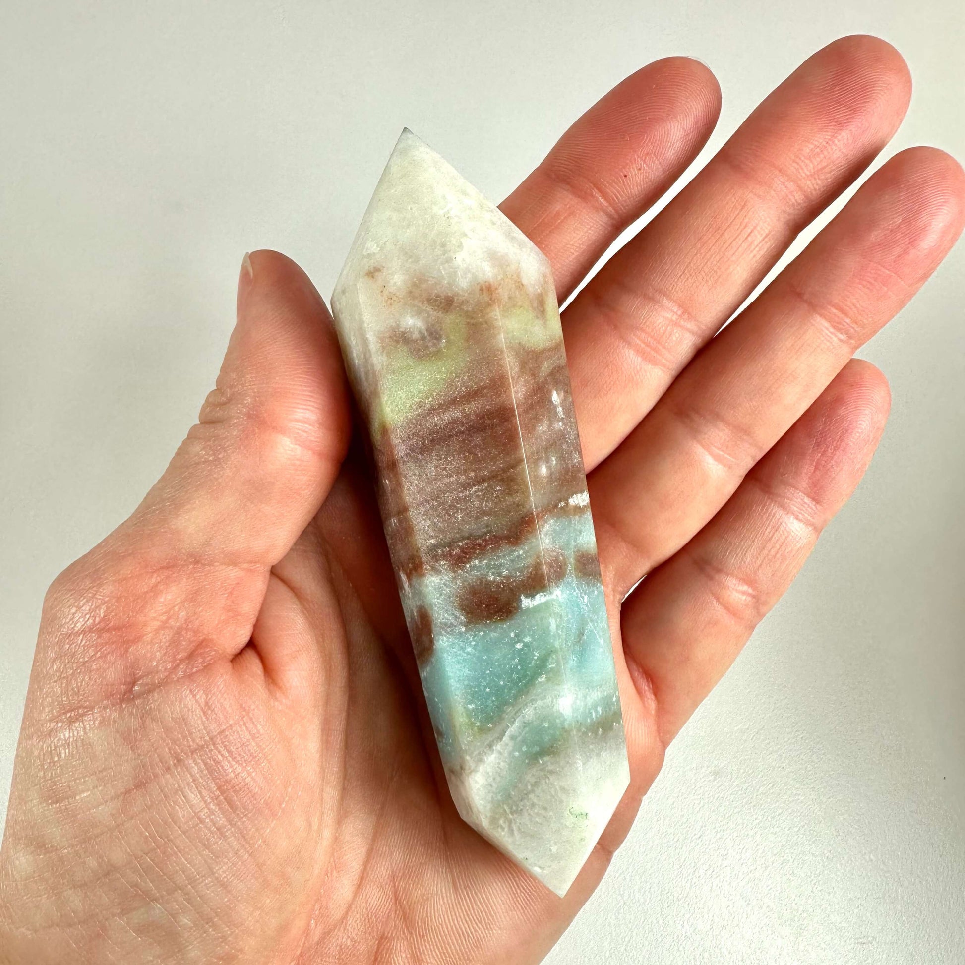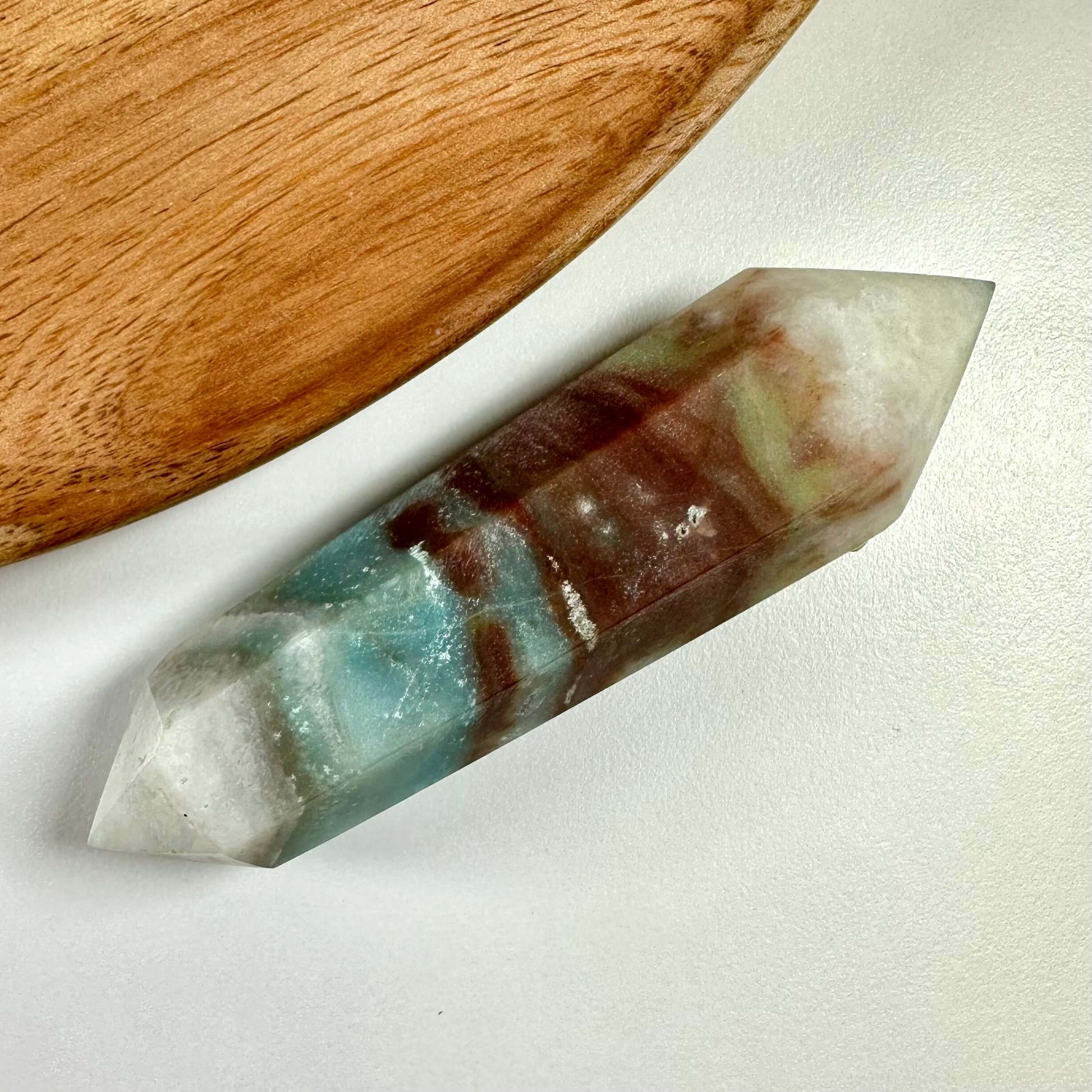 Denne matte, dobbelt terminerede amazonit skaber ro og balance og støtter klar kommunikation under meditation.