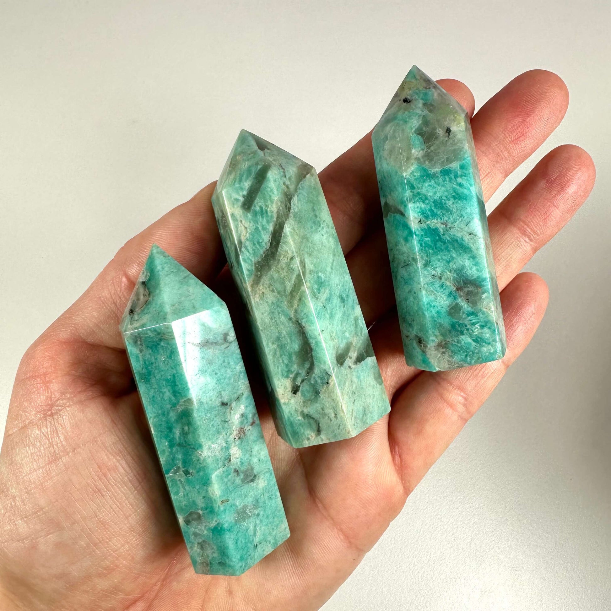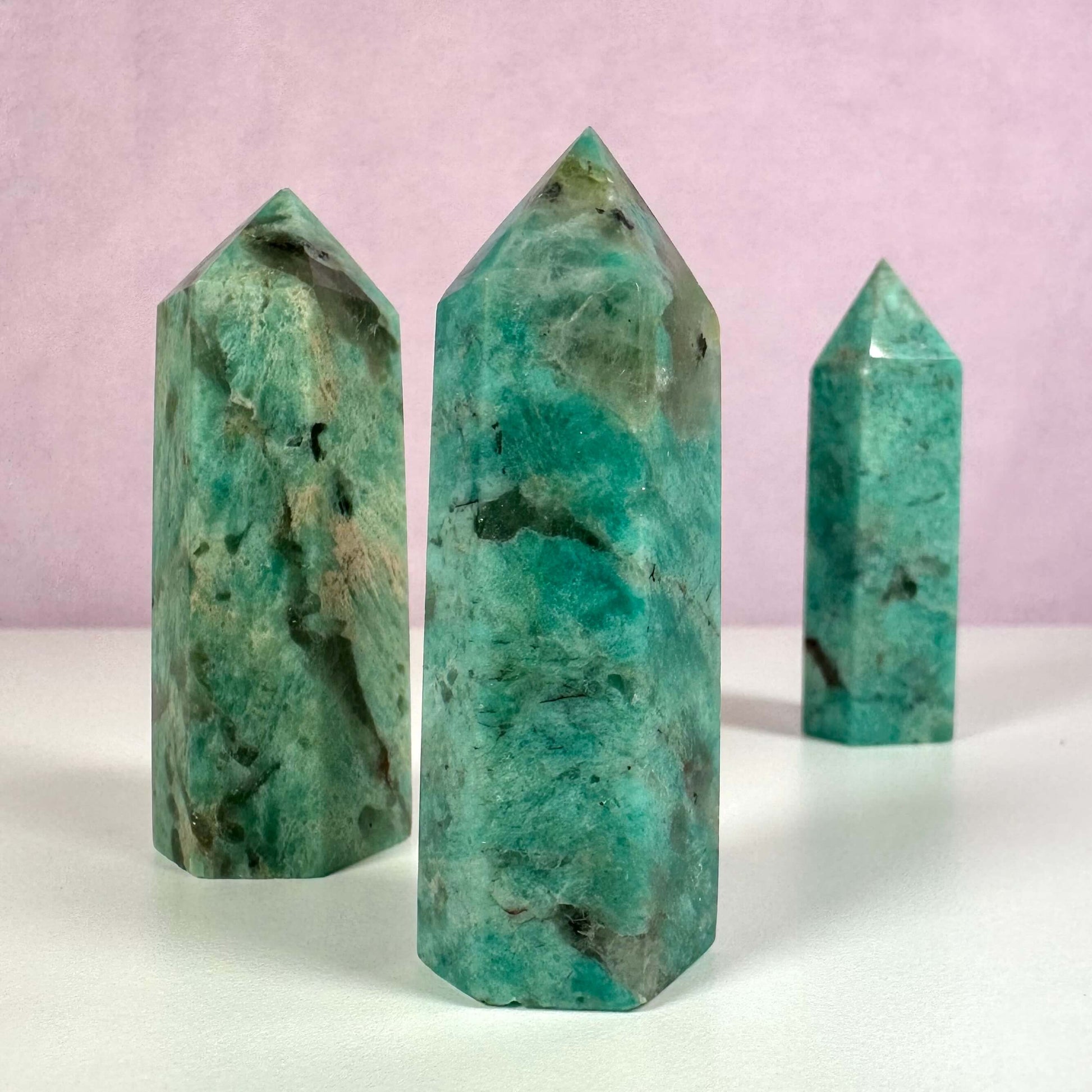 Amazonit er et feldspatmineral, der primært findes i granitiske bjergarter. Den karakteristiske farve skyldes tilstedeværelsen af bly og vand i strukturen. Når amazonit skæres og poleres i tårnlignende former, udnyttes dens evne til at lede energier opad og fremme spirituel opvækst. Denne form forarbejdes så nænsomt som muligt for at bevare dens smukke naturlige struktur.