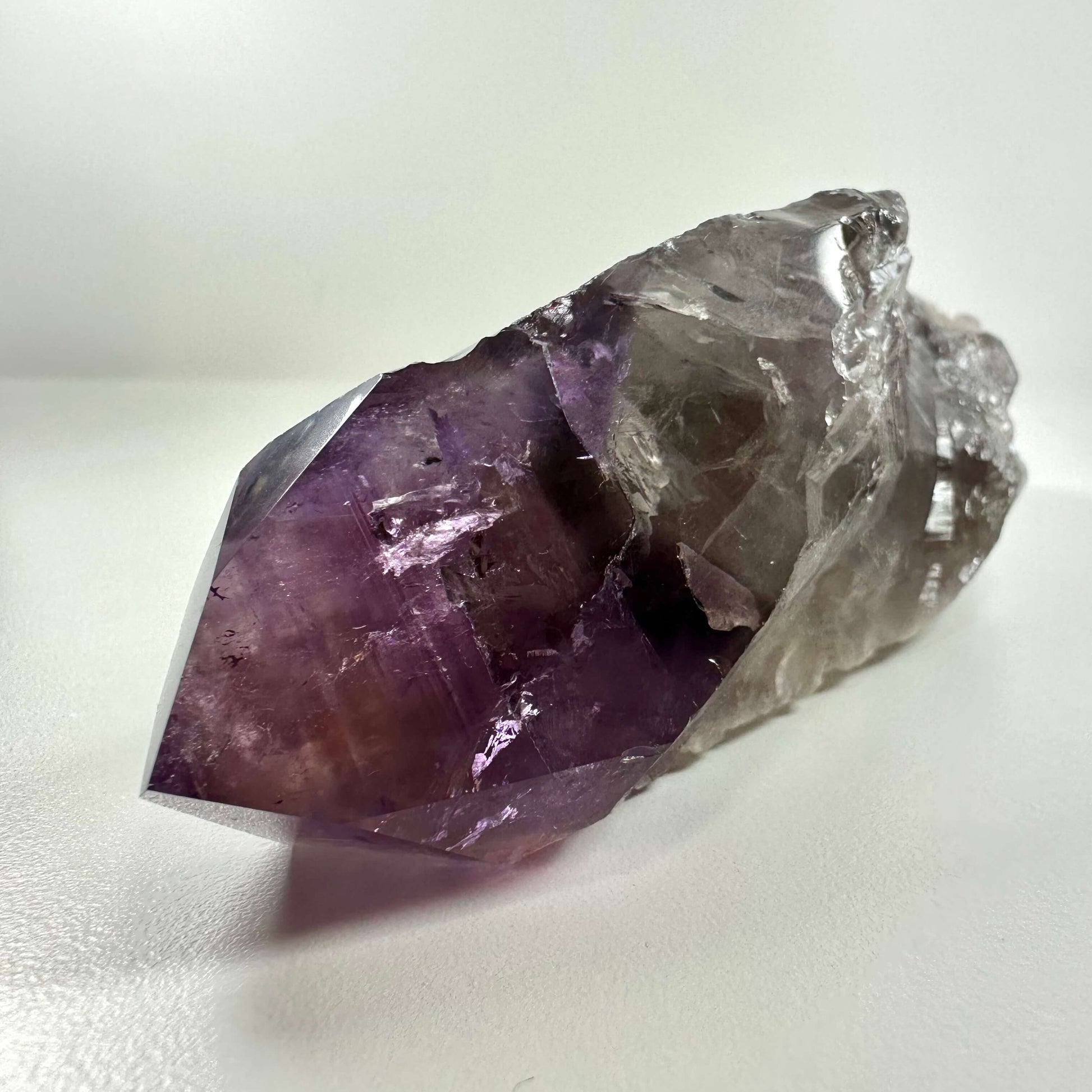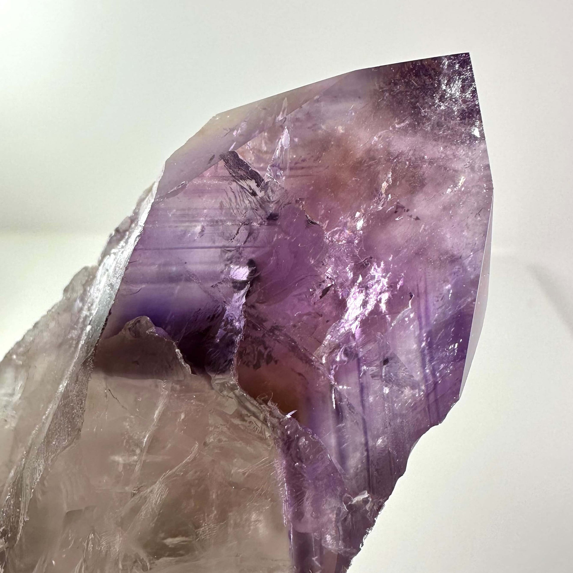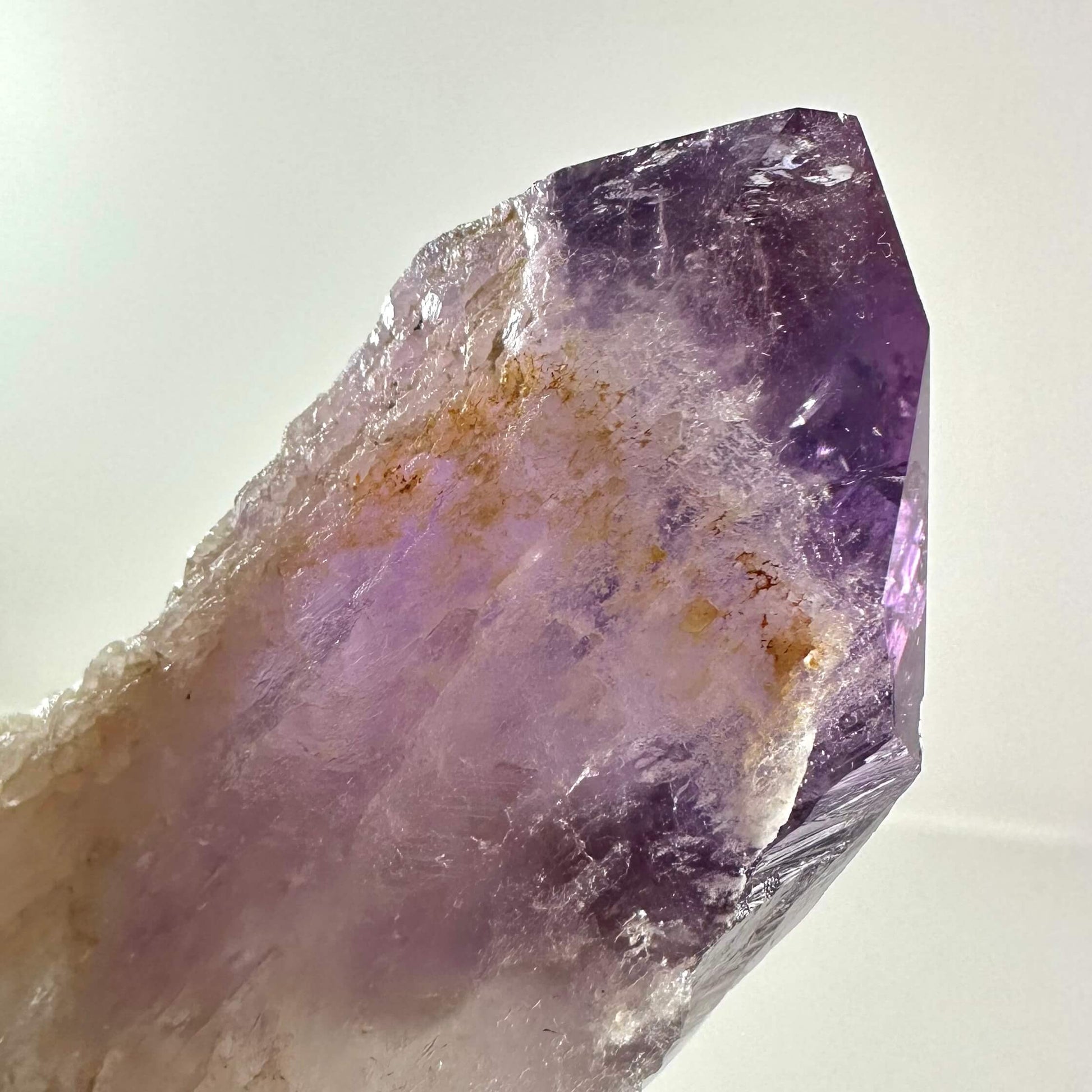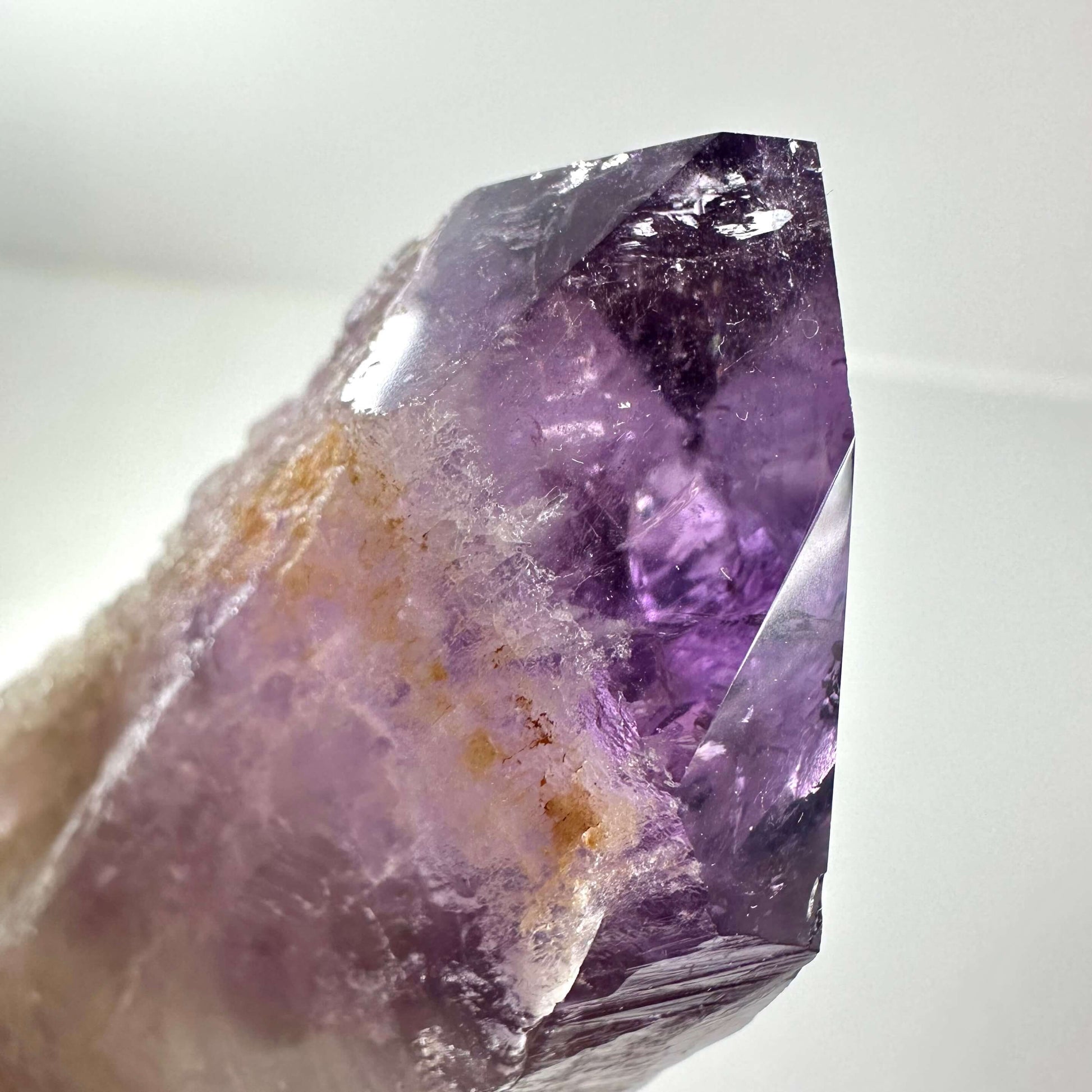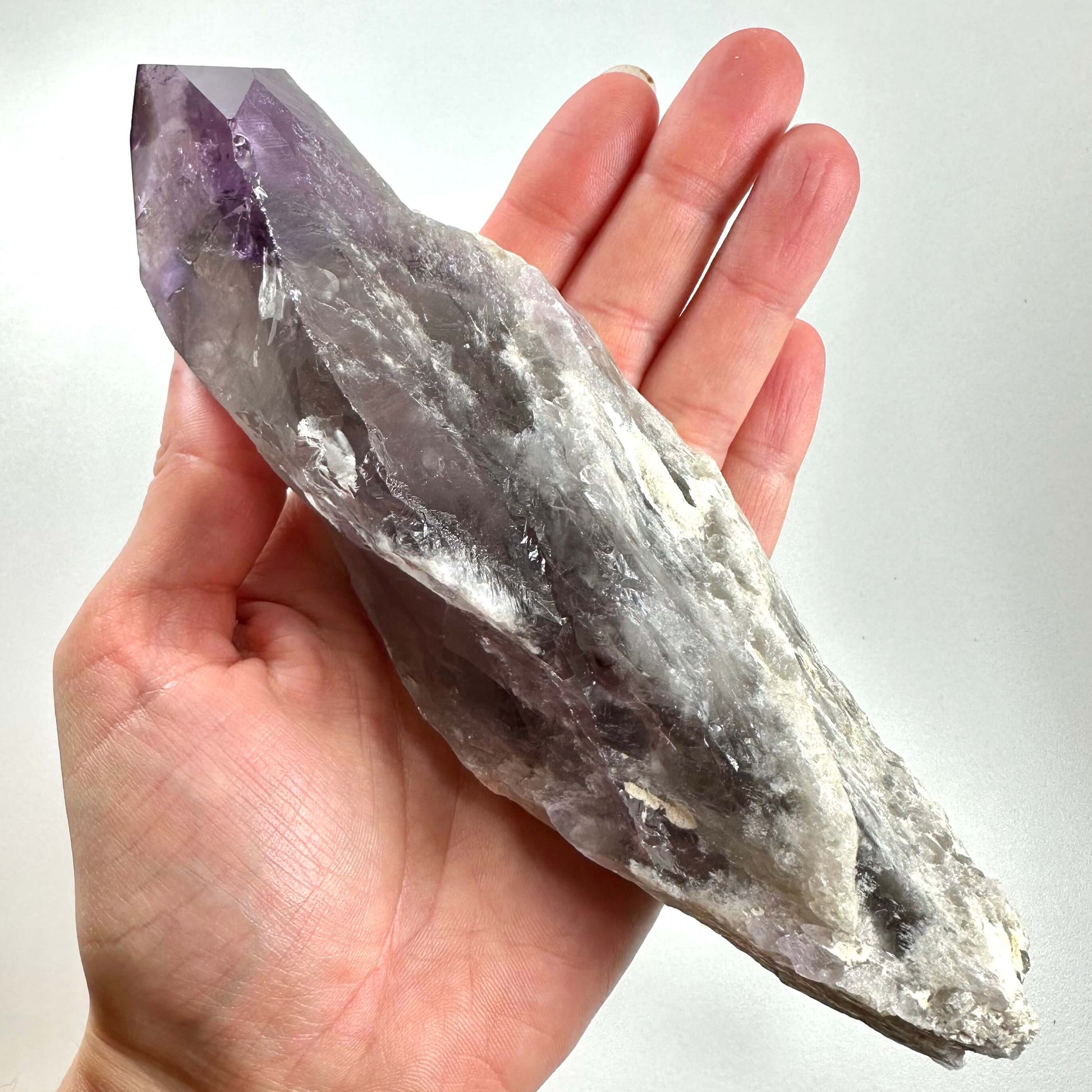 Ametyst septer nr. 3 kombinerer en lys kvartsbasis med en mere dyb lilla top, og er velegnet til meditation og energirensning.