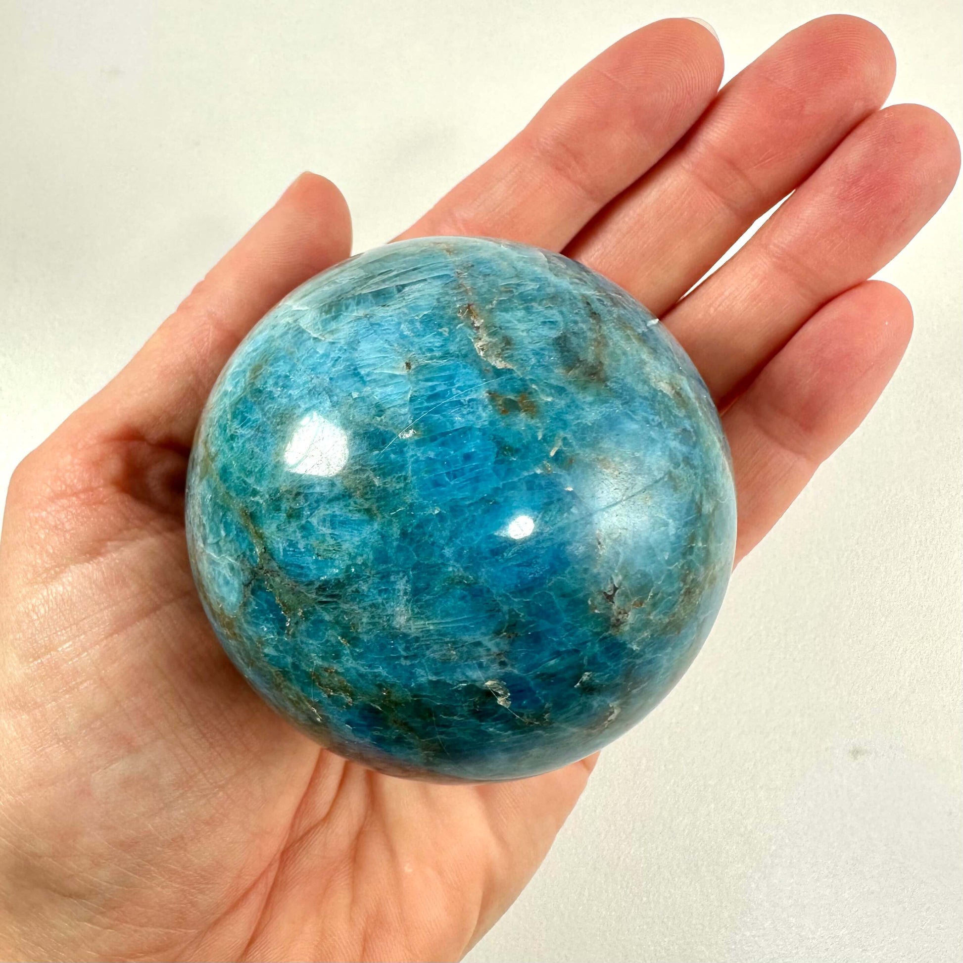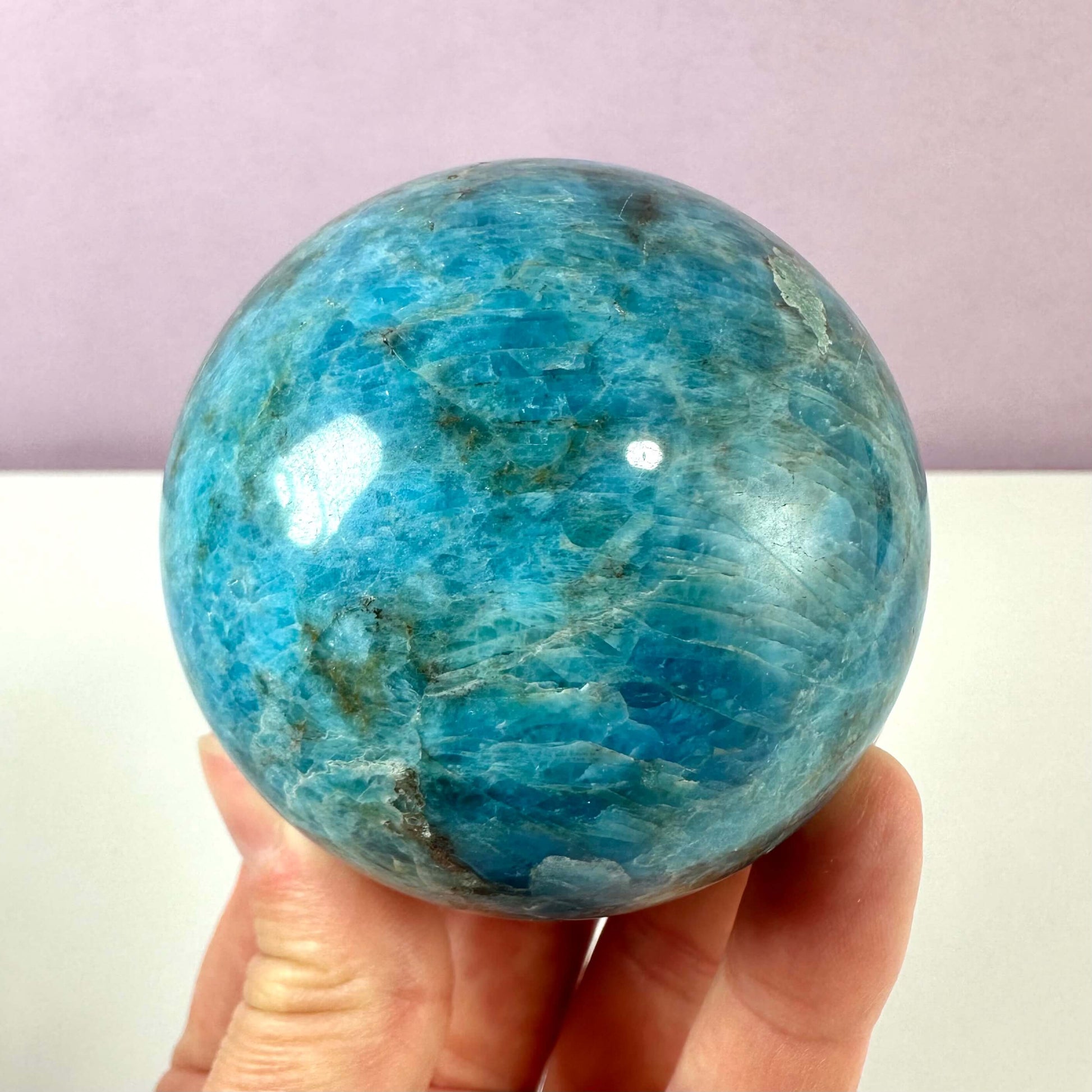 Blå apatit-kugle fremmer personlig vækst, mental klarhed og motivation og er ideel til meditation og kreativ udvikling.