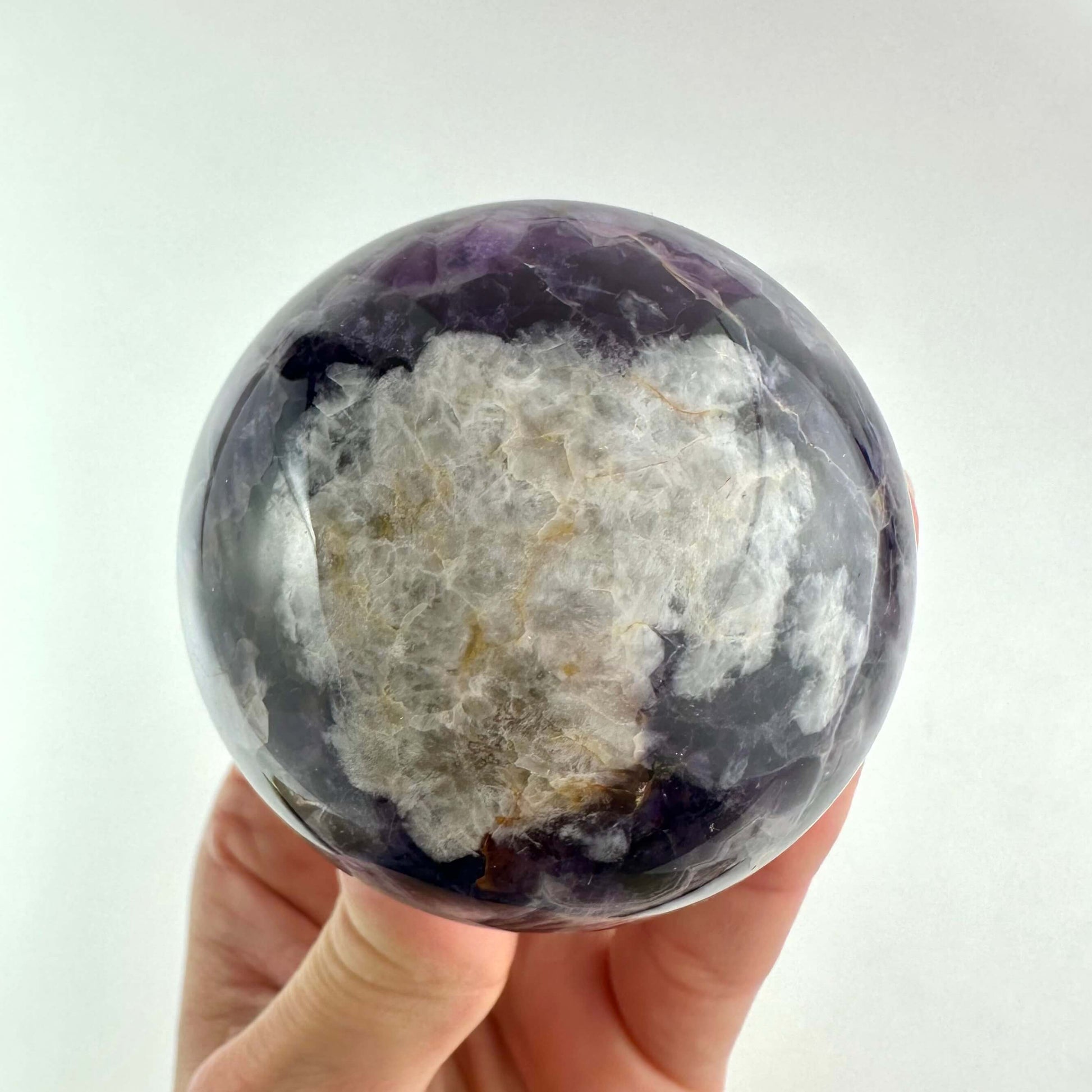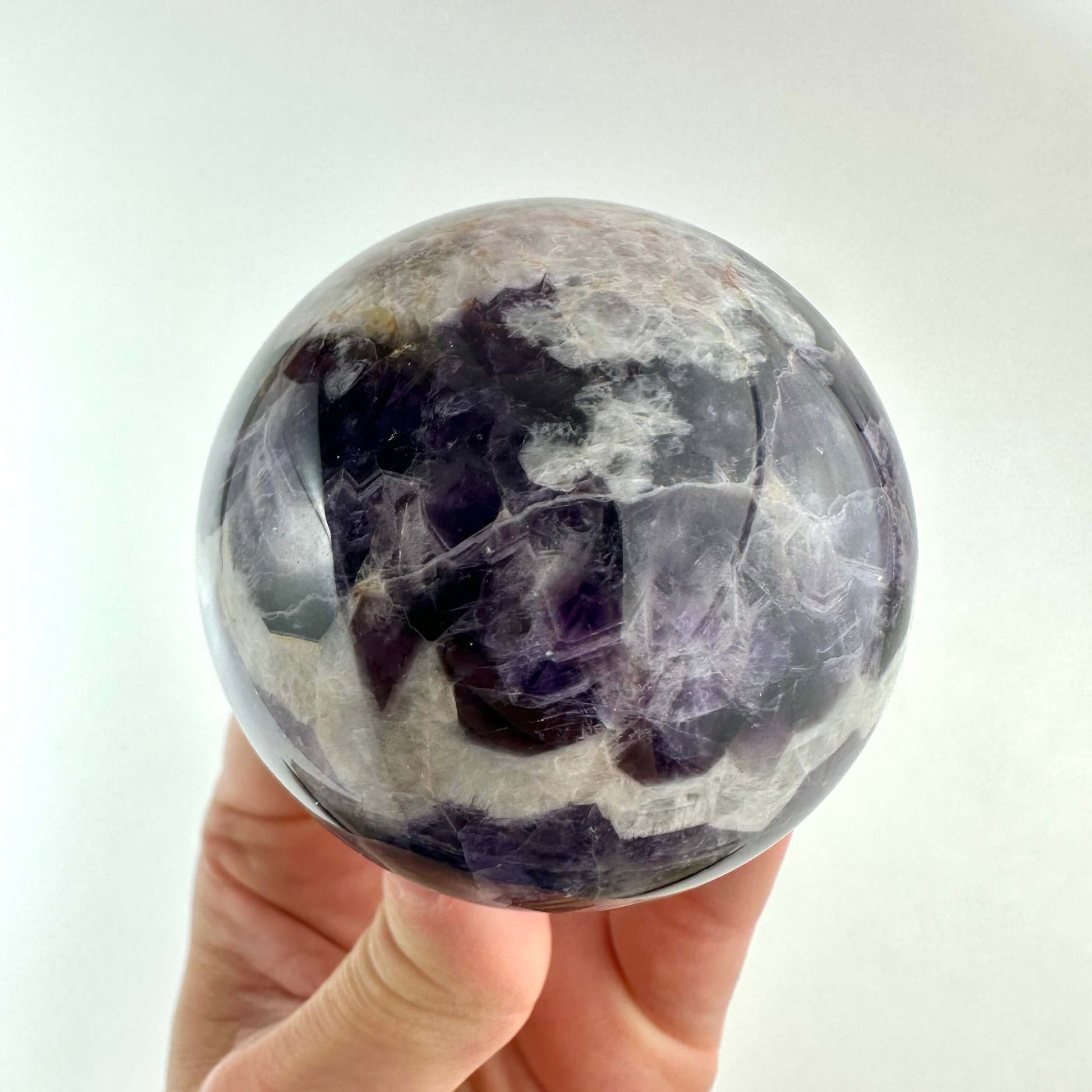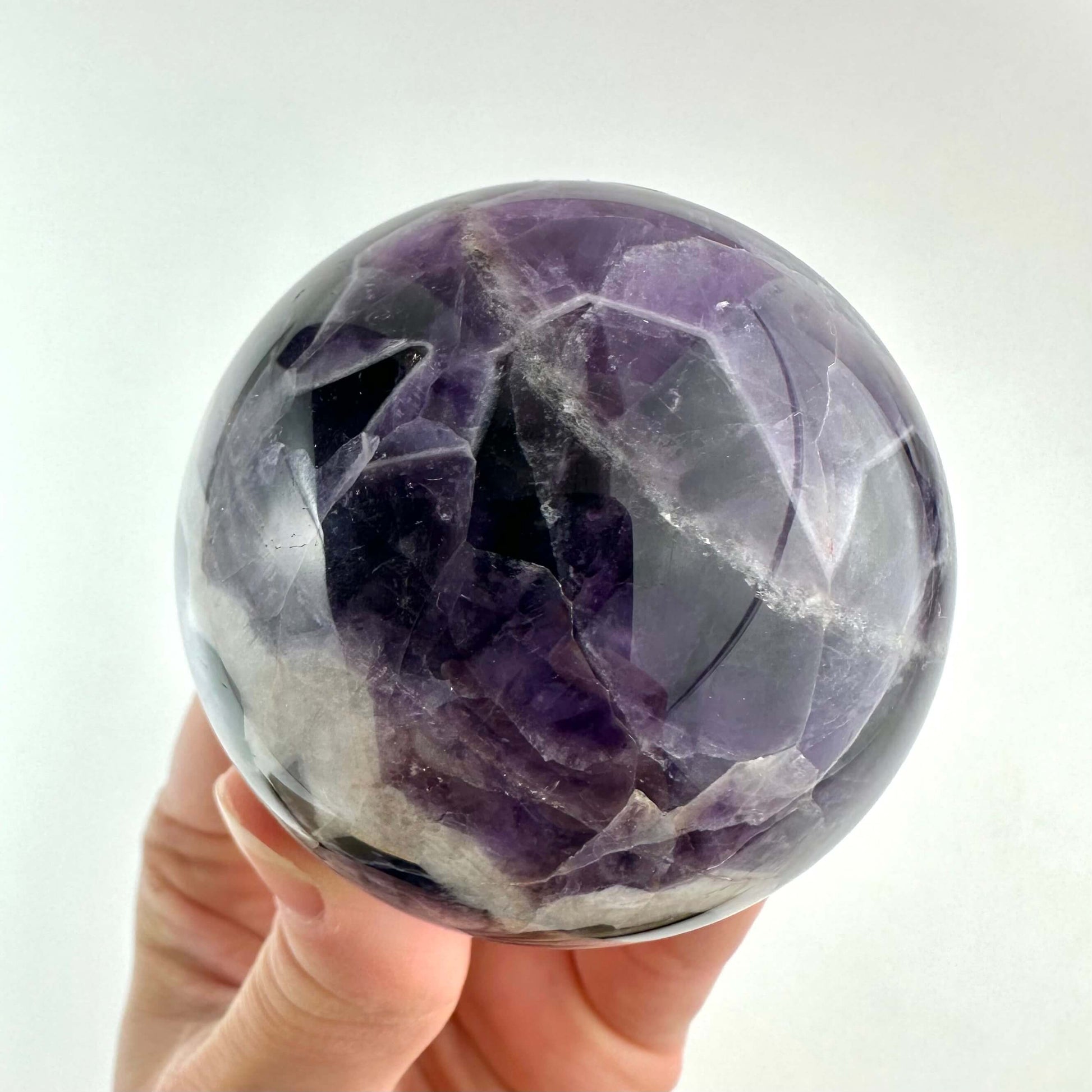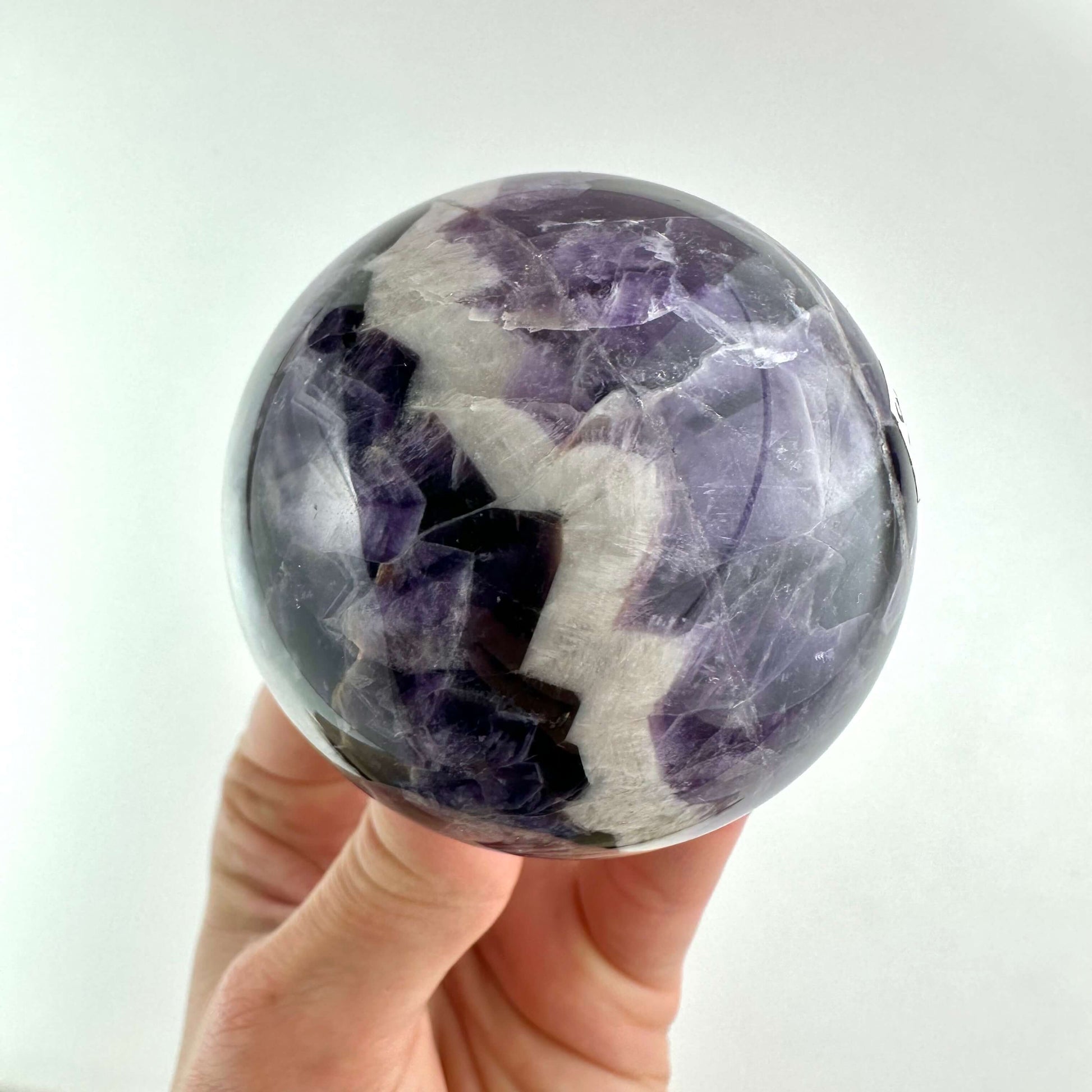 Chevron ametyst dannes gennem komplekse geologiske processer, hvor lag af violet ametyst og hvid kvarts interagerer under krystalliseringen. Denne lagdelingsproces resulterer i de karakteristiske V-formede bånd, der gør hver kugle unik. De fleste af disse vidunderlige sten dannes i naturlige hulrum i vulkanske bjergarter i områder som Brasilien og Madagaskar.