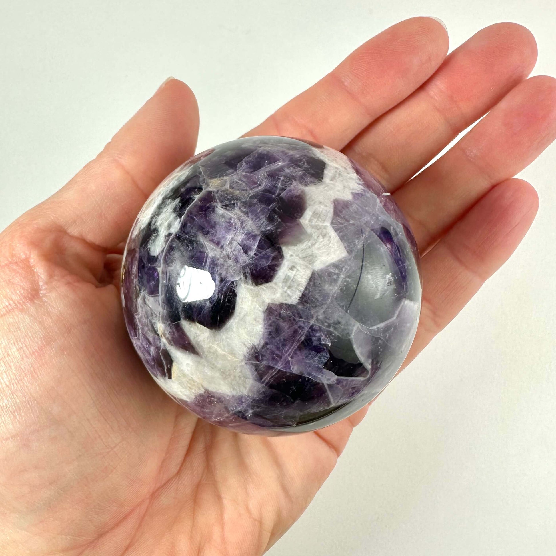 Chevron ametyst kuglen er kendt for sin utrolige skønhed og de unikke violette og hvide chevronmønstre, den fremviser. Disse mønstre tiltrækker ikke kun mineral- og krystalentusiaster, men menes også at have spirituelle og helbredende egenskaber. Chevron ametyst er kendt for at bringe klarhed og ro i sindet og beskytte mod negativ energi. Den ses ofte som en krystal, der fremmer personlig vækst, hjælper med at løsne følelsesmæssige blokeringer og styrker positiv energi i hjemmet.
