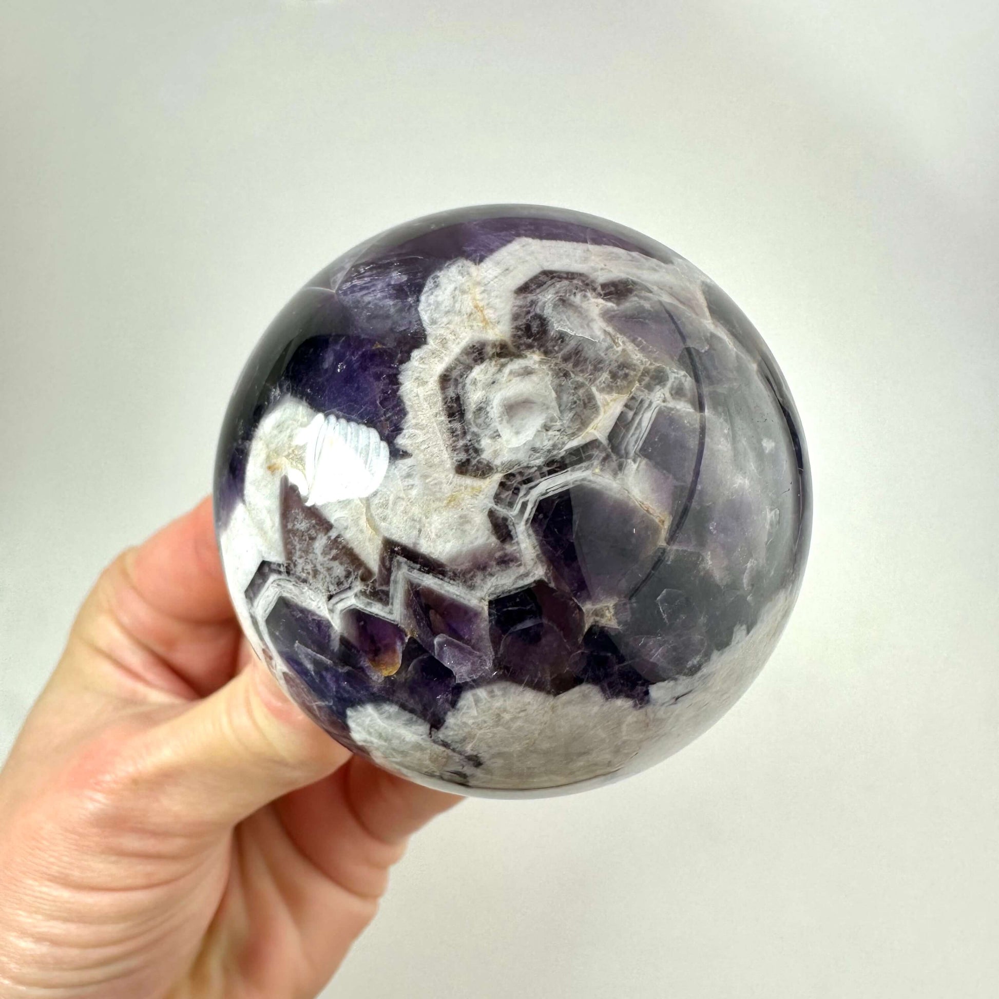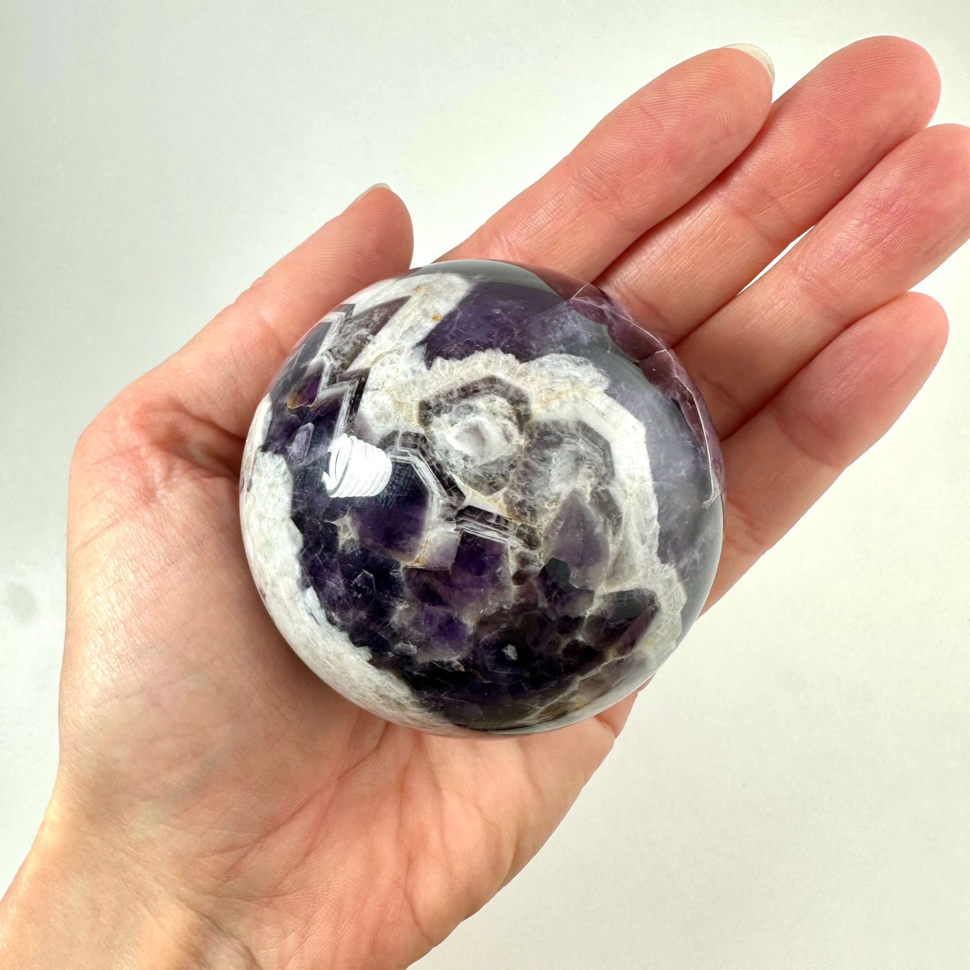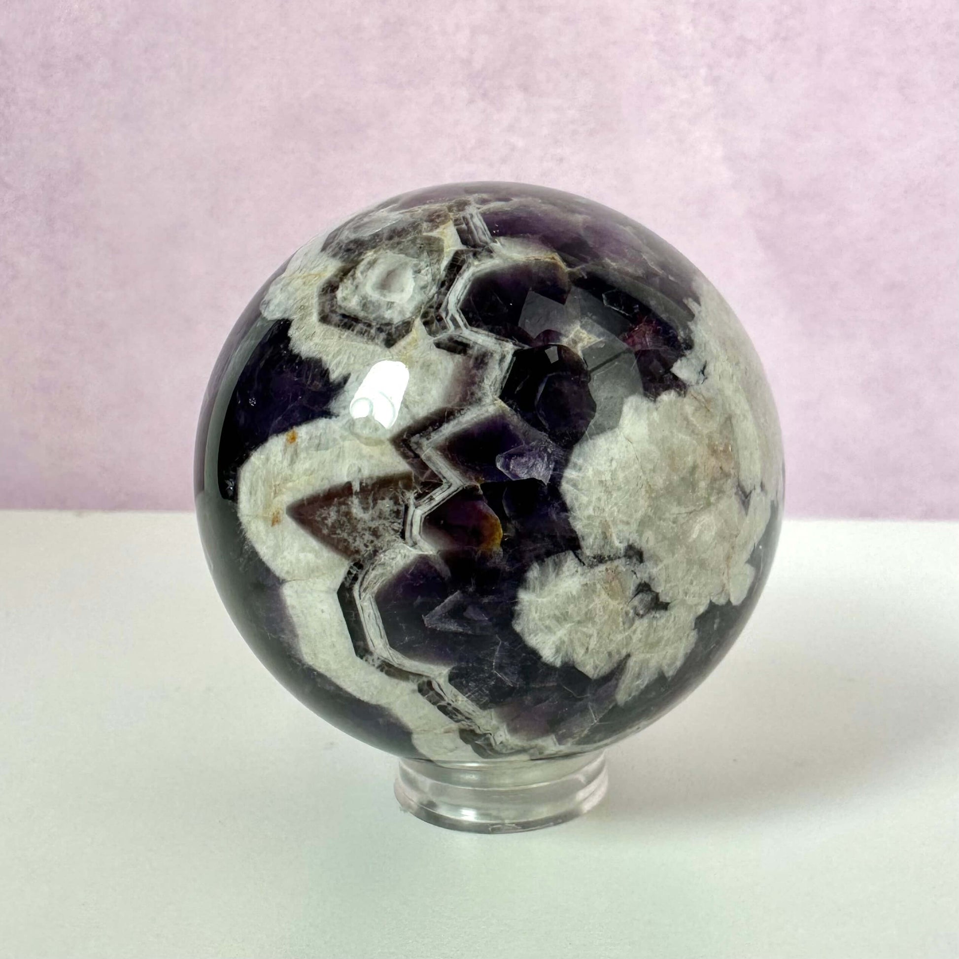 Chevron ametyst kugle udstråler ro og balance med sit karakteristiske violet-hvide zigzag-mønster.