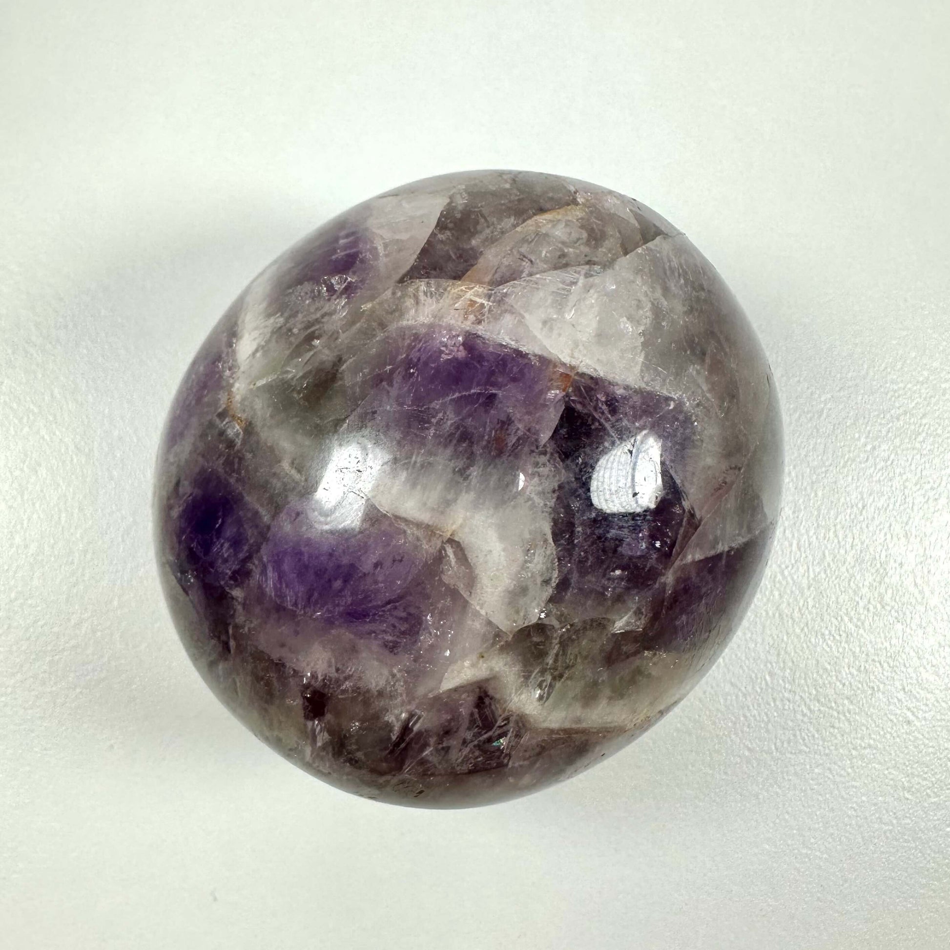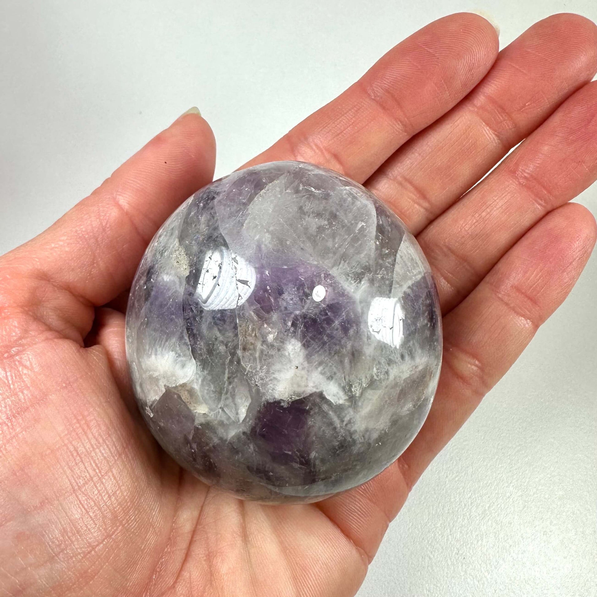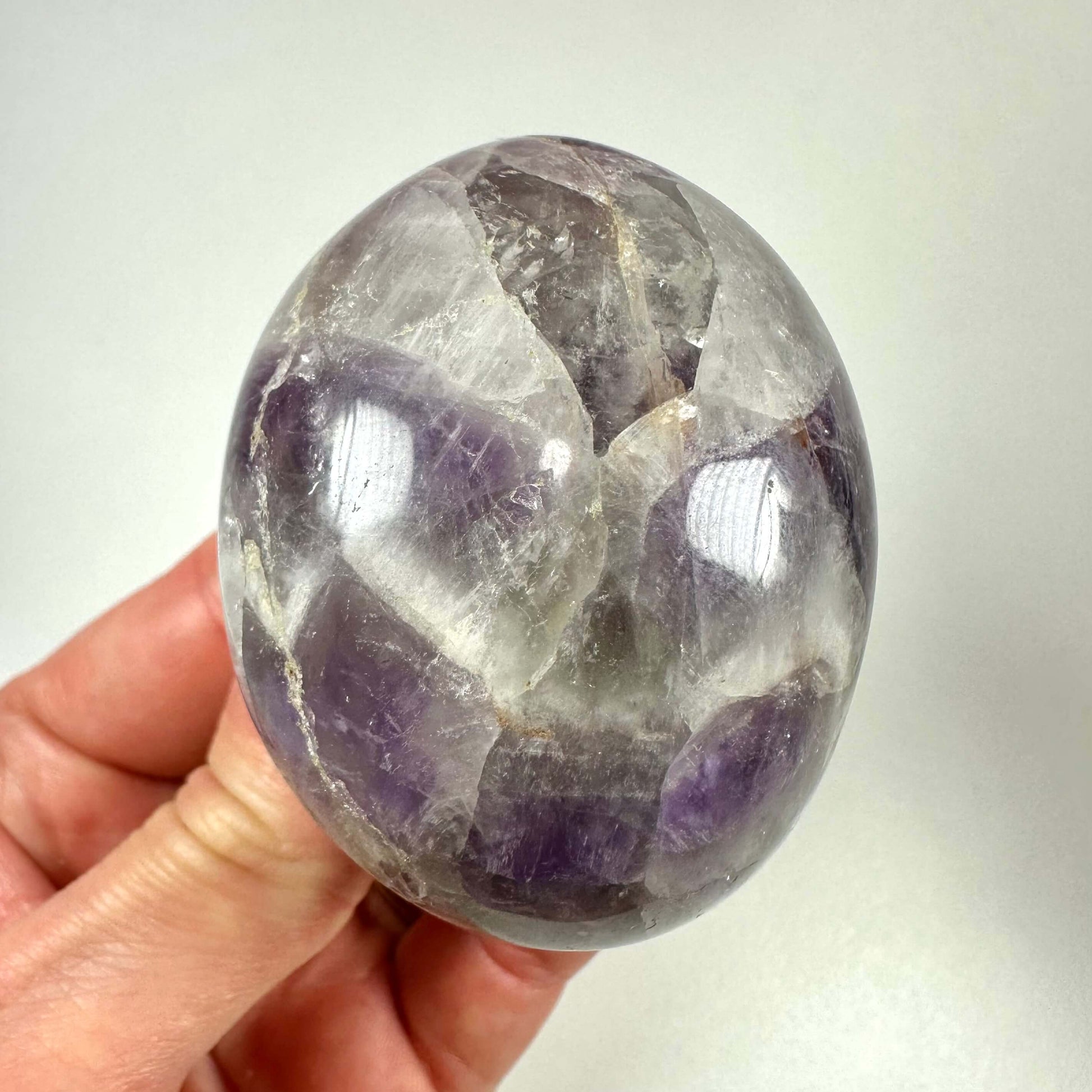 Chevron ametyst palmstone er en poleret drømmeametyst med tydelige hvide bånd, der skaber en harmonisk og beroligende energi.