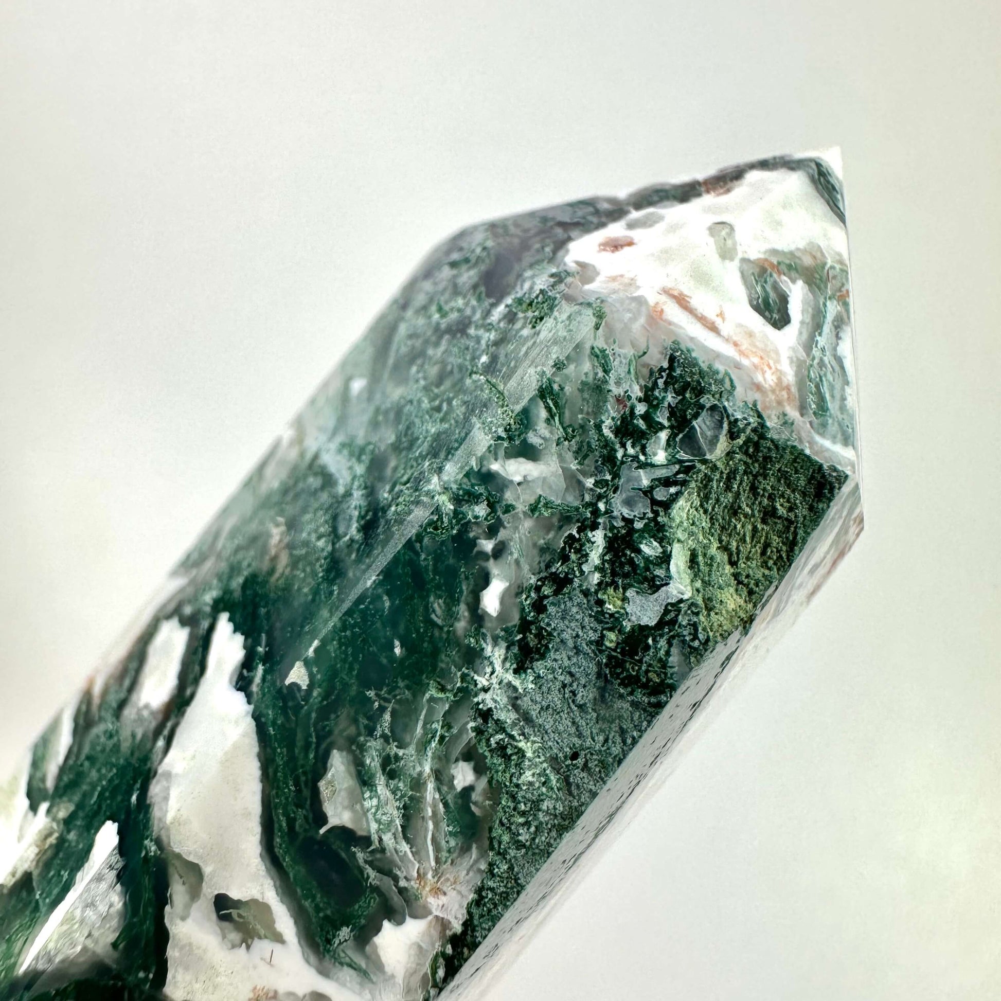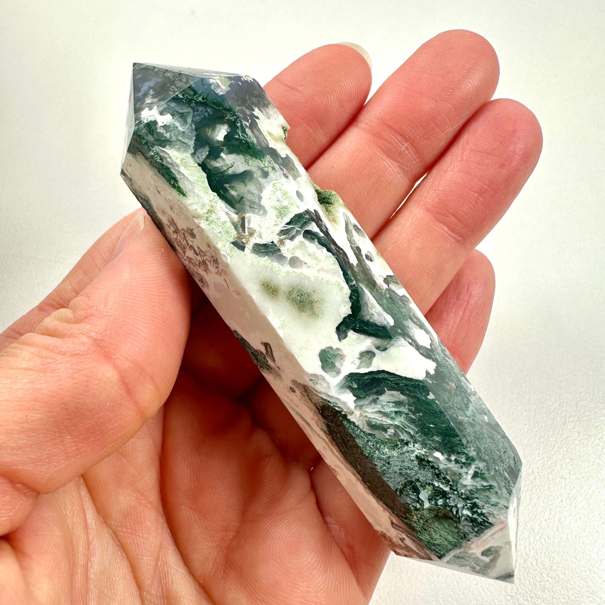 Dobbelt termineret mos agat har dobbelte spidser og udstråler en mild, jordforbindende ro.