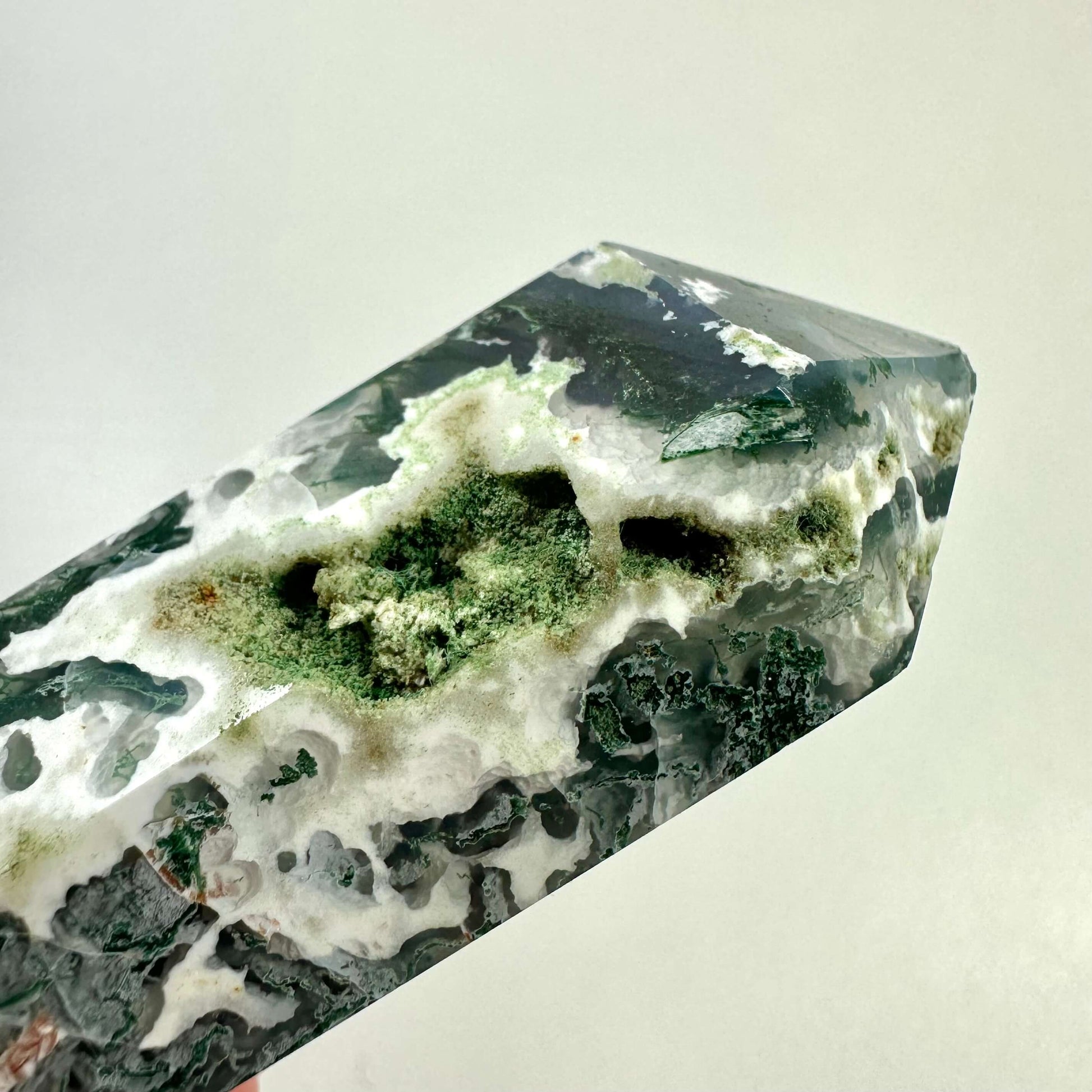 Dobbelt termineret mos agat er ikke blot en æstetisk tiltalende sten, men også en kraftfuld energikanal, der forbedrer energi-flowet i begge retninger. Denne type mos agat er kendt for sine moslignende inklusioner, der skaber et hypnotiserende landskab inde i stenen. Mos agaten vibrerer på en lav frekvens, hvilket gør den ideel til sindsstabilisering og skaber balance mellem Yin og Yang. Den er en allieret i stressreduktion og skaber en beskyttende energiboble, der skærmer mod negative påvirkninger.