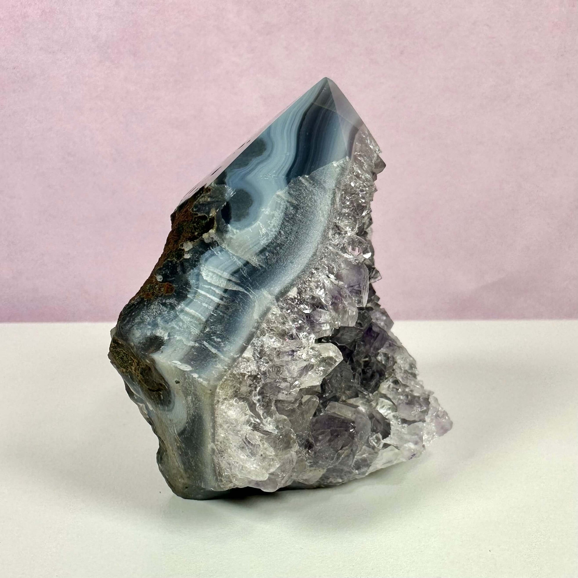 Drusy ametyst spids er en fascinerende krystal, der kombinerer ametystens dybdefulde lilla nuance og den glitrende skønhed ved drusy-overfladen. Ametyst er berømt for sine beroligende egenskaber og anses som en kraftig måde at formidle spirituel bevidsthed på. Den siges at reducere stress, forbedre søvn og frembringe mental klarhed. Drusy-overfladen, med sine mange små krystaller, forstærker ametystens energetiske kapacitet, gør den ideel til meditation og energiarbejde. Denne krystal beskytter mod negative energier og hjælper med at åbne sindet for højere tilstande af bevidsthed.