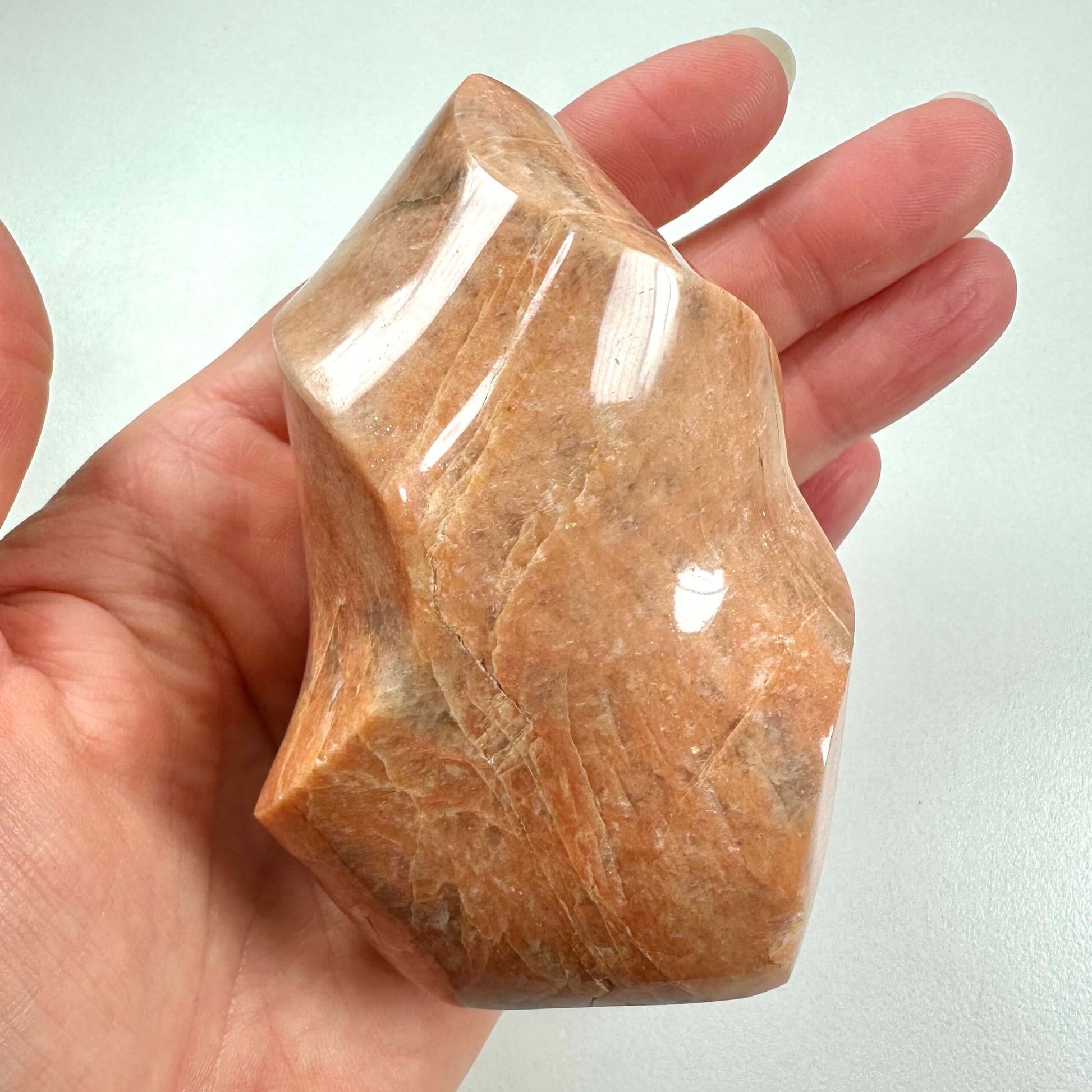 Fersken månesten flamme er en unik og æstetisk krystalform kendt for sin evne til at fremme femininitet, intuition og emotionel balance. Denne krystal er berømt for sin blide ferskenfarvede nuance og melkeagtige glans, kaldet adularescens. Fersken månesten anses for at styrke selvkærlighed, kreativitet og hjælper med emotionel healing, hvilket gør den ideel til meditation og personlig vækst.