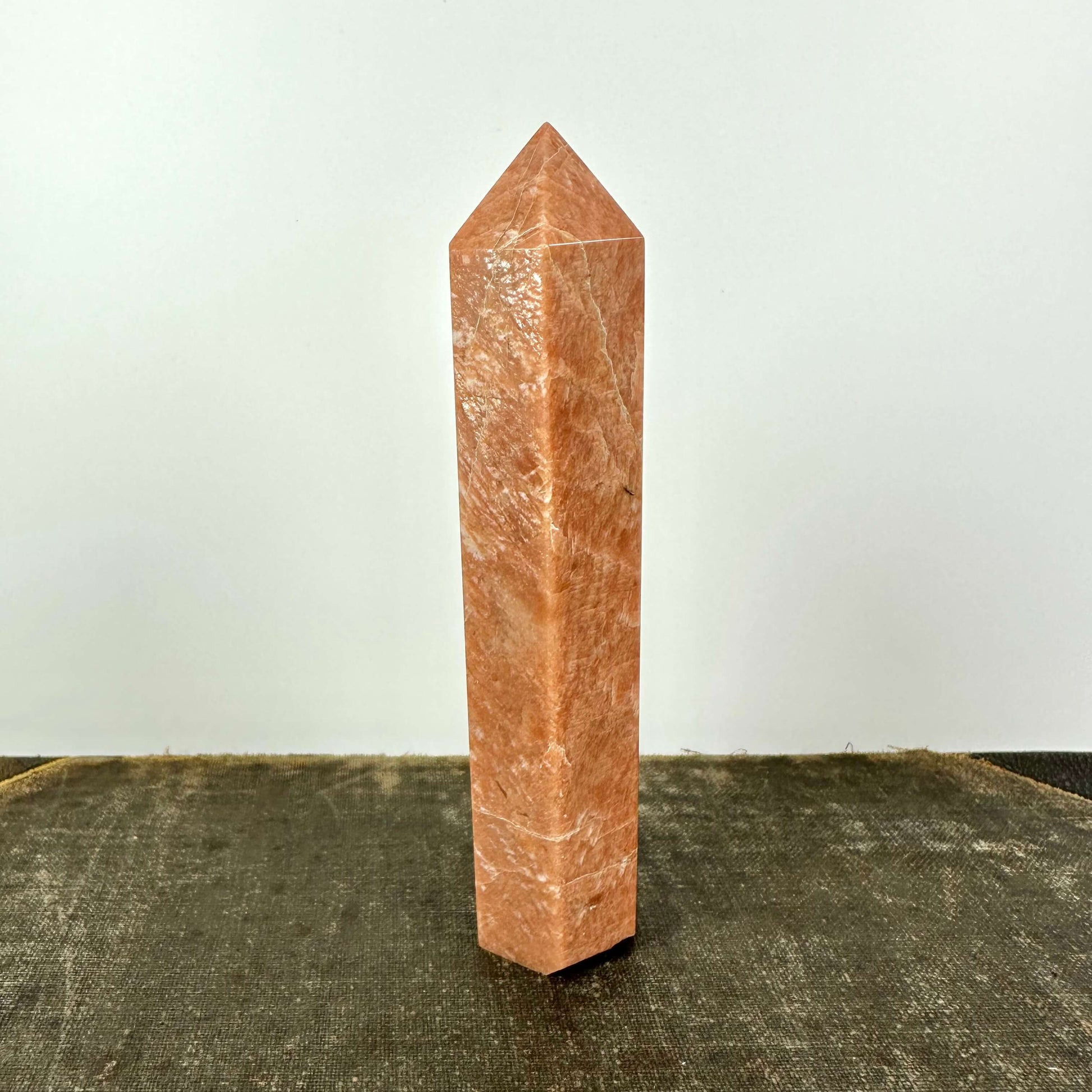 Dette fersken månesten tårn udstråler en beroligende og nærende energi, ideelt til meditation og følelsesmæssig balance.