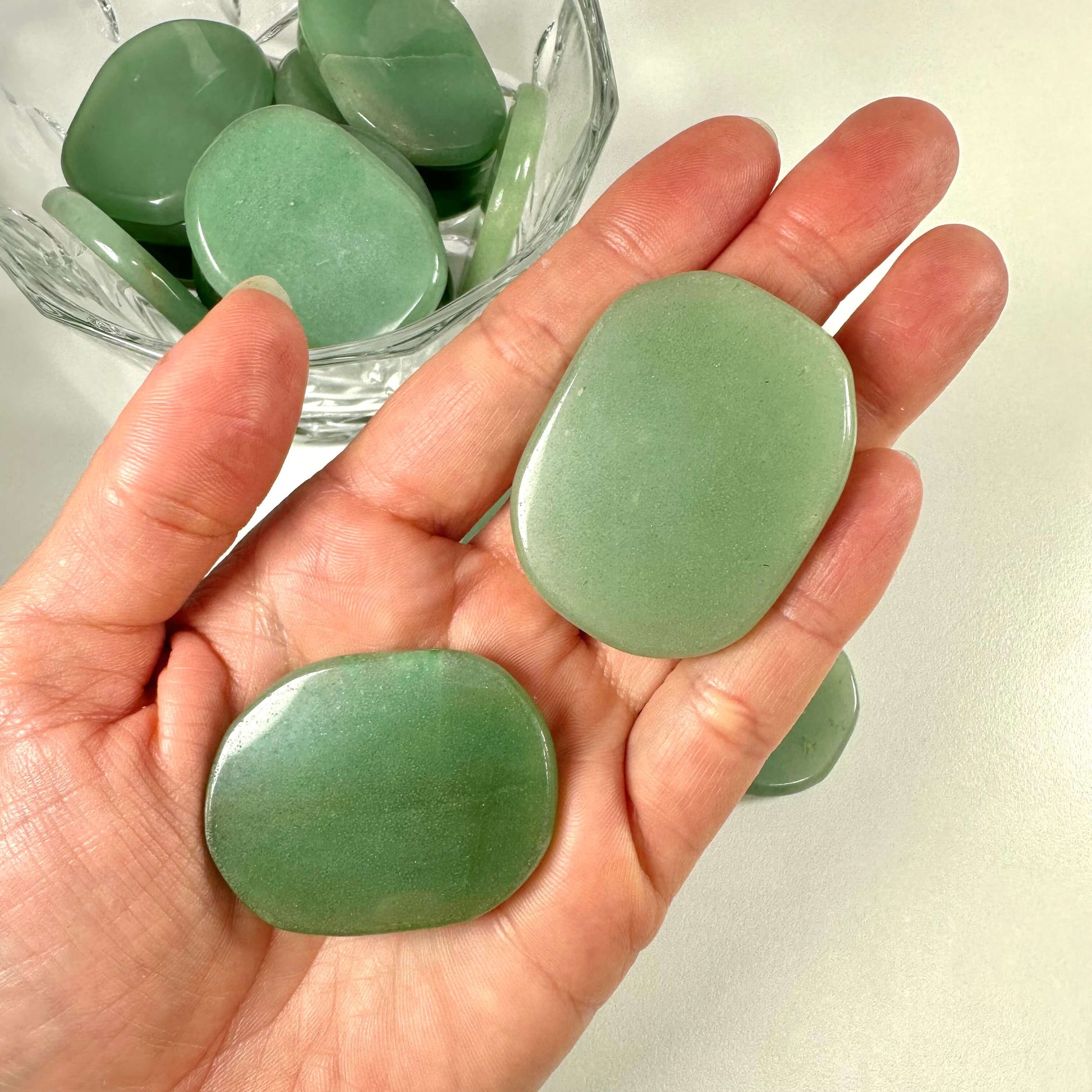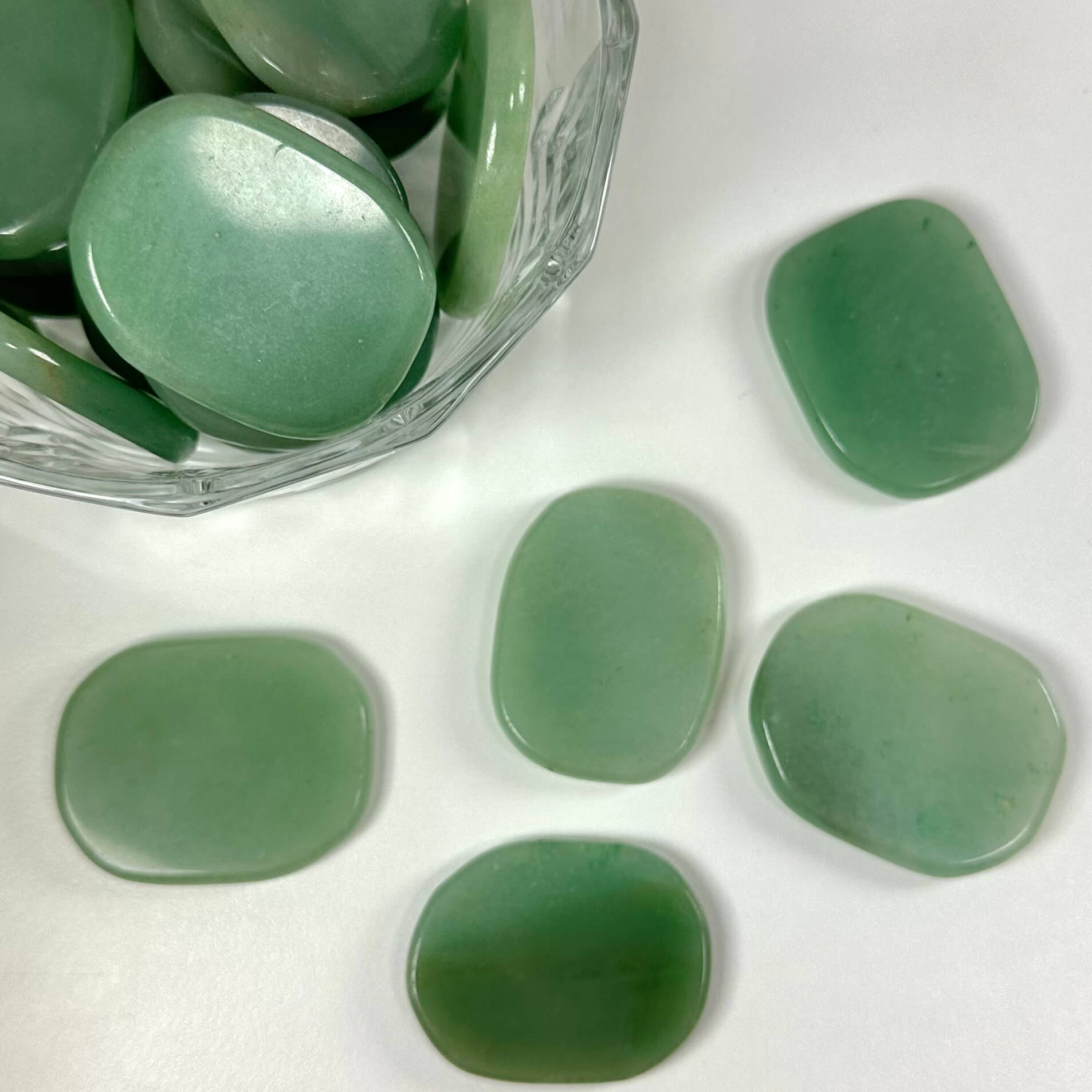 Oplev grøn aventurin skiven, en elegant sten der bidrager med ro og balance. Passer perfekt i lommen eller bhén.