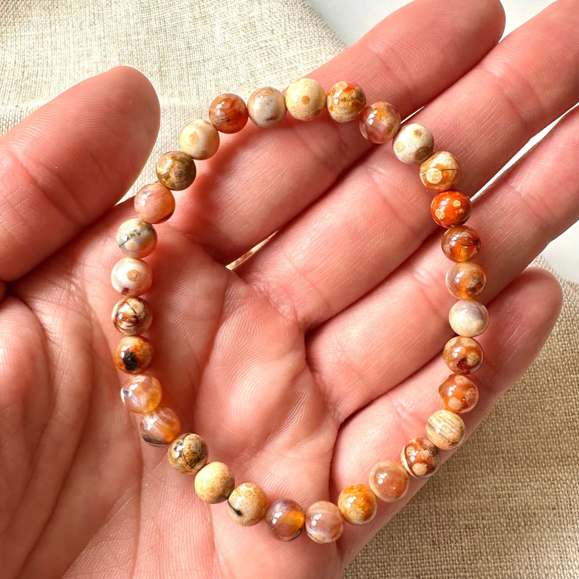 Ild agat armbånd er mere end blot et smukt smykke. Denne særlige sten er kendt for sine jordforbindende og styrkende energier, der hjælper med at forankre bæreren i nuet. Med sine kontrastfyldte nuancer siges den at fremme modstandskraft og personlig styrke. Som en del af den alsidige agat-familie tilbyder ild agat energier, der balancerer, beroliger og beskytter, og gør det til et populært valg for både spirituel praksis og personlig stil.