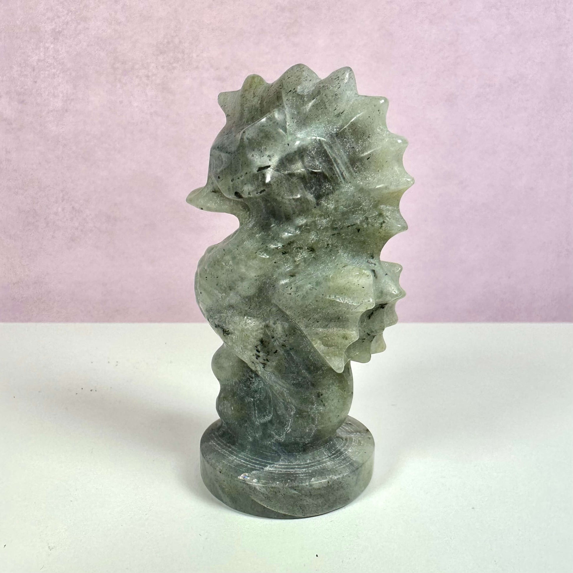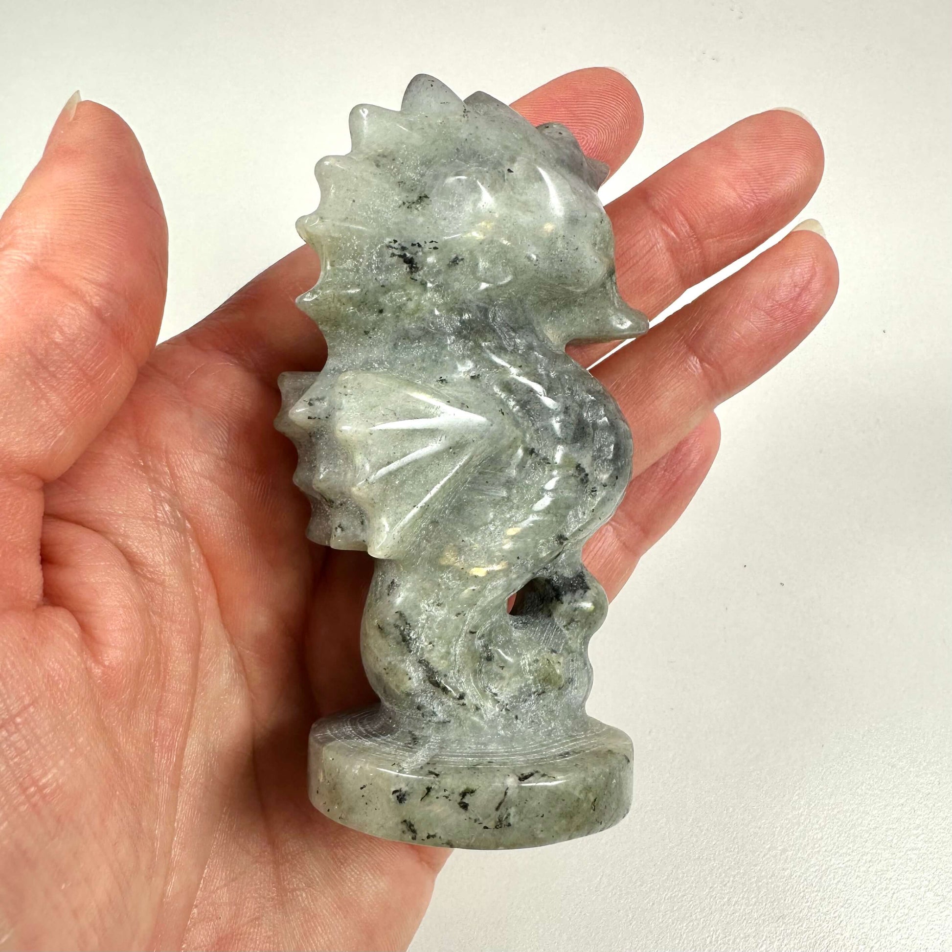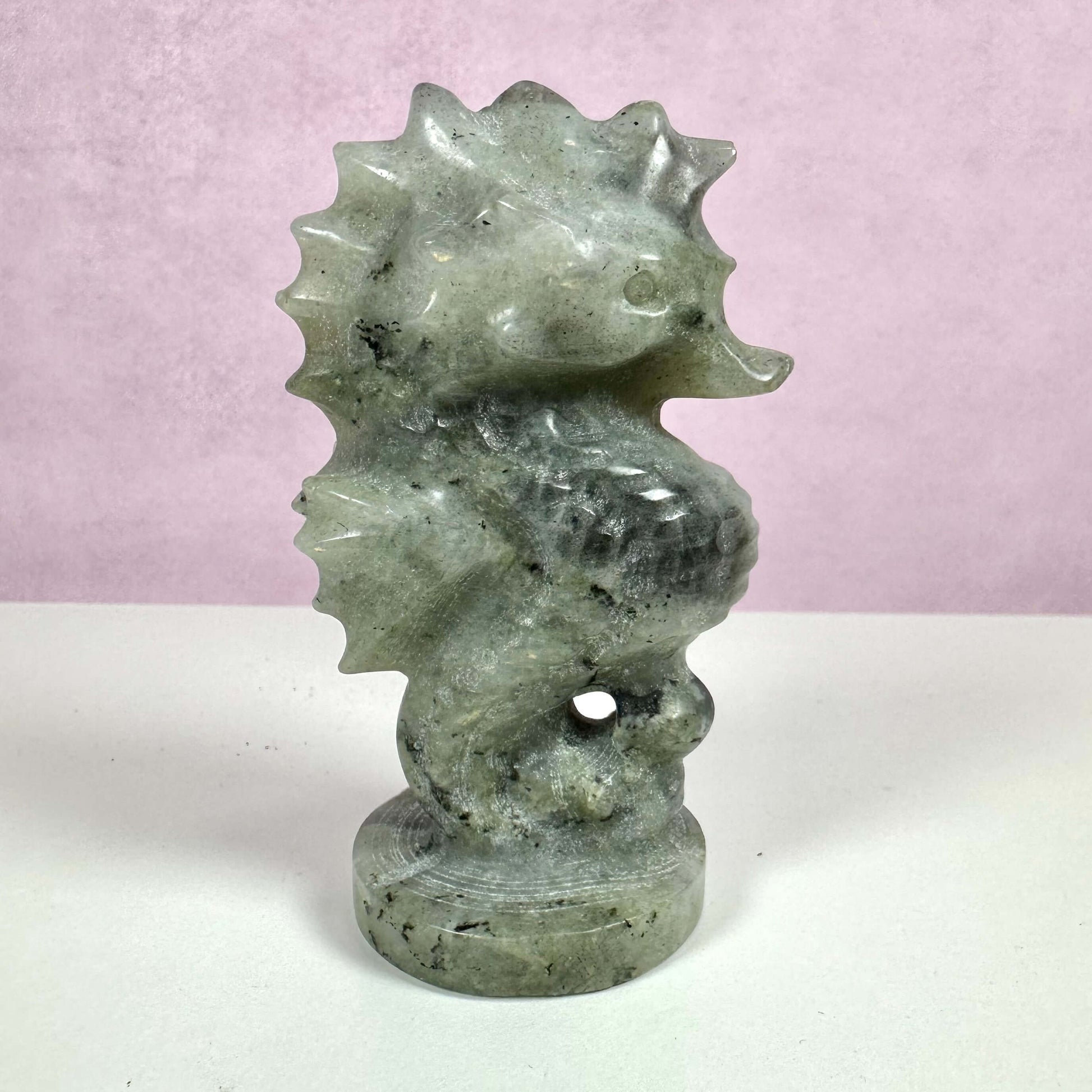 Håndskåret labradorit søhest reflekterer lyset svagt i et unikt farvespil og tilføjer elegance til din indretning.