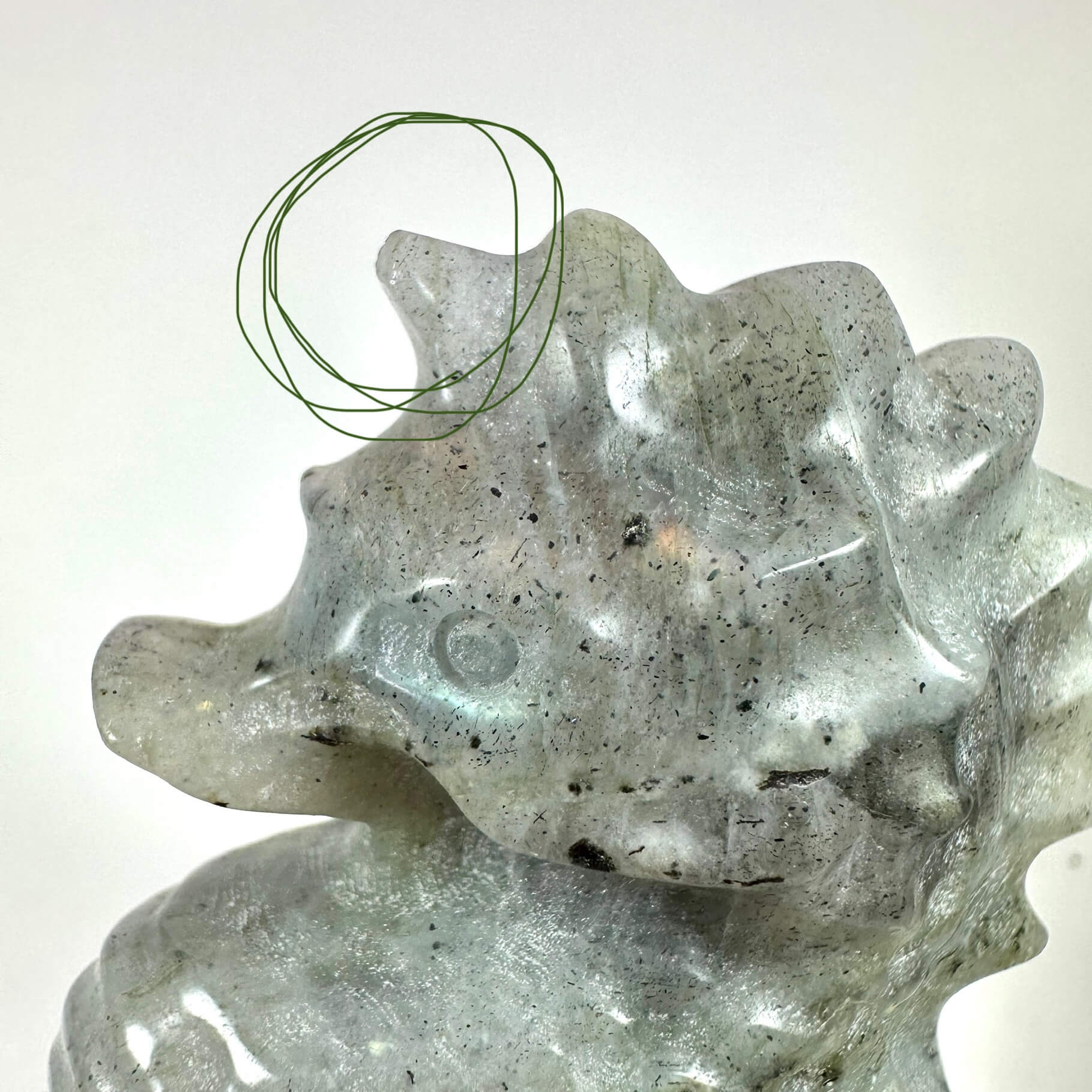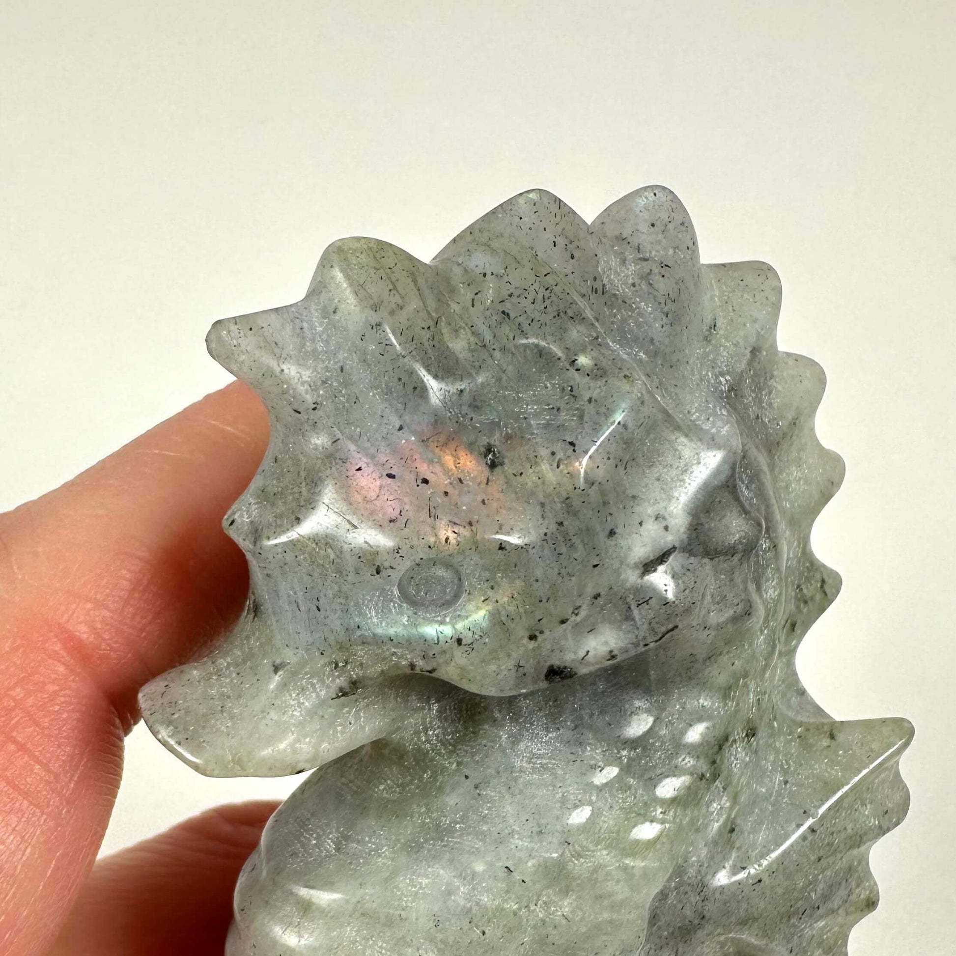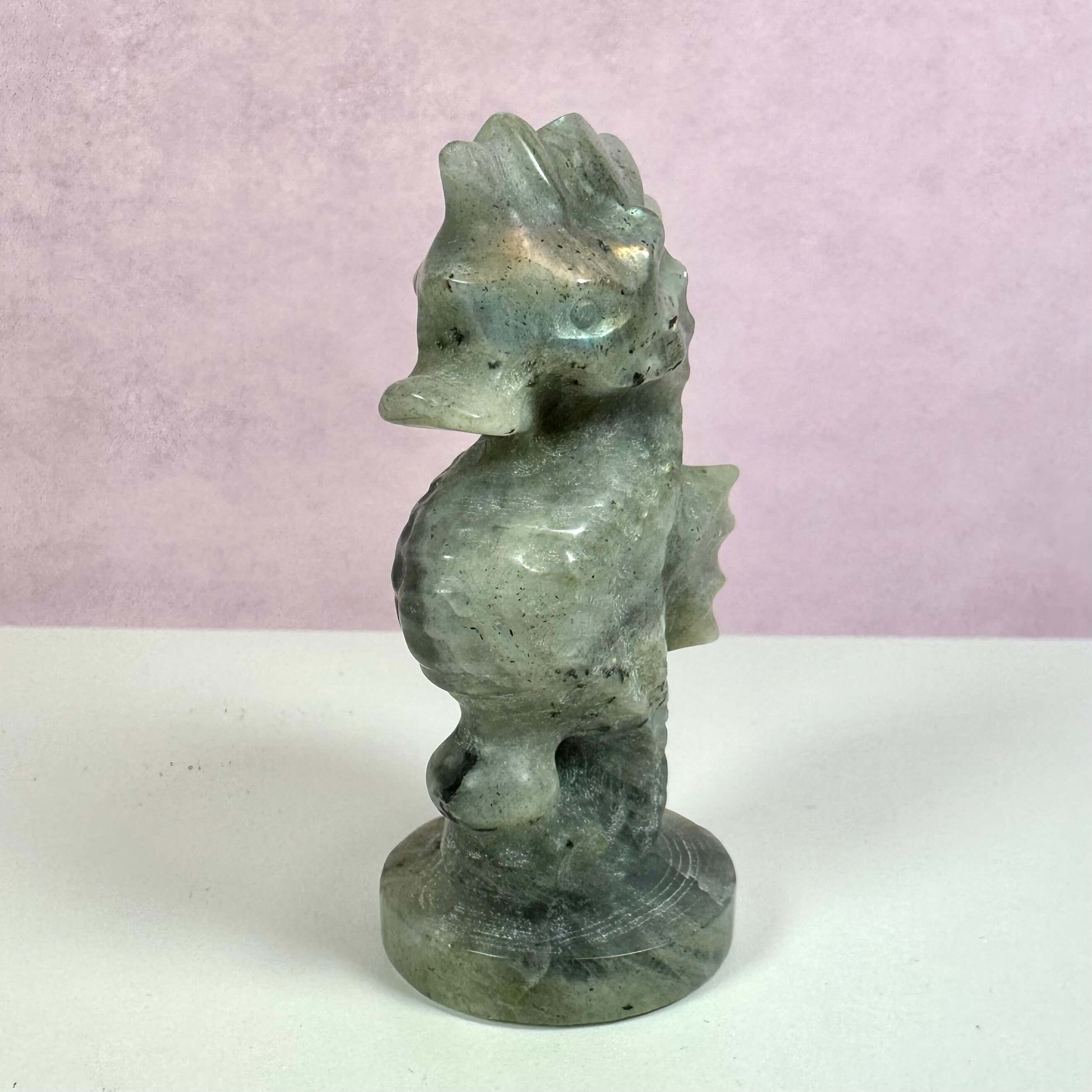 Håndskåret labradorit søhest reflekterer lyset svagt i et unikt farvespil og tilføjer elegance til din indretning.