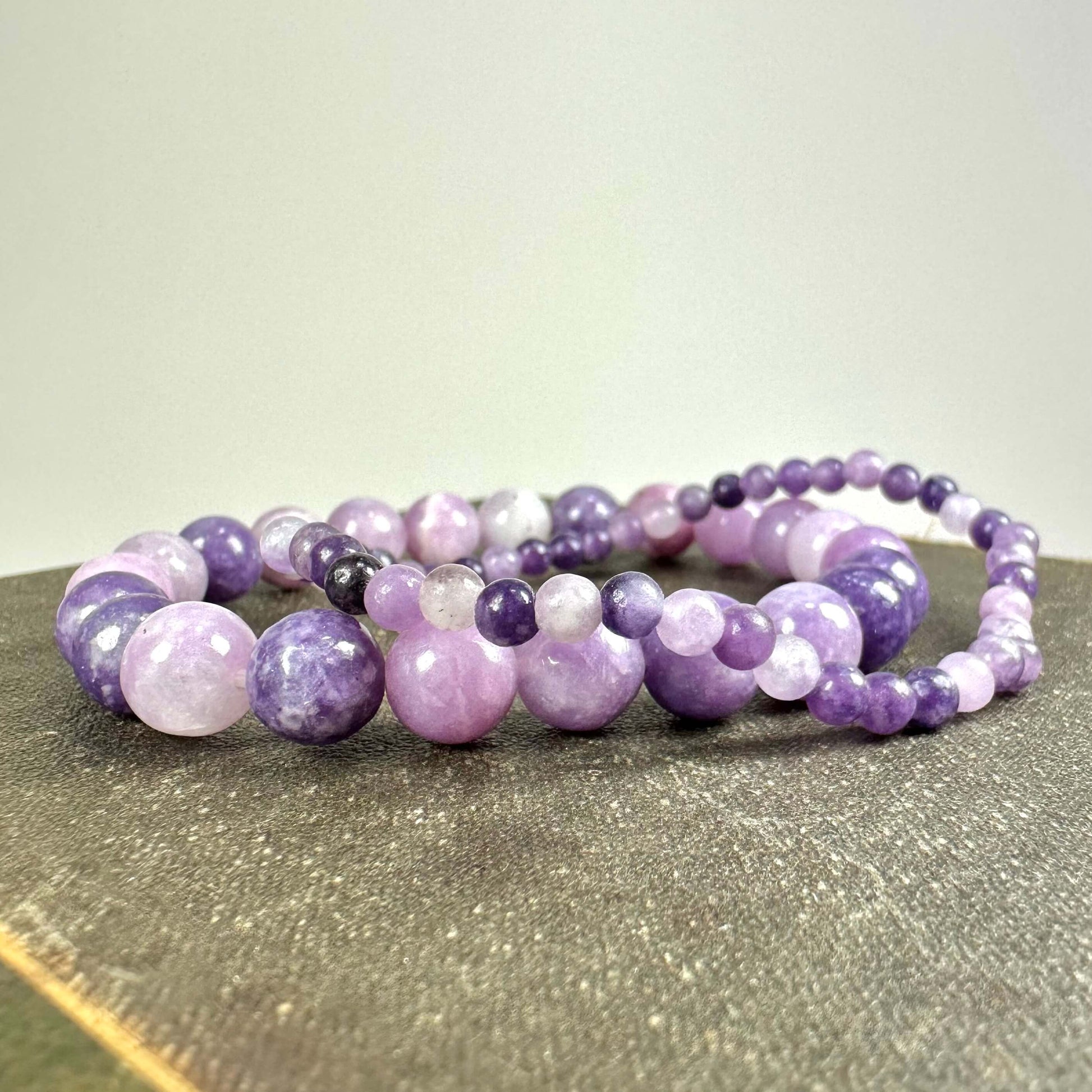 Selvom lepidolit typisk findes i forskellige lilla nuancer, kan den også vise sig i farver som lyserød, grå og hvid, afhængigt af indholdet af mineraler som mangan. Armbånd findes i forskellige perlestørrelser som 4mm, 8mm, og 10mm, der hver giver en forskellig æstetisk og energimæssig oplevelse.