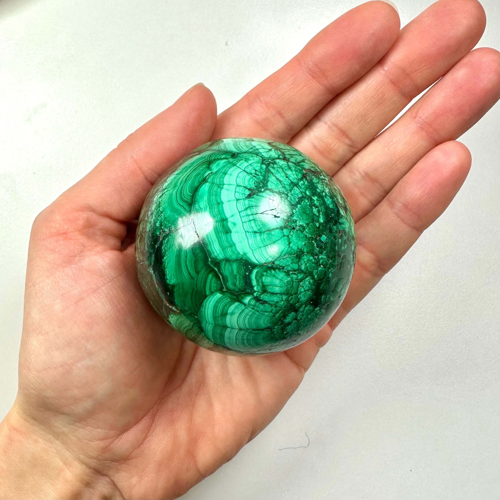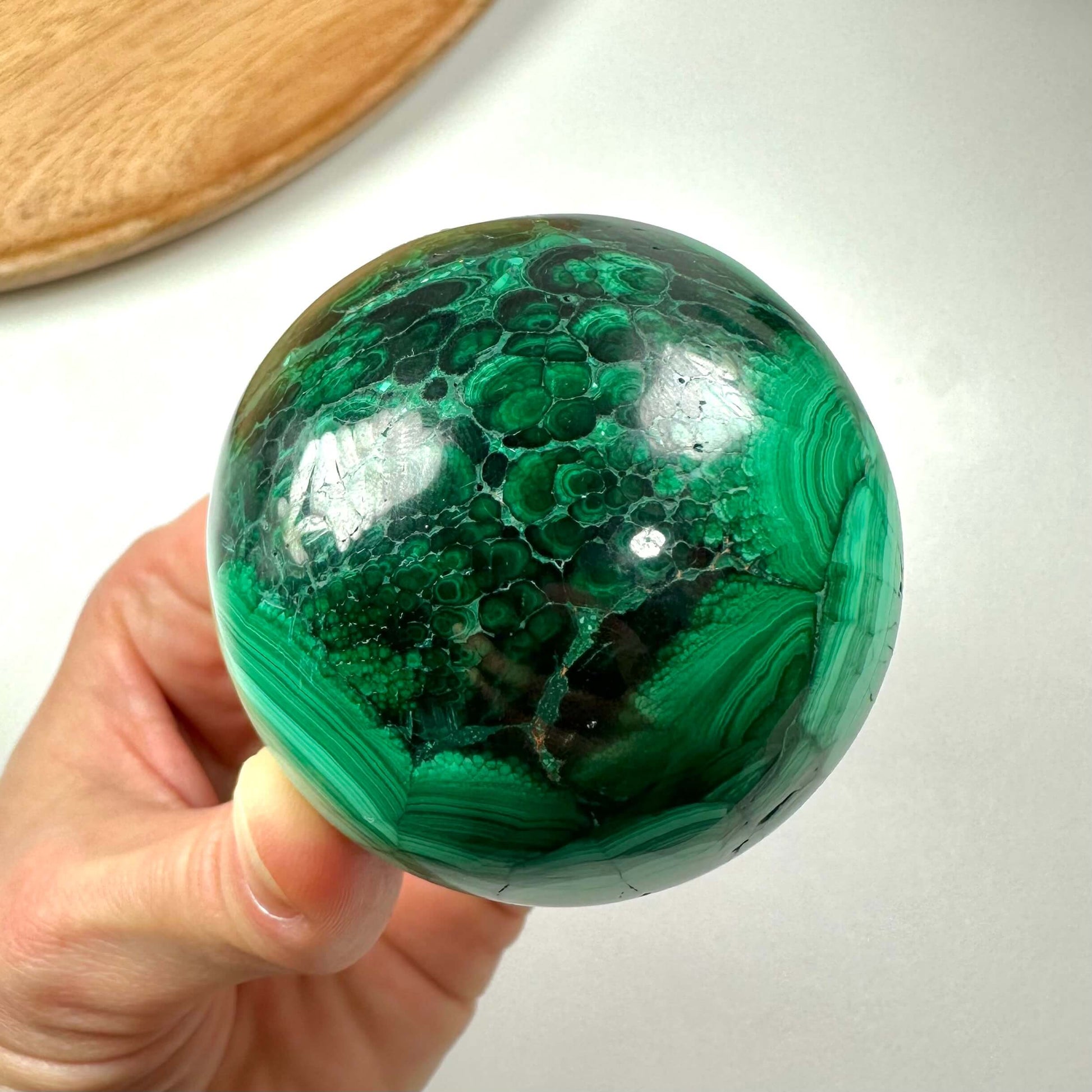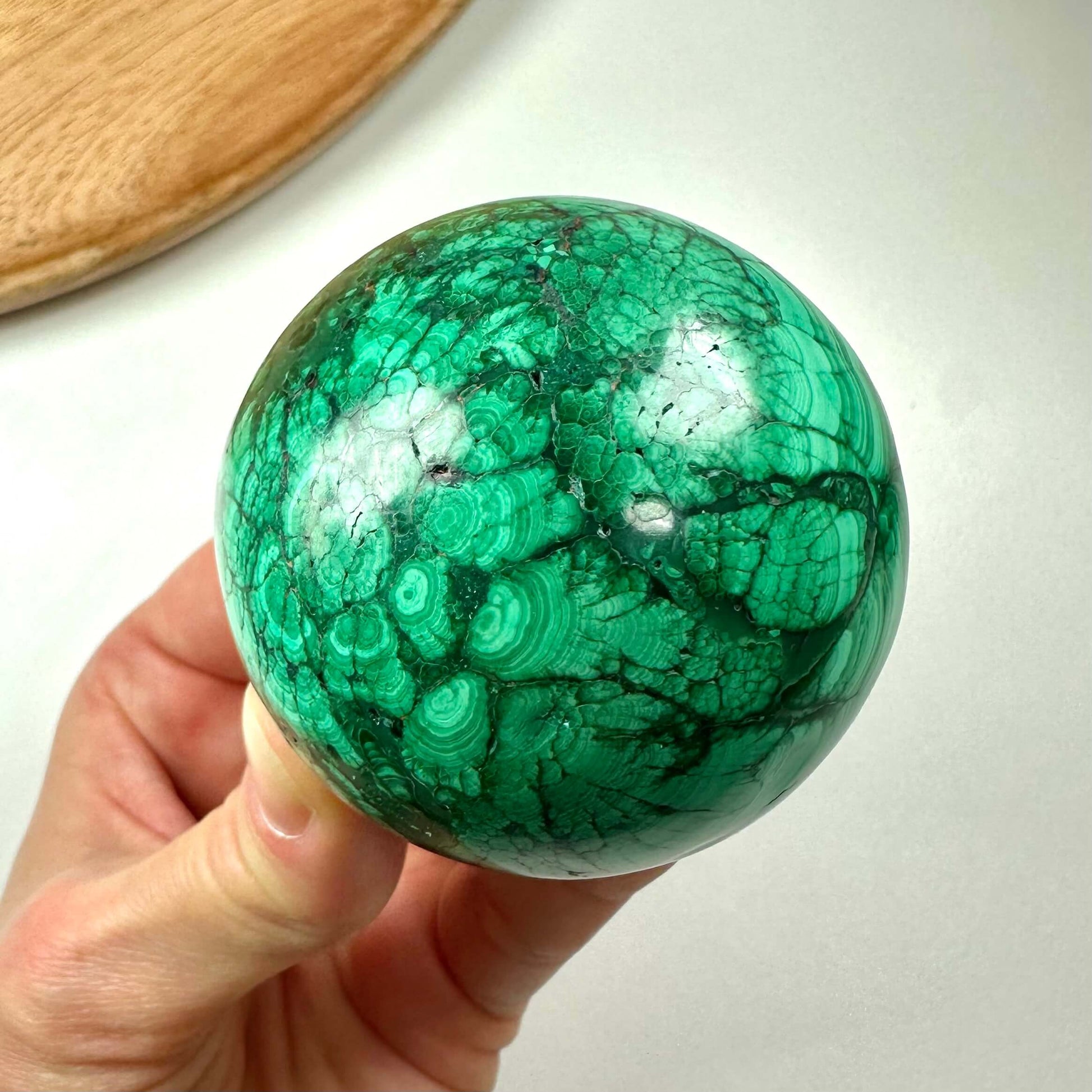 Malakit kuglen kombinerer smukke grønne mønstre med en beroligende energi, der understøtter meditation, følelsesmæssig balance og personlig udvikling.