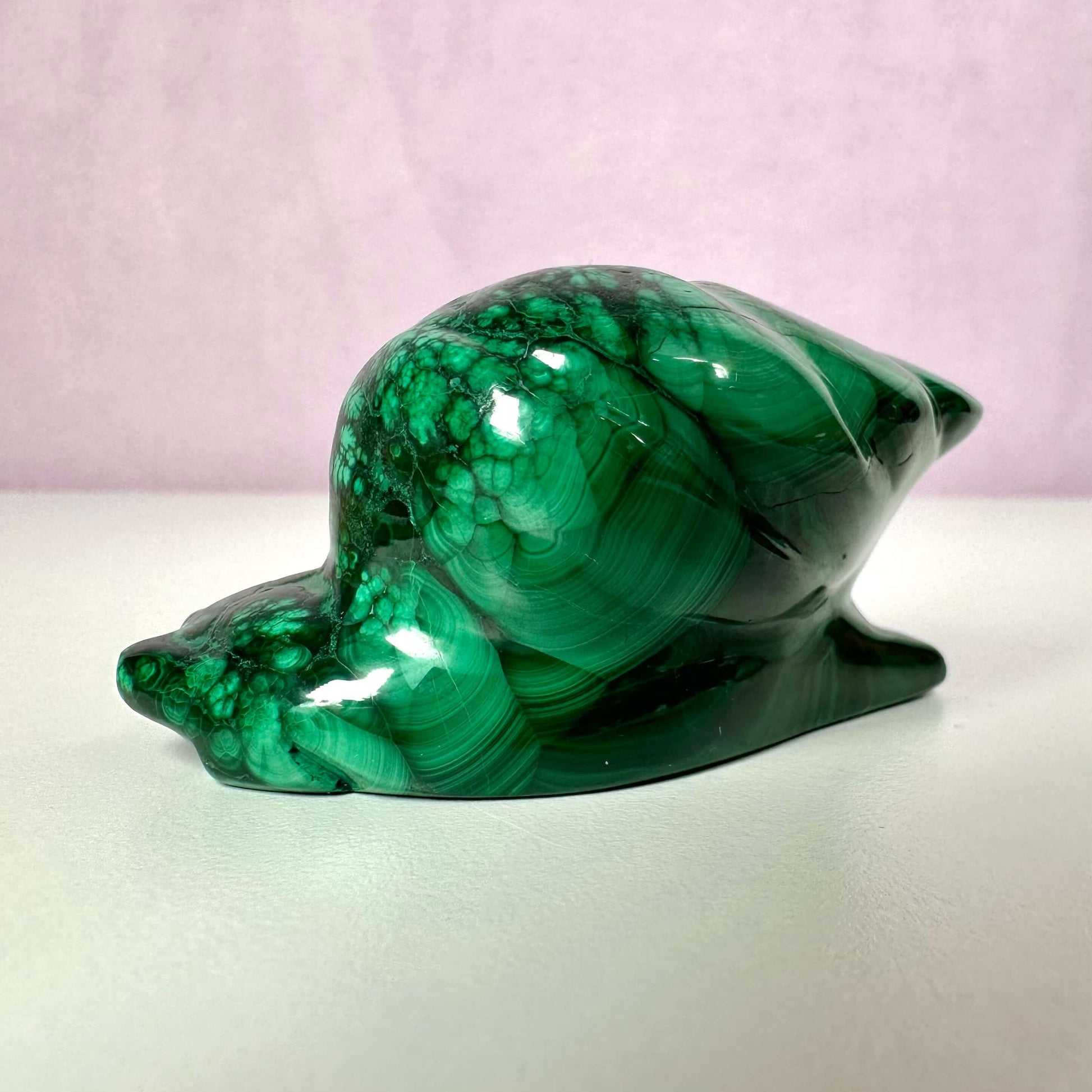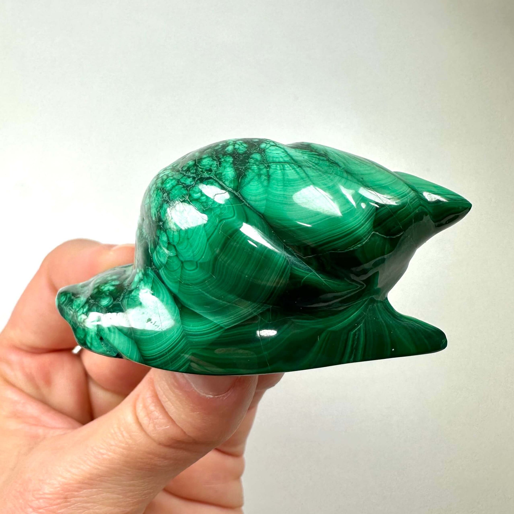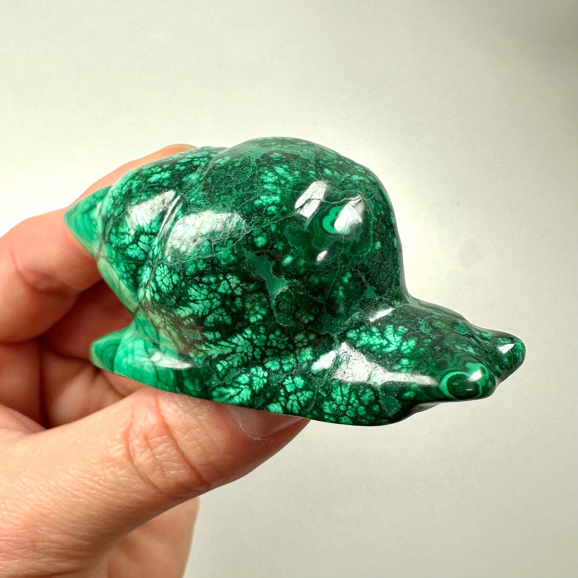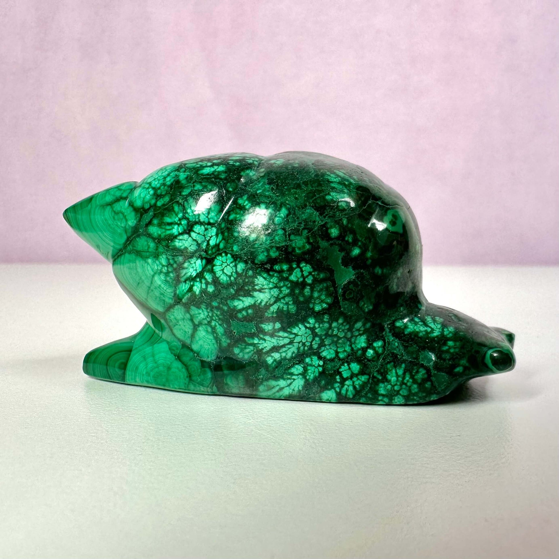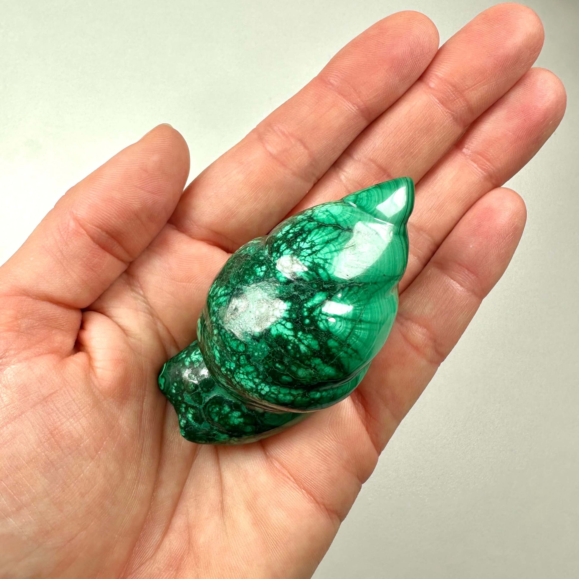 Malakit sneglen kombinerer det levende grønne mønster med sneglens symbolik og skaber et smukt redskab til følelsesmæssig heling og vækst.