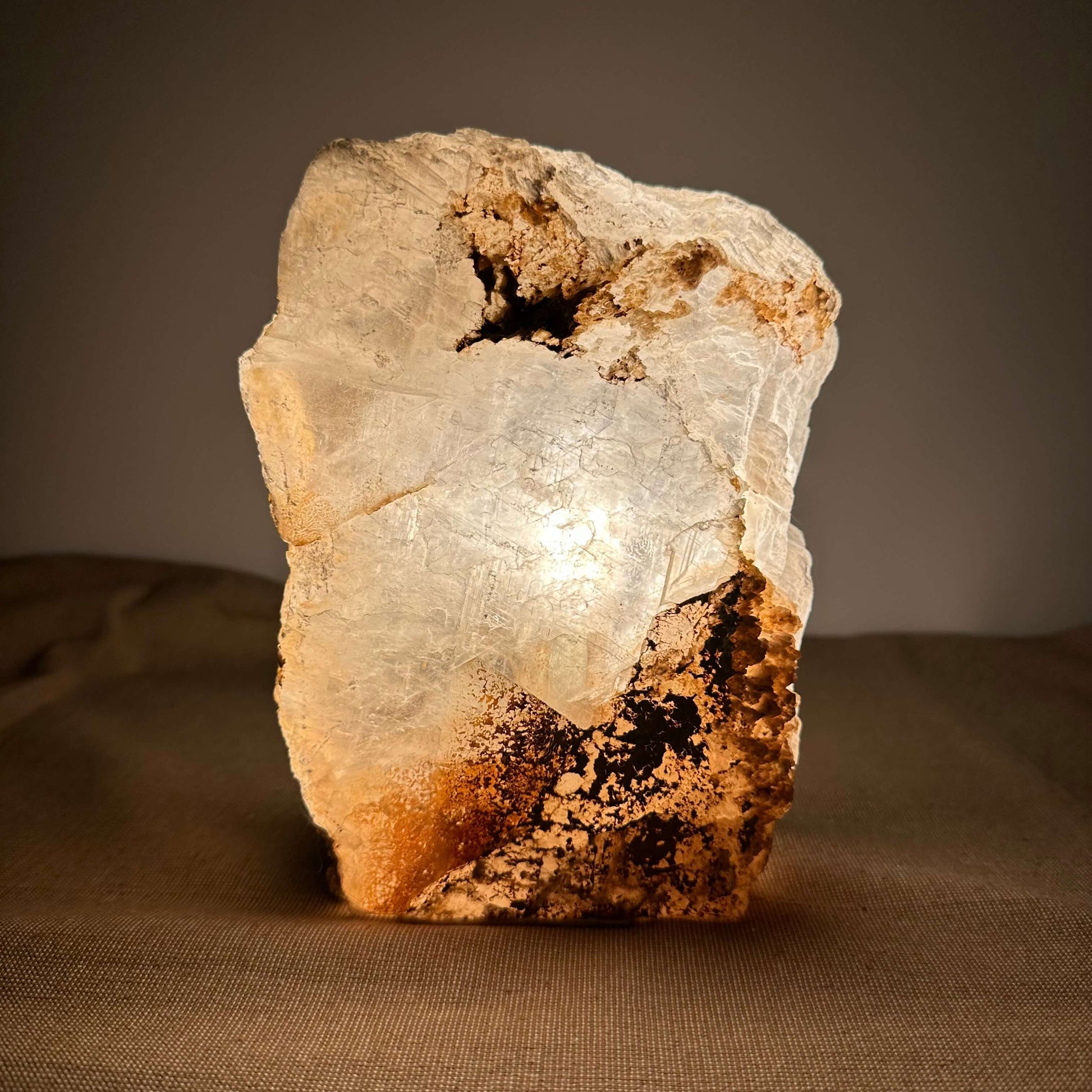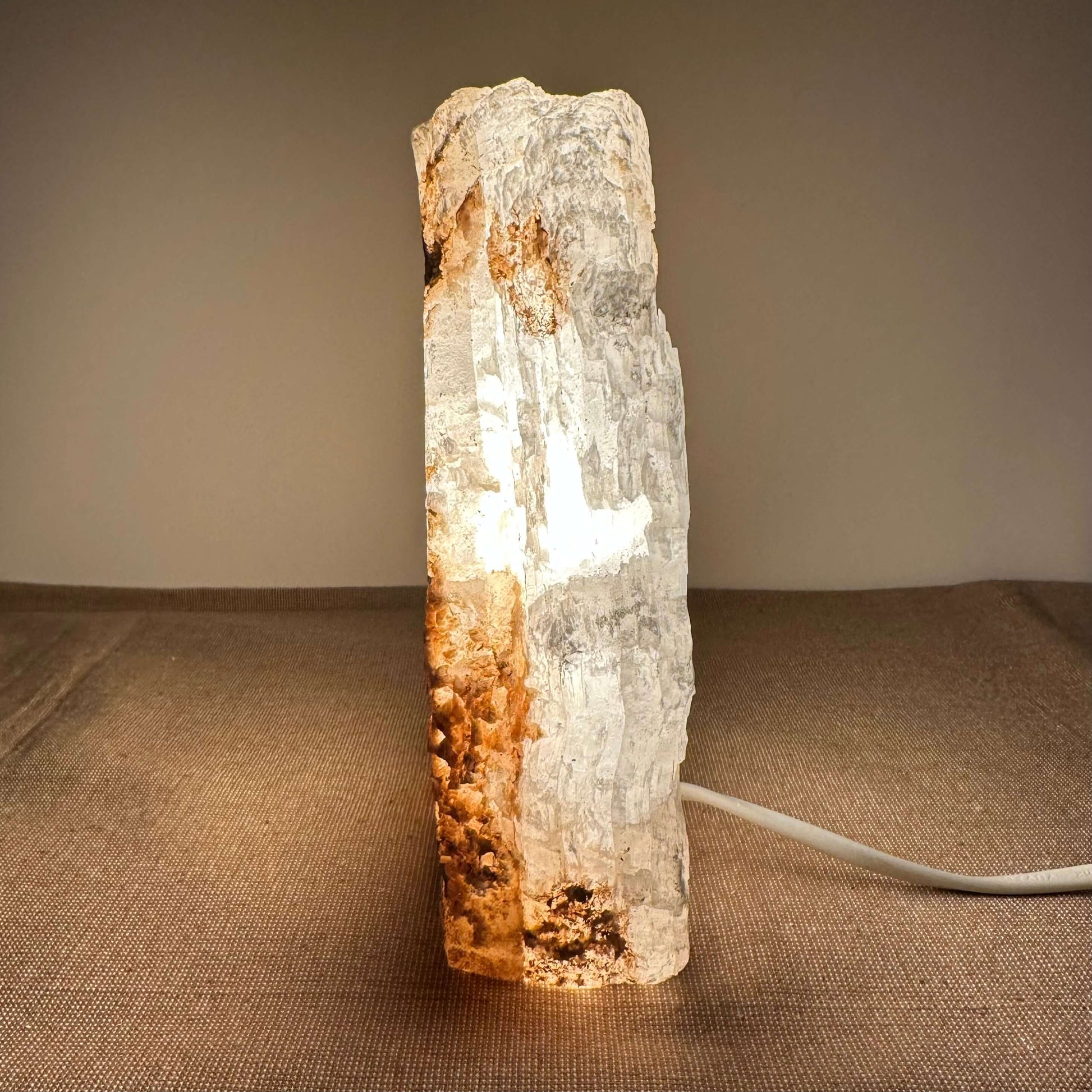 Selenit er en gipsbaseret krystal, der ofte findes i hvide eller gennemsigtige nuancer med en silkeblød glans. Dens navn stammer fra den græske månegudinde Selene, hvilket afspejler krystallens beroligende og lysende egenskaber. Selenit symboliserer rensning, spirituel forbindelse og mental klarhed. Som lampe intensiverer selenit sin evne til at rense energifelter og fremme en harmonisk atmosfære i hjemmet.