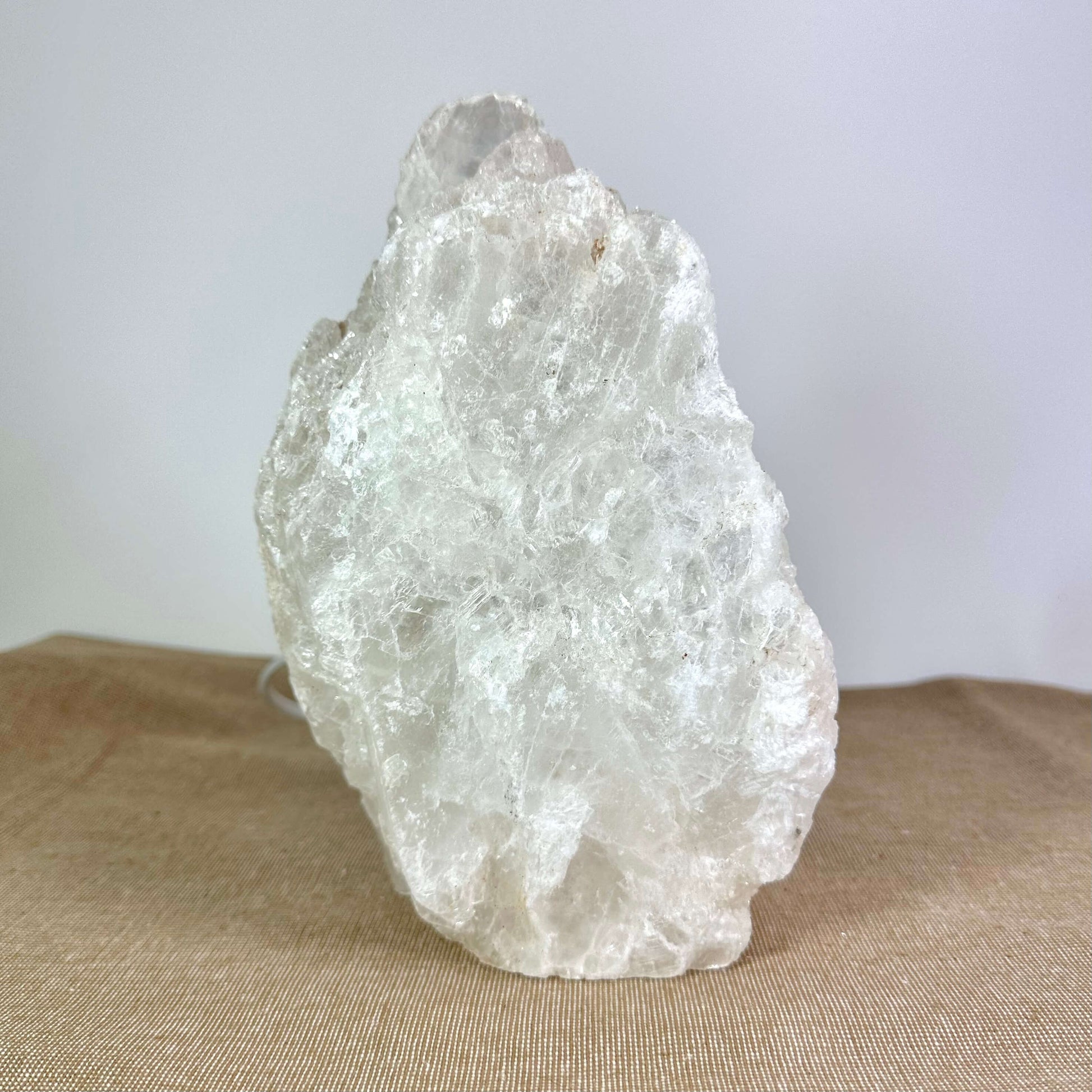 Selenit er en gipsbaseret krystal, der ofte findes i hvide eller gennemsigtige nuancer med en silkeblød overflade. Navnet selenit stammer fra den græske månegudinde Selene, hvilket afspejler krystallens blide energi og måneagtige glans. Denne krystal symboliserer rensning, åndelig forbindelse og harmoni. Selenit bruges ofte i energiarbejde for at rense rum, fremme klarhed og styrke intuitionen. Når den bruges som lampe, intensiverer den sin energi og skaber en beroligende atmosfære i hele rummet.