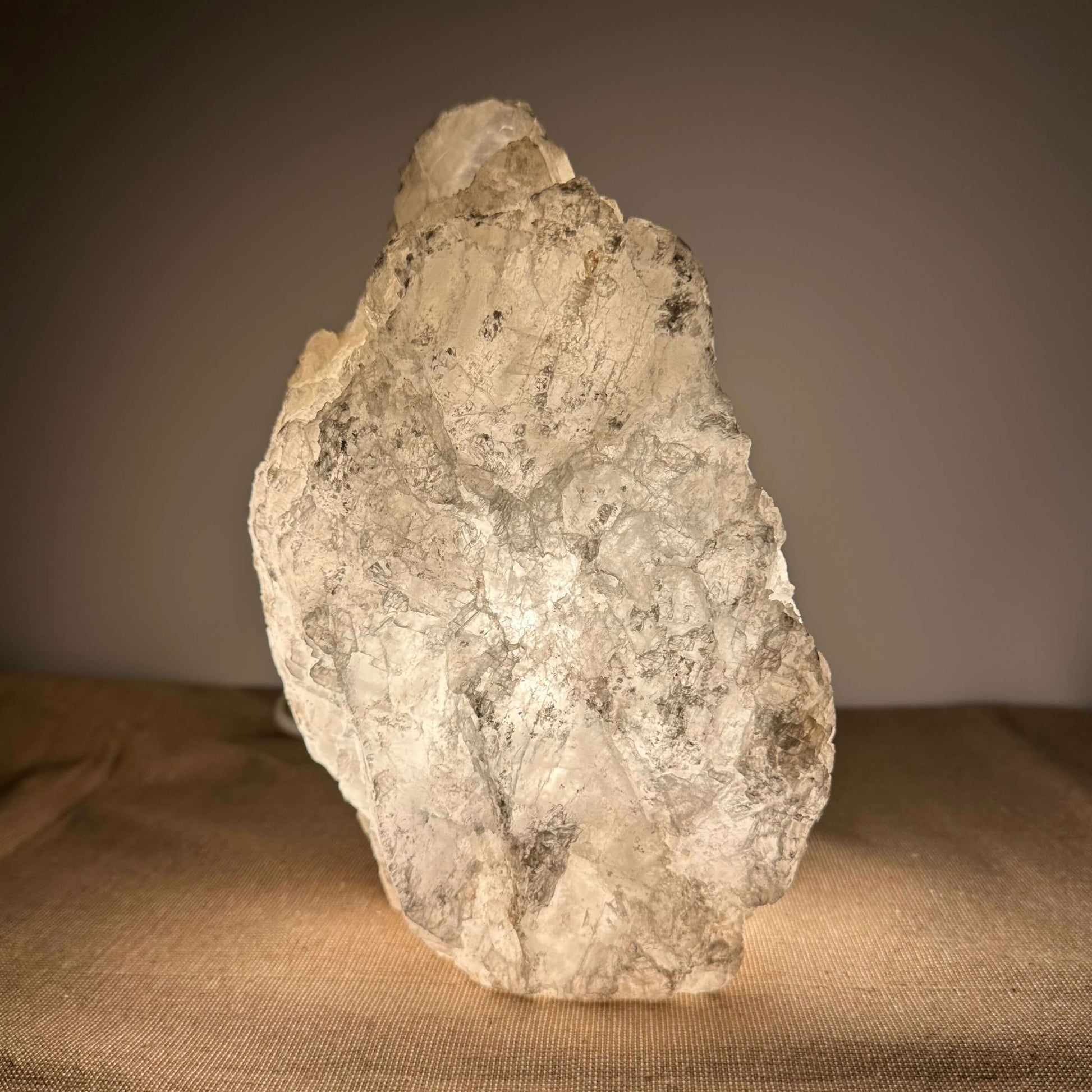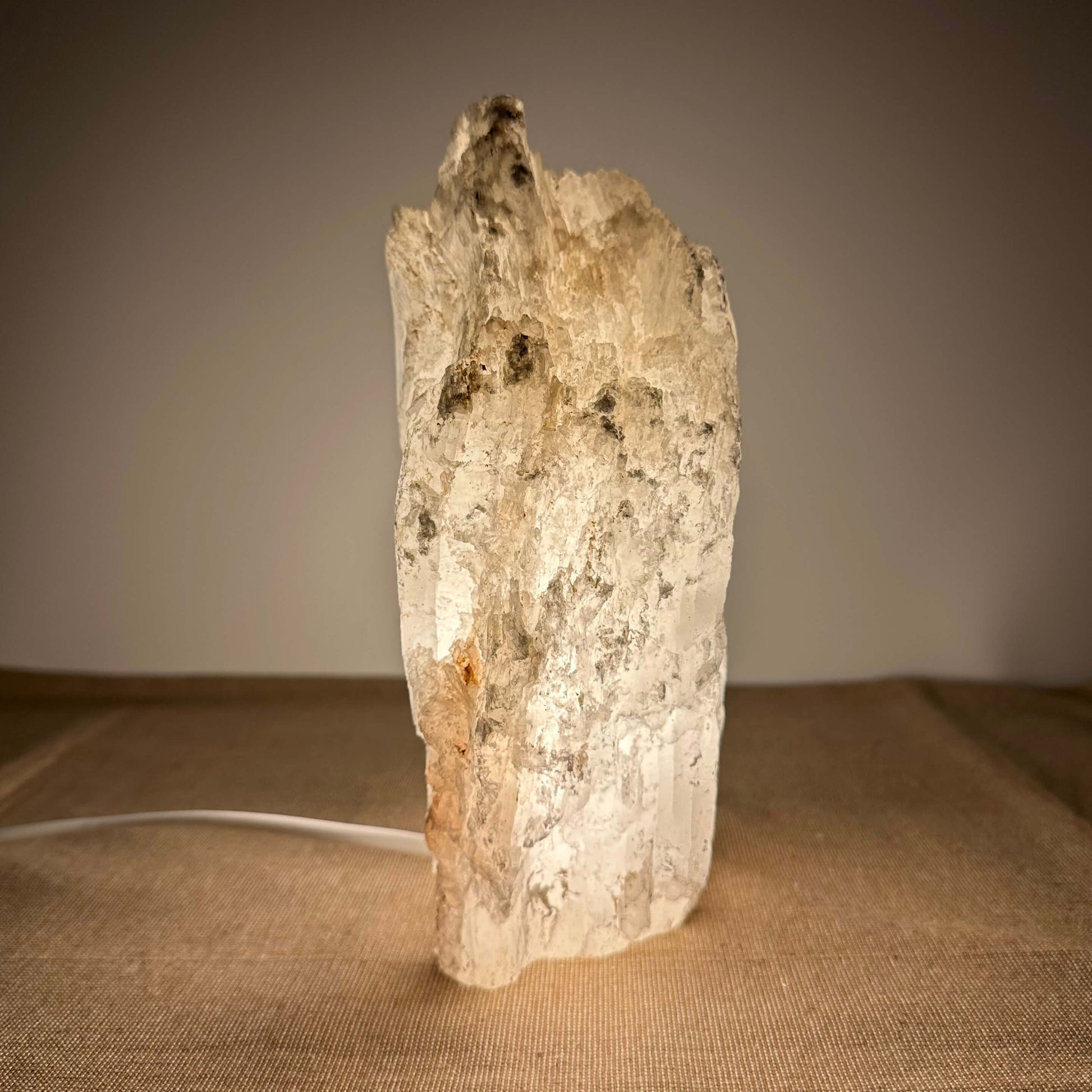 FÉ Luminous præsenterer en unik kollektion af håndskårne lamper fremstillet af sjældne selenitkrystaller fra Mexico. Lamperne kombinerer naturlig skønhed med elegant belysning, der skaber en beroligende og stemningsfuld atmosfære i ethvert rum. Med en neutral farvepalet og et organisk design, passer de tidløse lamper perfekt ind i alle typer interiør, og tilføjer både stil og ro. Hver bordlampe er udstyret med en roterende dæmpningskontakt, som giver mulighed for at justere lysintensiteten og skabe den ønskede stemning. LED-pæren er energieffektiv og dæmpbar (3W - 300 lumen), og hele lampens opbygning er i overensstemmelse med de gældende tekniske standarder for design, produktion og funktionalitet. FÈ Luminous er inspireret af naturens organiske former og skaber unikke, ikke-gentagelige stykker med karakter, der bringer naturen ind i dit hjem. Maria glas - også kendt som mariaglas eller marienglas selenit - er et mineral af calcium sulfat, der er dannet i Mexico gennem millioner af år i klare, delikate lagdelte krystaller.