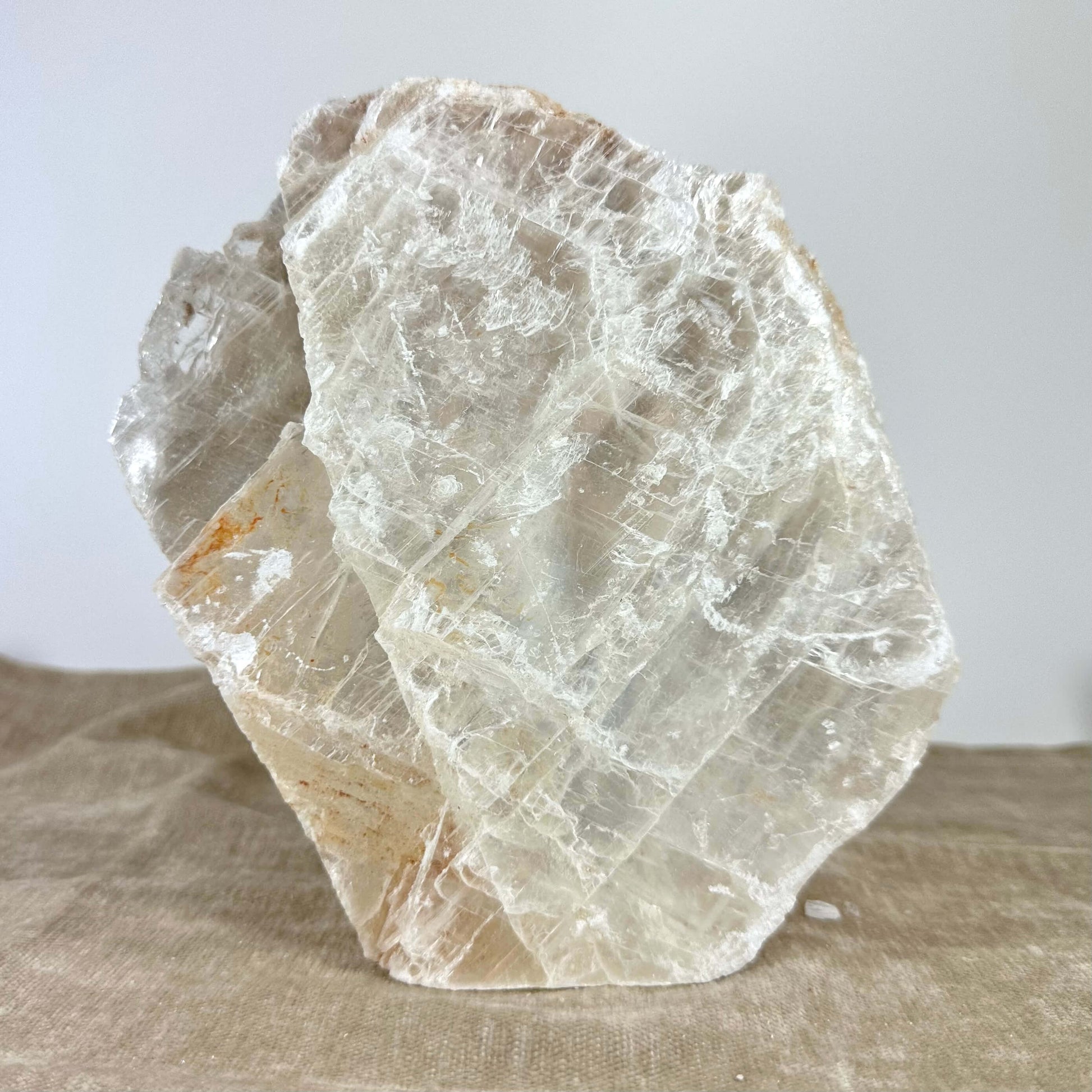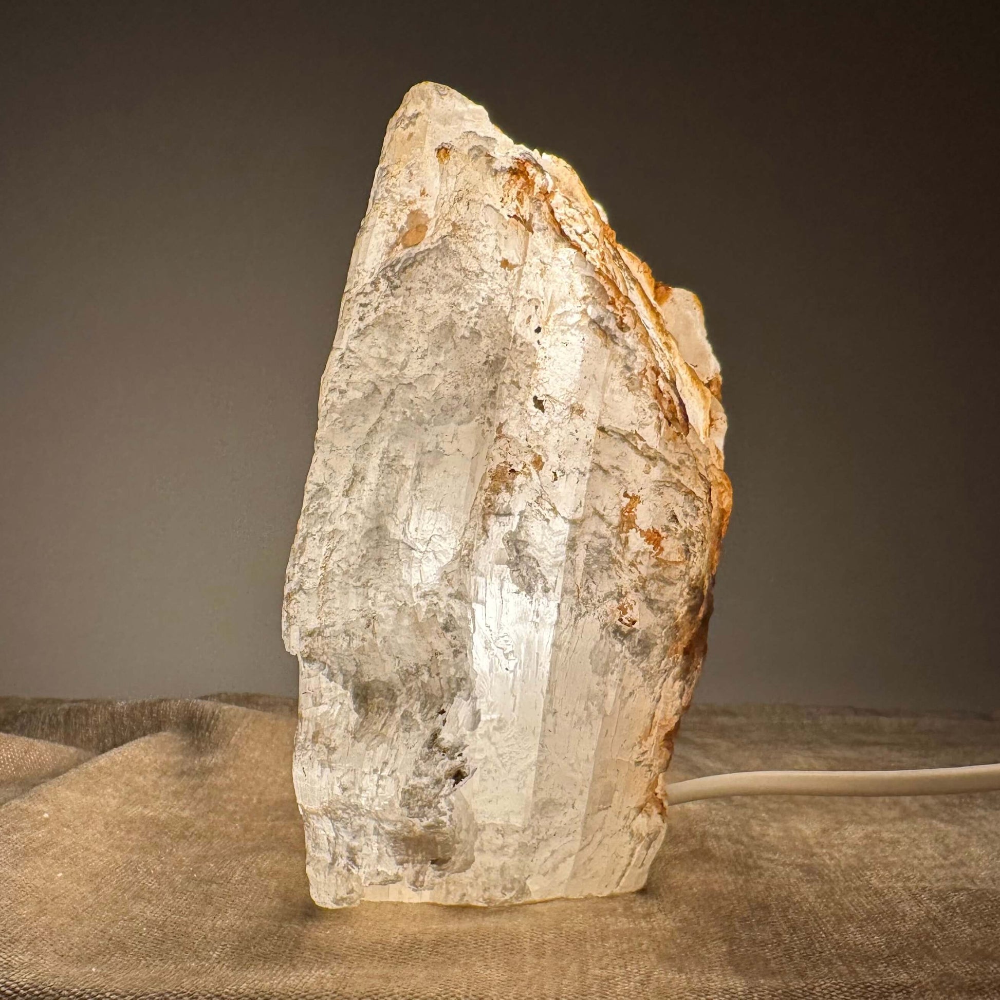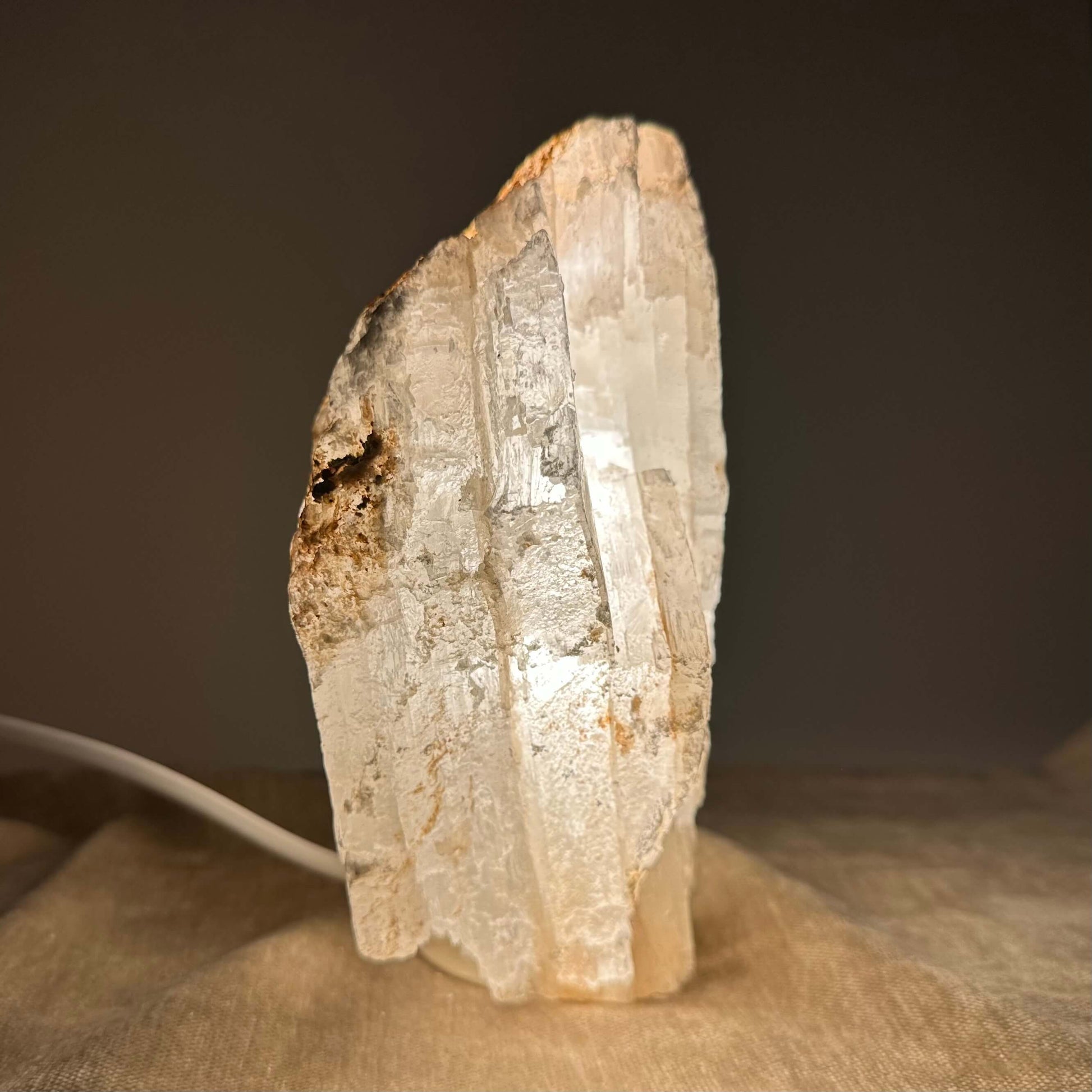 Selenit er en gipsbaseret krystal, der ofte findes i hvide eller gennemsigtige nuancer med en silkeblød overflade. Navnet selenit stammer fra den græske månegudinde Selene, hvilket afspejler krystallens blide energi og måneagtige glans. Denne krystal symboliserer rensning, åndelig forbindelse og harmoni. Selenit bruges ofte i energiarbejde for at rense rum, fremme klarhed og styrke intuitionen. Når den bruges som lampe, intensiverer den sin energi og skaber en beroligende atmosfære i hele rummet.