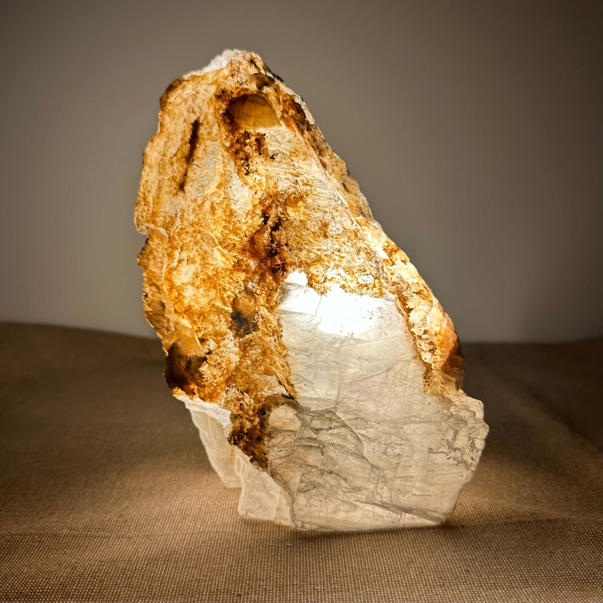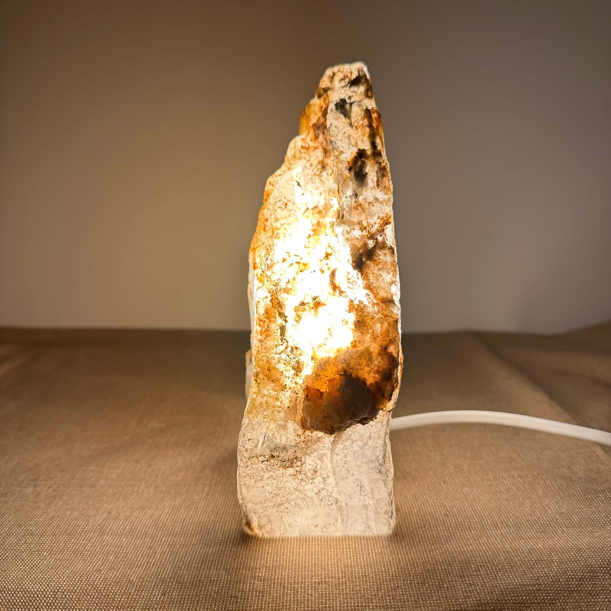 FÉ Luminous præsenterer en unik kollektion af håndskårne lamper fremstillet af sjældne selenitkrystaller fra Mexico. Lamperne kombinerer naturlig skønhed med elegant belysning, der skaber en beroligende og stemningsfuld atmosfære i ethvert rum. Med en neutral farvepalet og et organisk design, passer de tidløse lamper perfekt ind i alle typer interiør, og tilføjer både stil og ro. Hver bordlampe er udstyret med en roterende dæmpningskontakt, som giver mulighed for at justere lysintensiteten og skabe den ønskede stemning. LED-pæren er energieffektiv og dæmpbar (3W - 300 lumen), og hele lampens opbygning er i overensstemmelse med de gældende tekniske standarder for design, produktion og funktionalitet. FÈ Luminous er inspireret af naturens organiske former og skaber unikke, ikke-gentagelige stykker med karakter, der bringer naturen ind i dit hjem. Maria glas - også kendt som mariaglas eller marienglas selenit - er et mineral af calcium sulfat, der er dannet i Mexico gennem millioner af år i klare, delikate lagdelte krystaller.
