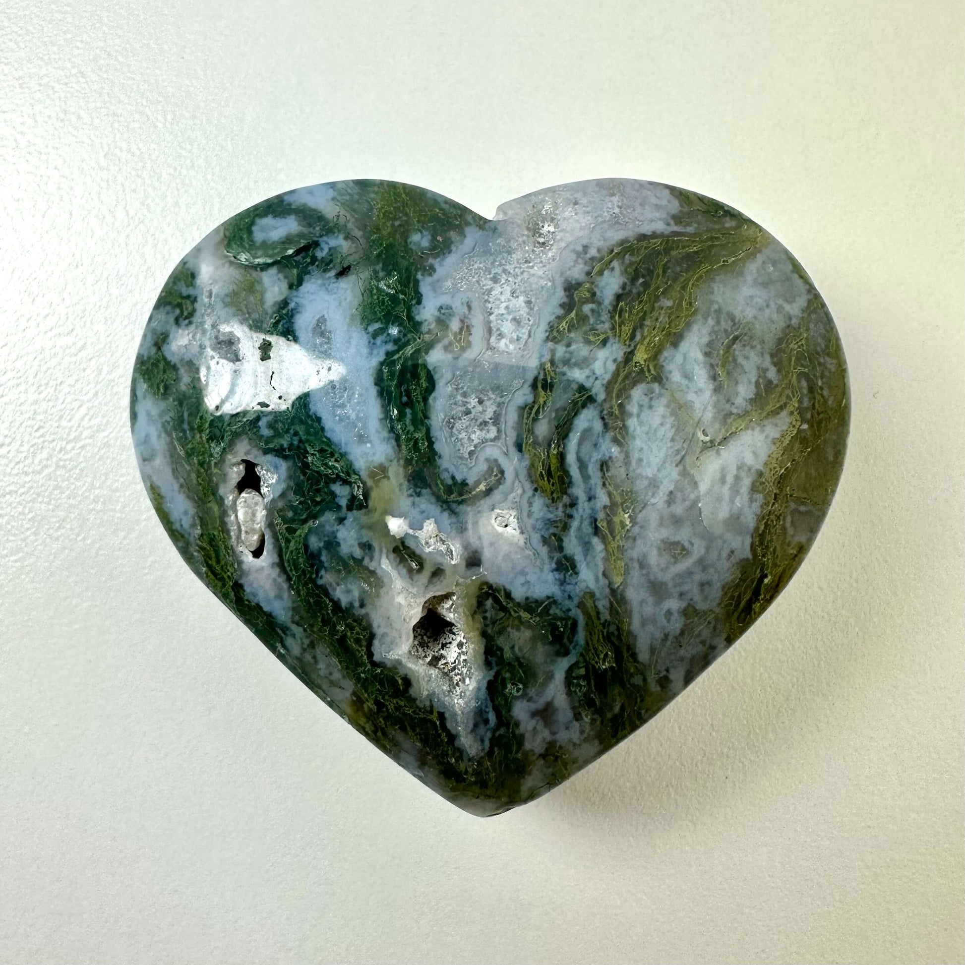 Denne sten er stærkt forbundet med hjertechakraet, som styrer kærlighed, medfølelse og følelsesmæssig balance. Ved at bære eller meditere med mos agat hjerte kan du åbne og styrke forbindelsen til dit hjertechakra.