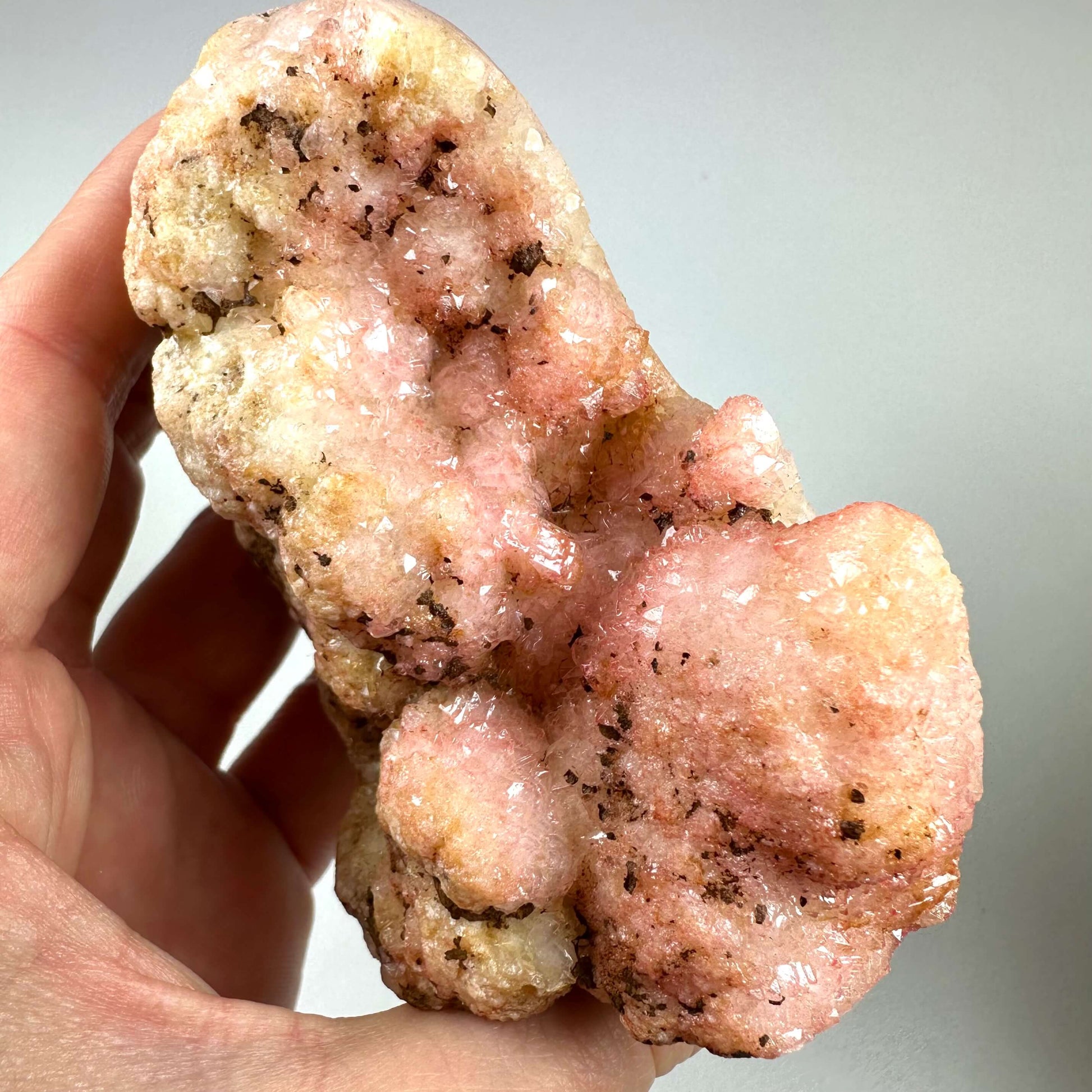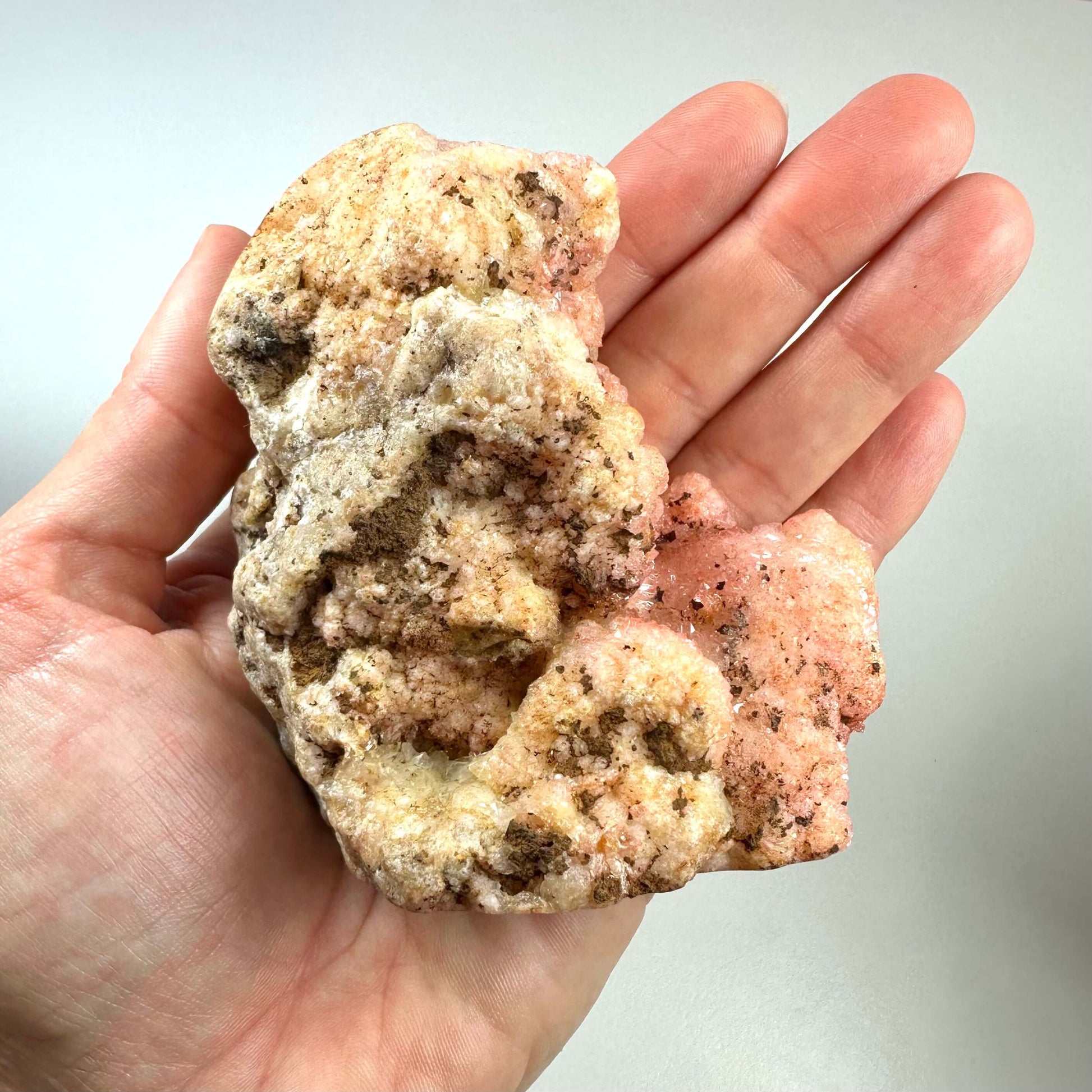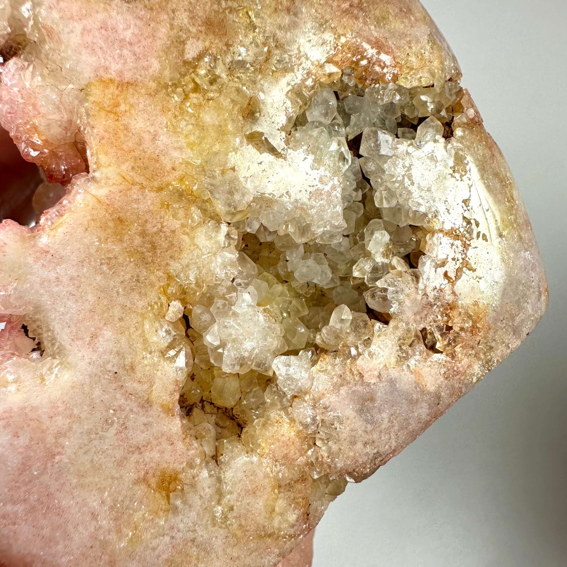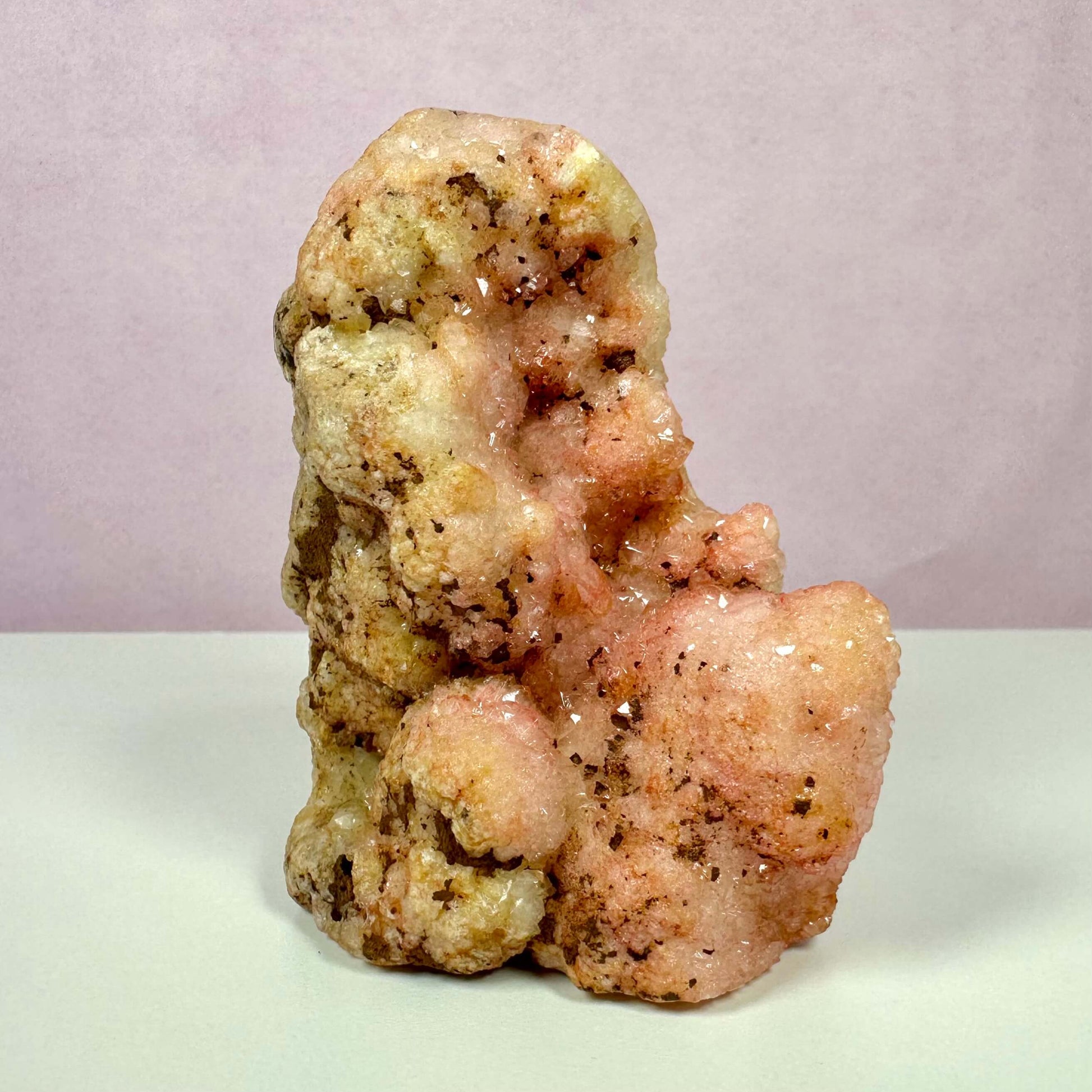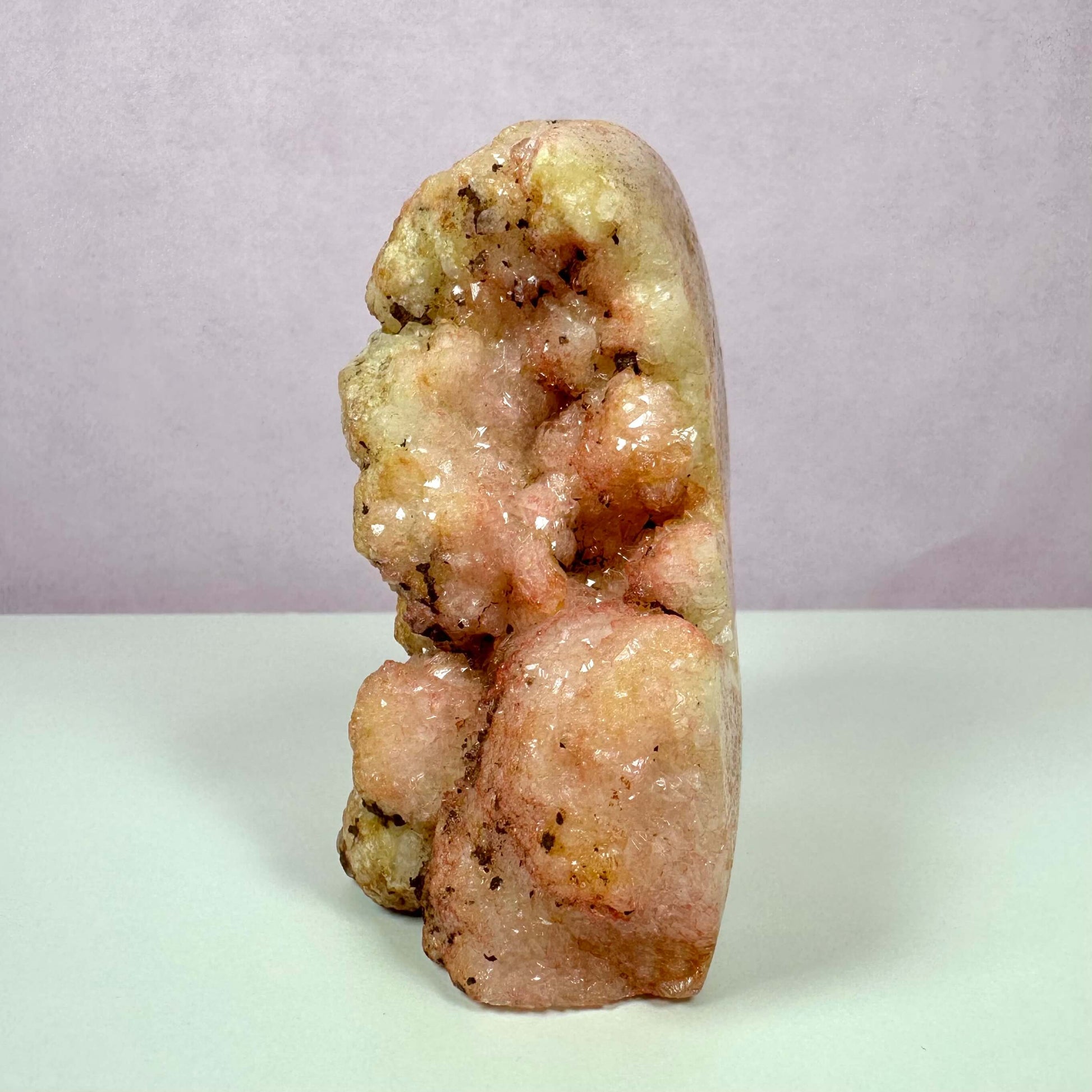 Pink ametyst kan variere i farve fra lyserød til en dybere fersken eller rosa tone, afhængigt af mængden af hæmatitindeslutninger. Hver krystal er unik, med naturlige variationer i inkluderingsmønstre og krystallinske strukturer, hvilket gør dem til én af en slags kunstværker fra naturen.