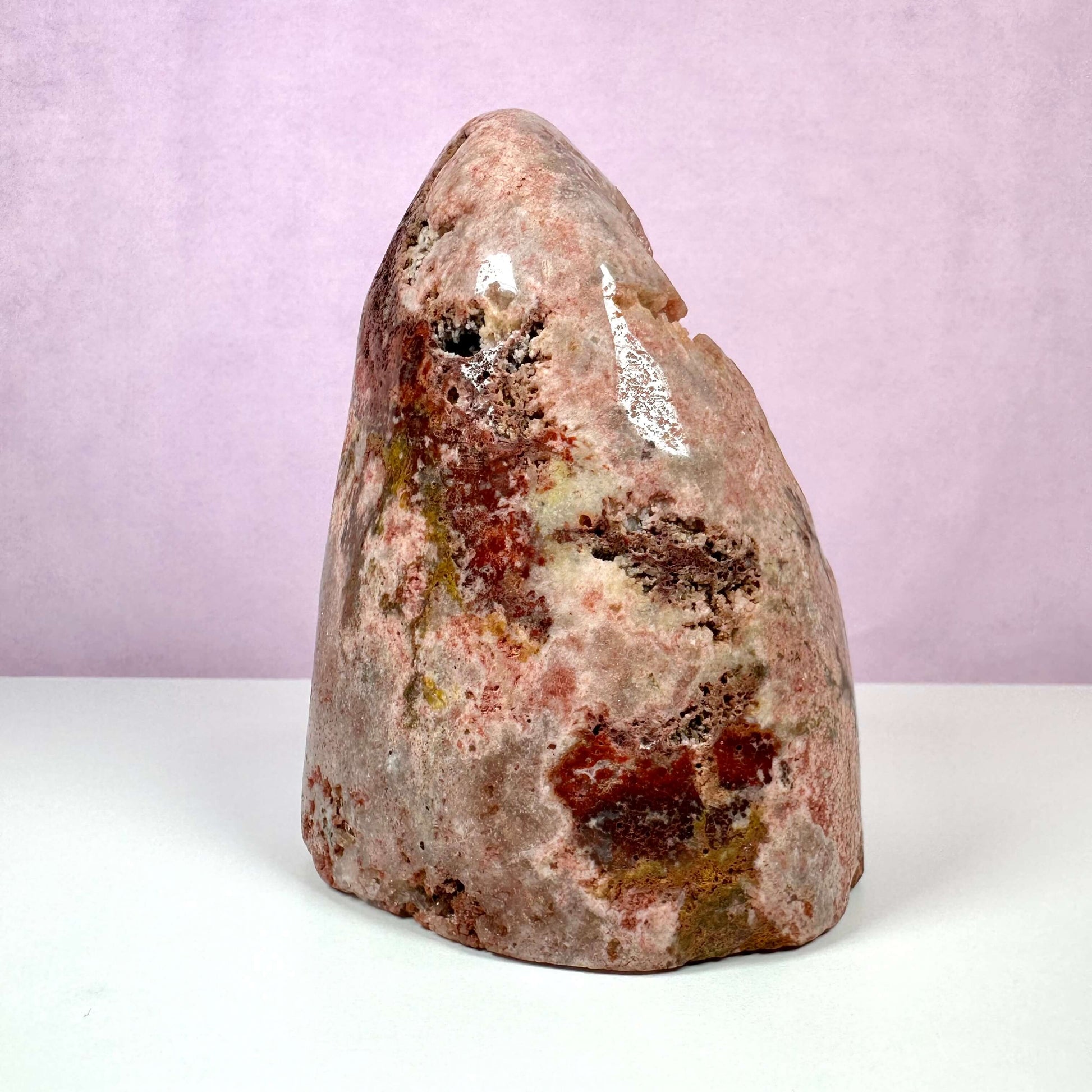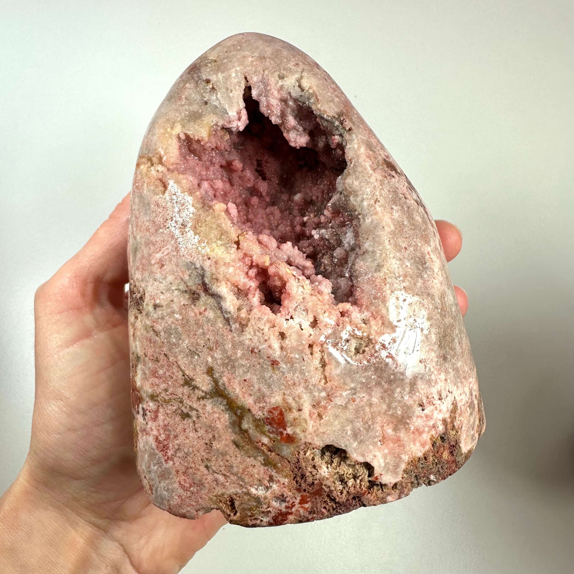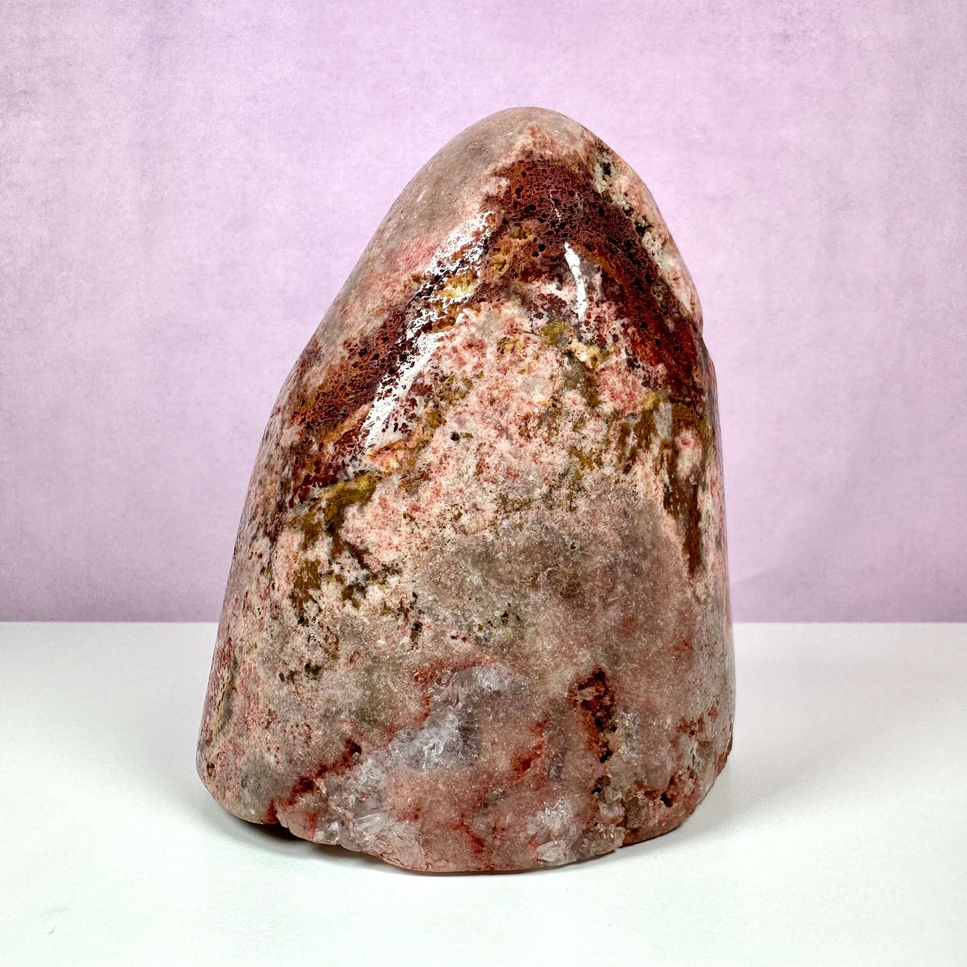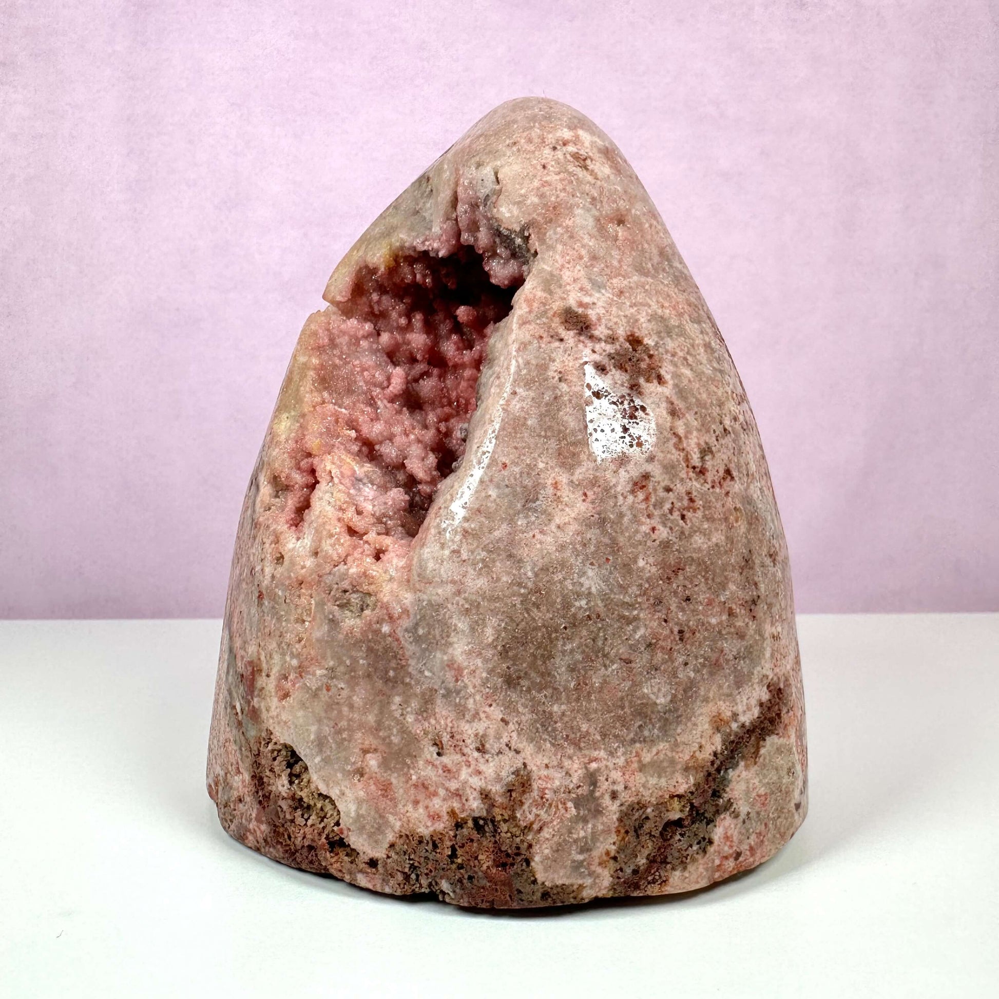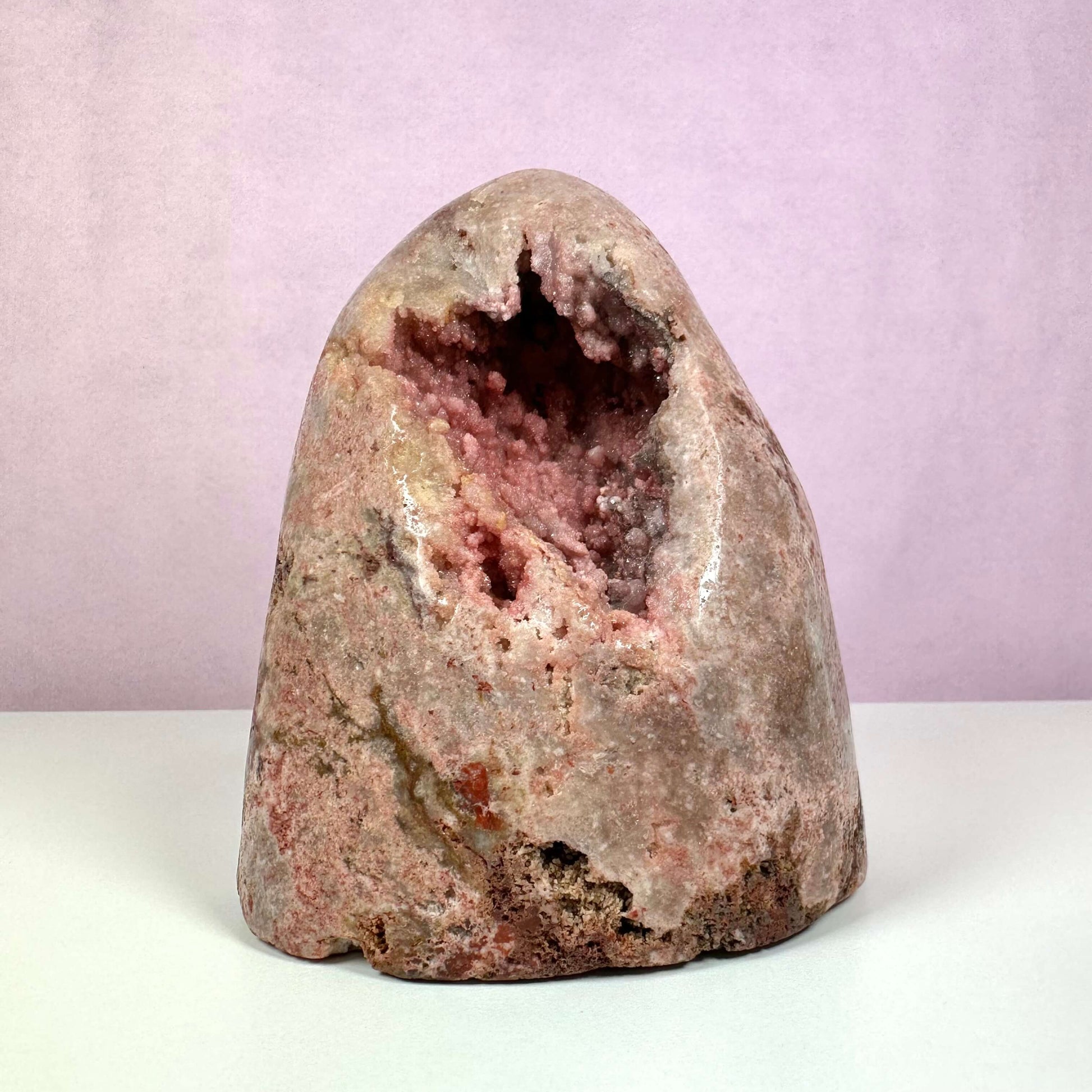 Pink ametyst fra patagonien fremhæver bløde rosa til fersken nuancer og understøtter følelsesmæssig balance og indre vækst.
