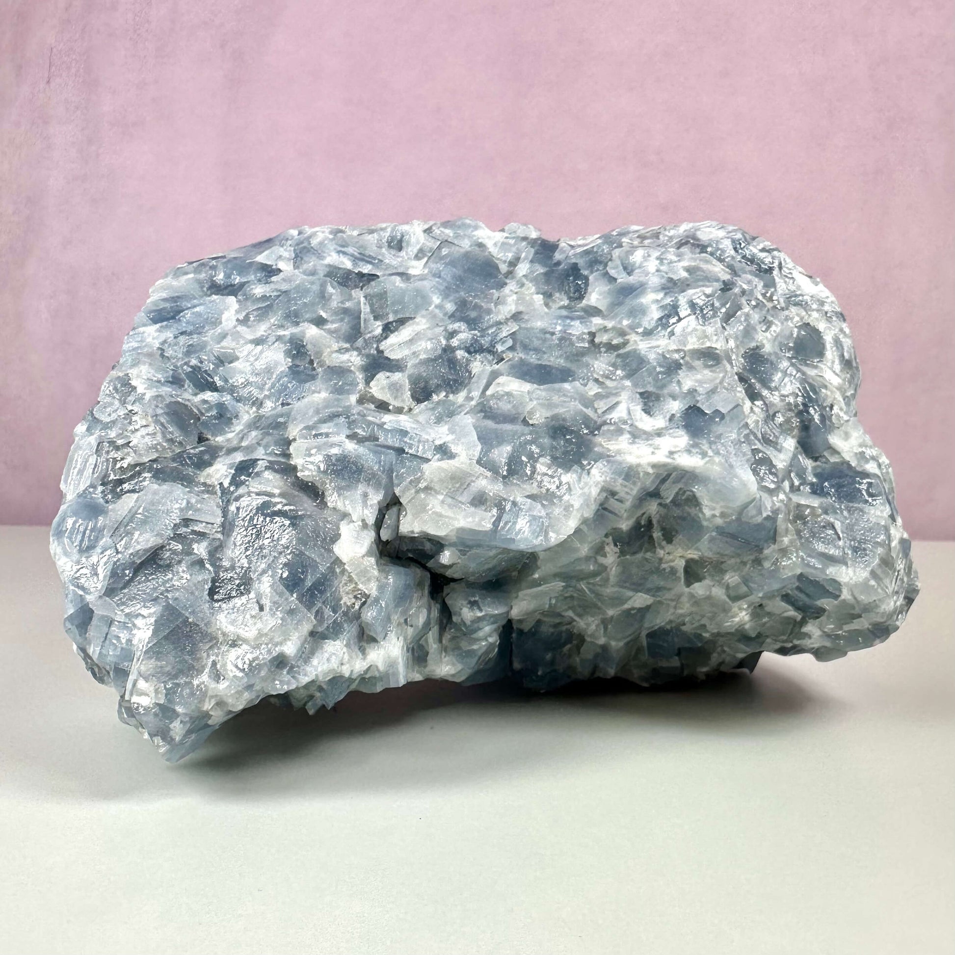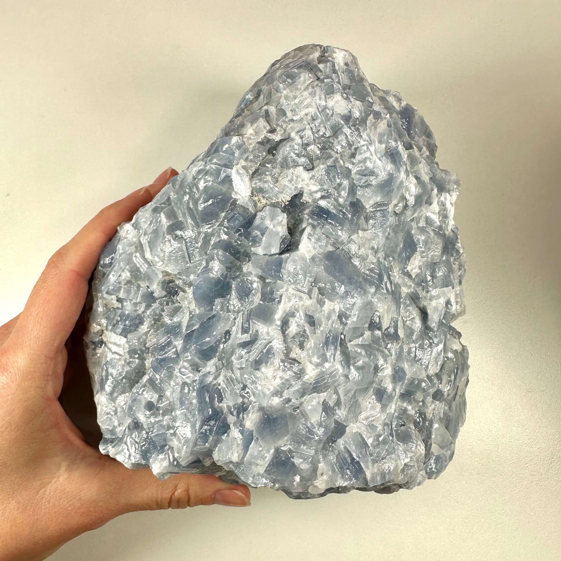 Blå calcit hører til mineralgruppen calcit, som primært består af calciumcarbonat (CaCO3). Dette mineral krystalliserer i en heksagonal struktur, hvilket giver det en perfekt rhombohedral spaltningsmønster. Den porøse og krakelerede overflade af rå blå calcit gør den skrøbelig, så den kræver forsigtig håndtering.Historie