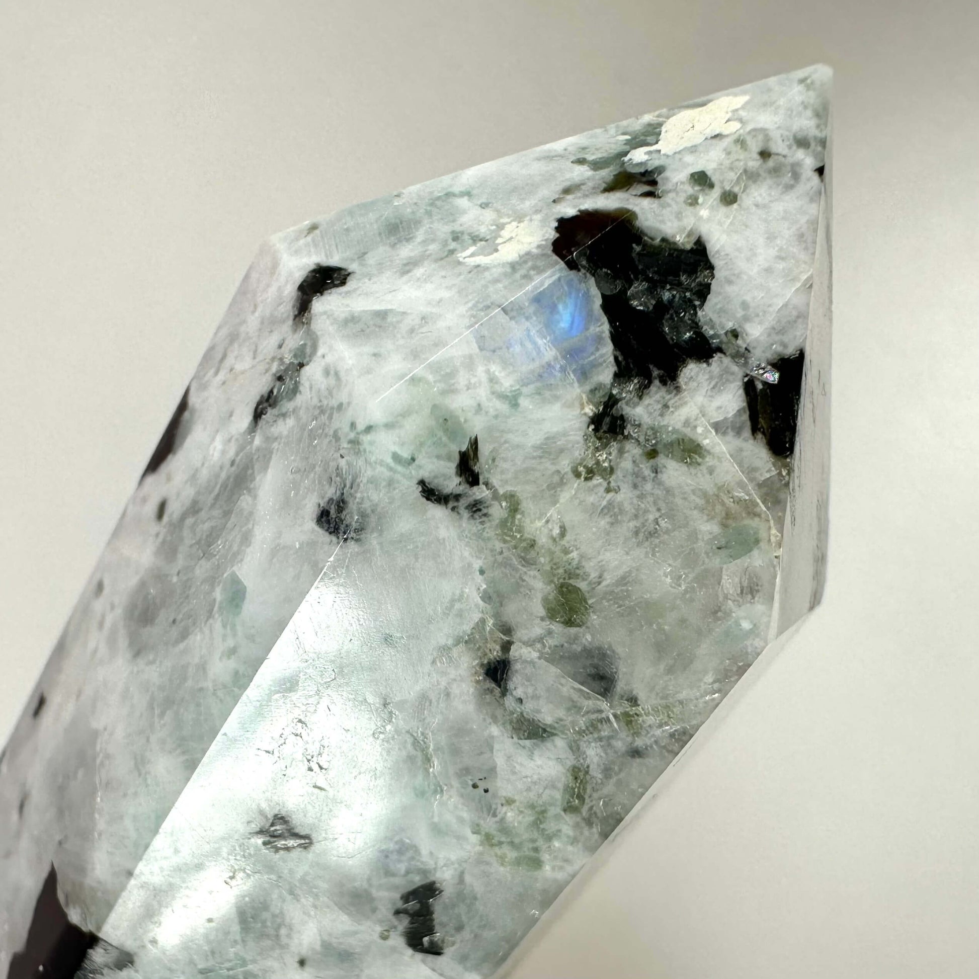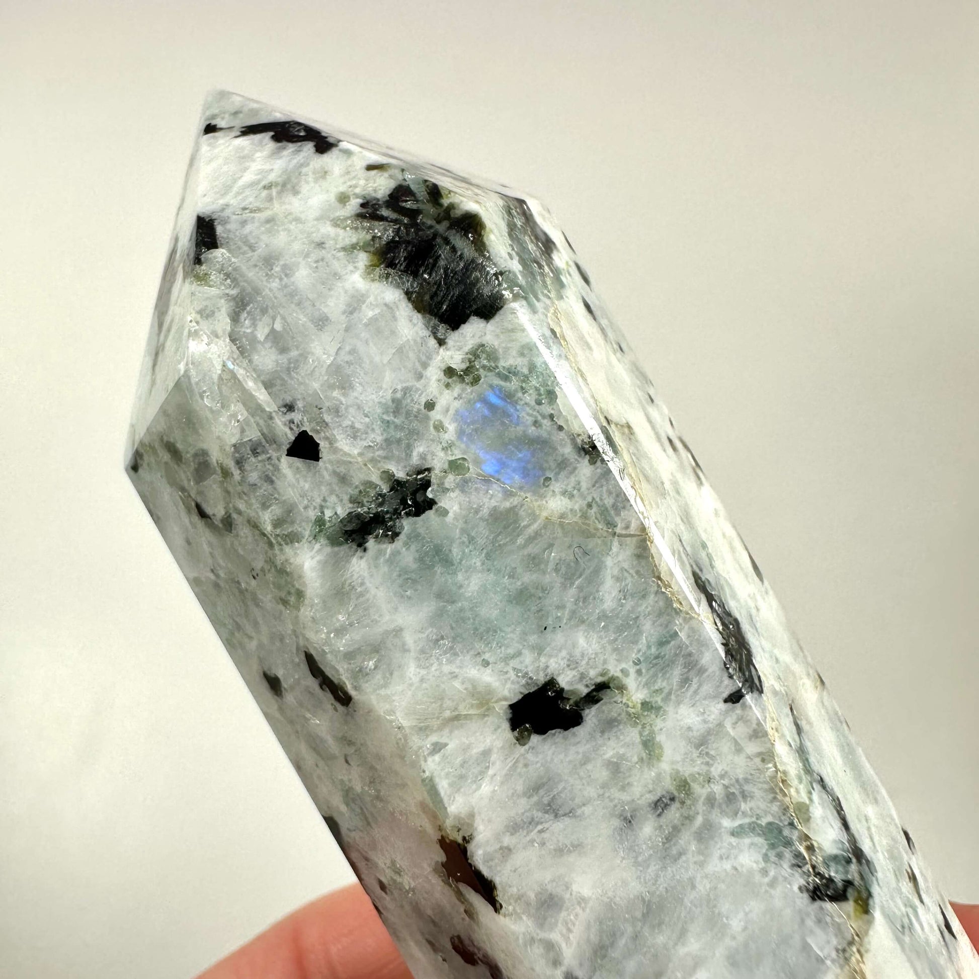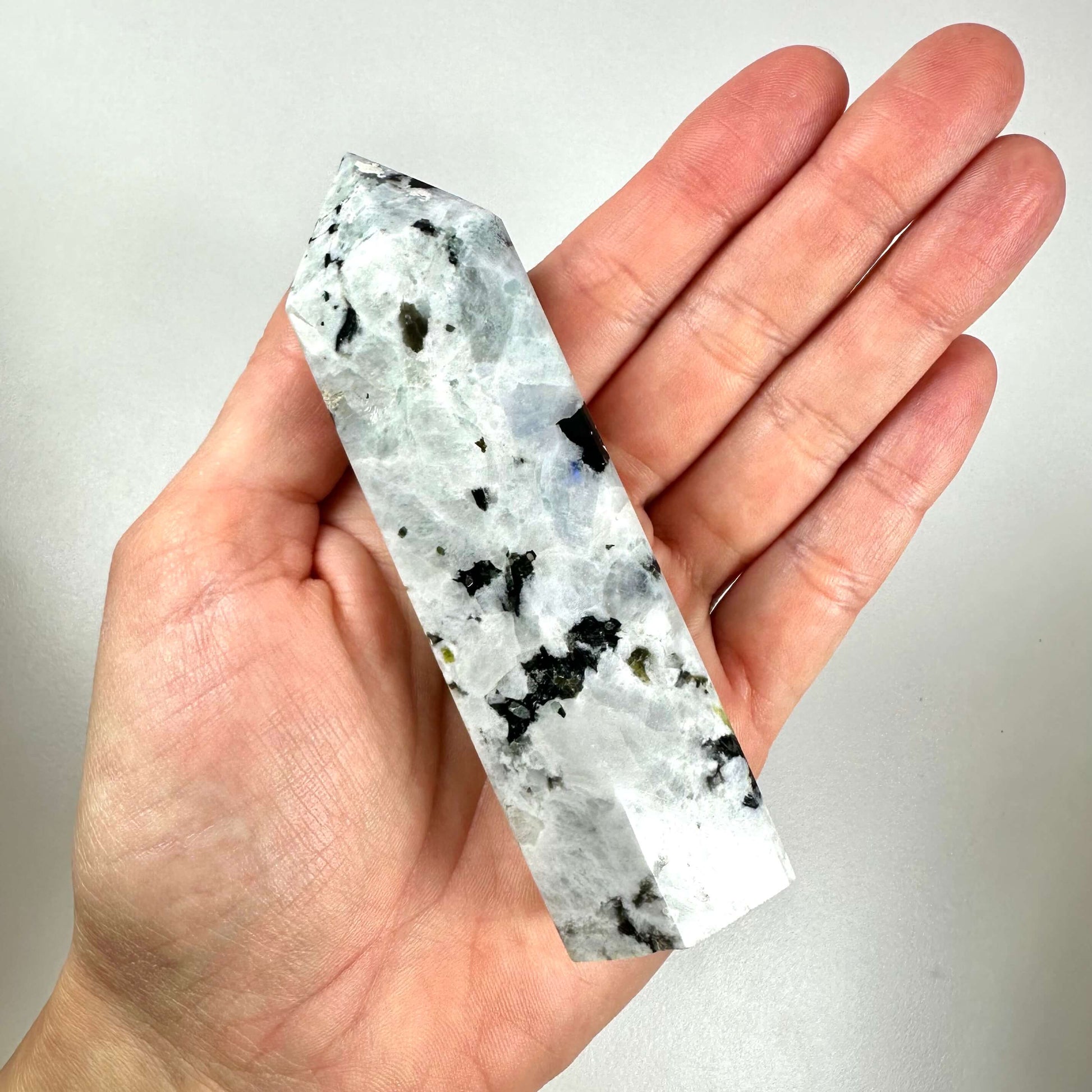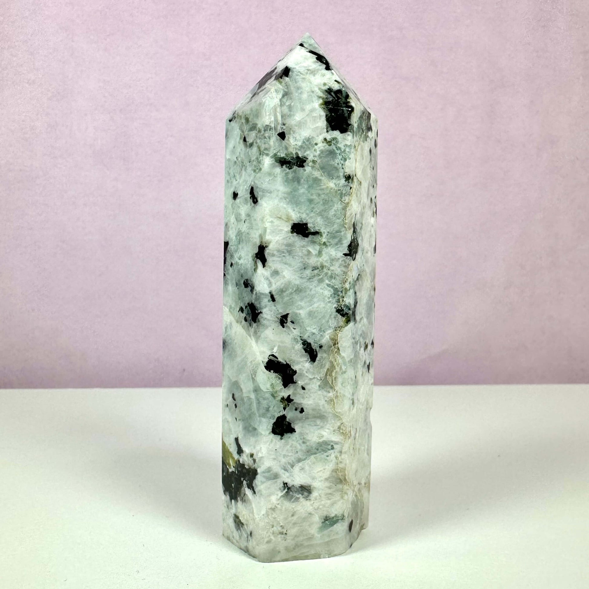 Oplev ro og kreativitet med regnbue månesten tårn, der med sin perlemorsglans bidrager til balance og inspiration.