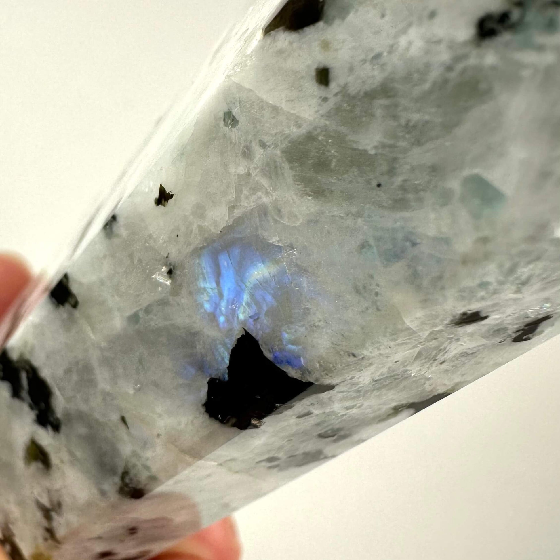 Regnbue månesten er en variant af labradorit og er klassificeret som en feldspatsilikat med adularescence. Denne feldspat mineralformation finder sted igennem årtusinders geologiske processer, hvor forskellige mineraler krystalliserer under høje tryk og temperaturer. Resultatet er en pragtfuld krystal med et perlemorsagtigt skær, der fremviser et fascinerende spil af regnbuens farver, når lys rammer overfladen.