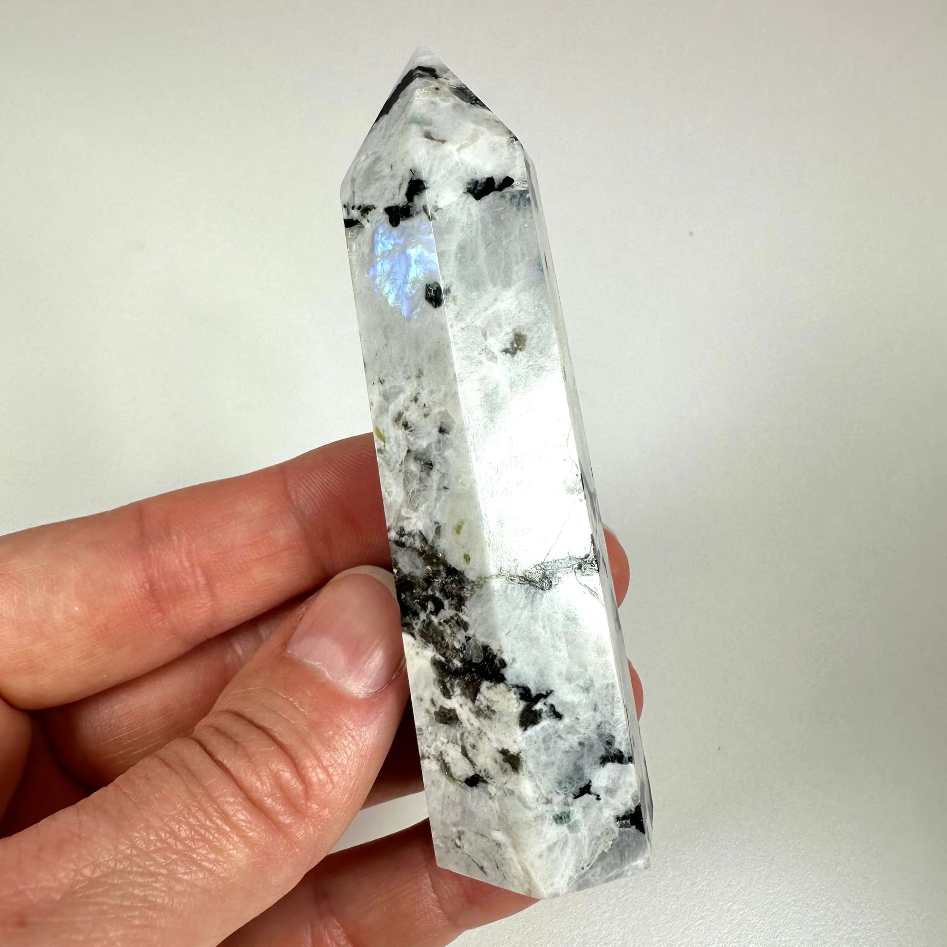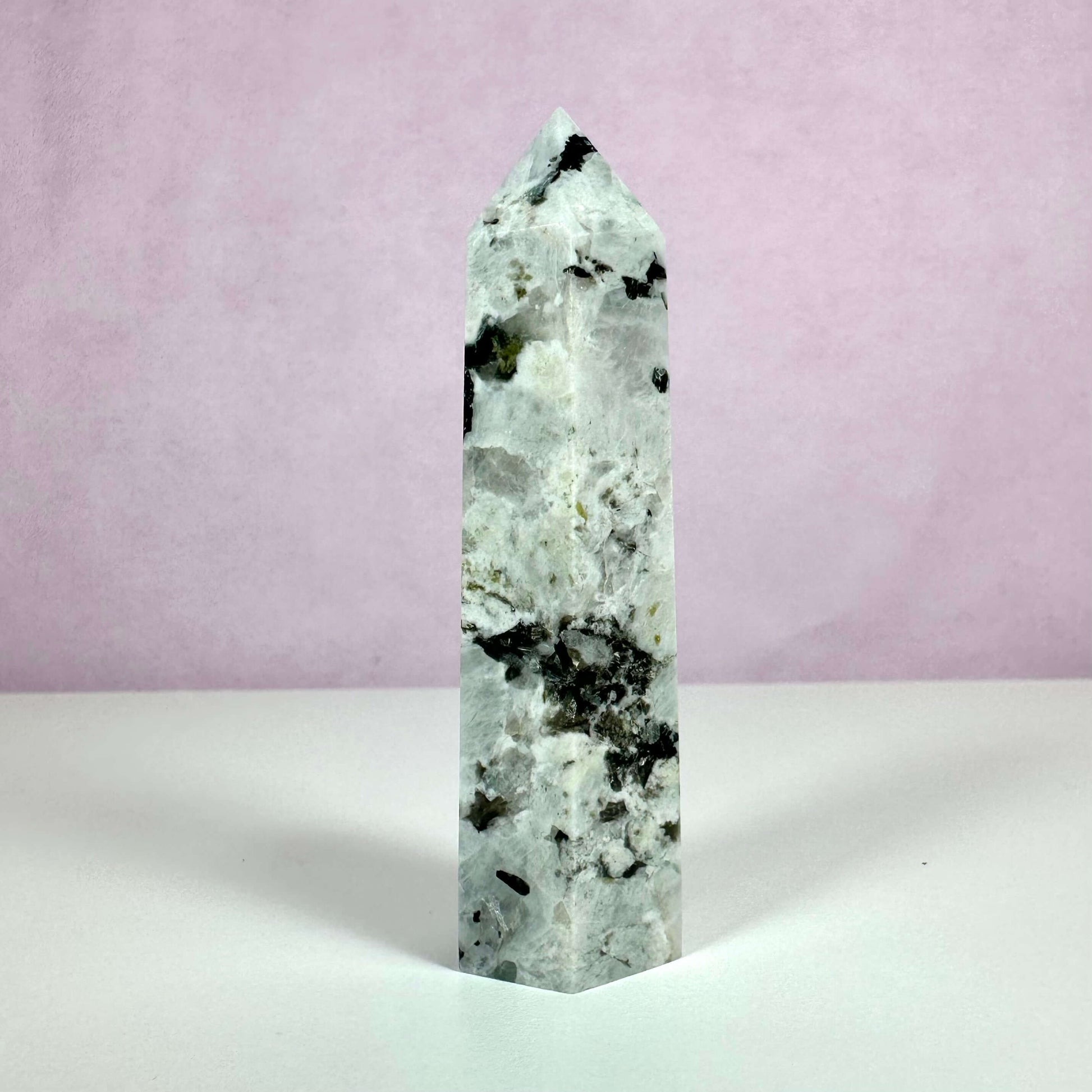 Regnbue månesten er en fascinerende krystal, kendt for sin perlemorsagtige glans og det blændende spil af farver, der kaldes adularescens. Denne sten er anerkendt som en stærk spirituel krystal, der fremmer intuition, balance og spirituel vækst. Regnbue månesten tårn er ofte brugt til at styrke forbindelsen mellem ens intellekt og spirituelle evner, samtidig med at den øger følelsen af at være forbundet til noget større. Den har en blid, beroligende energi, der kan fjerne følelsesmæssige spændinger og skærme mod negative energier.