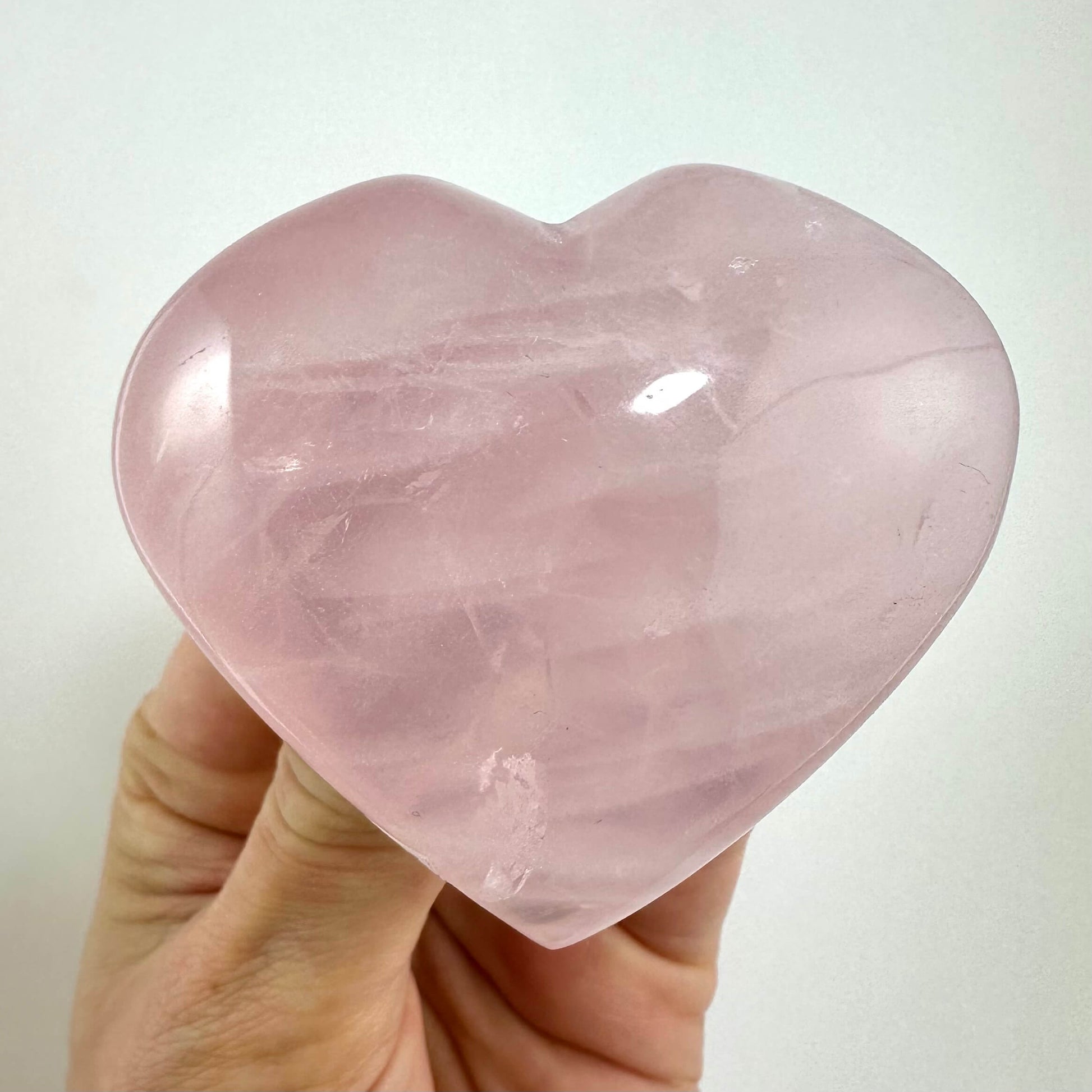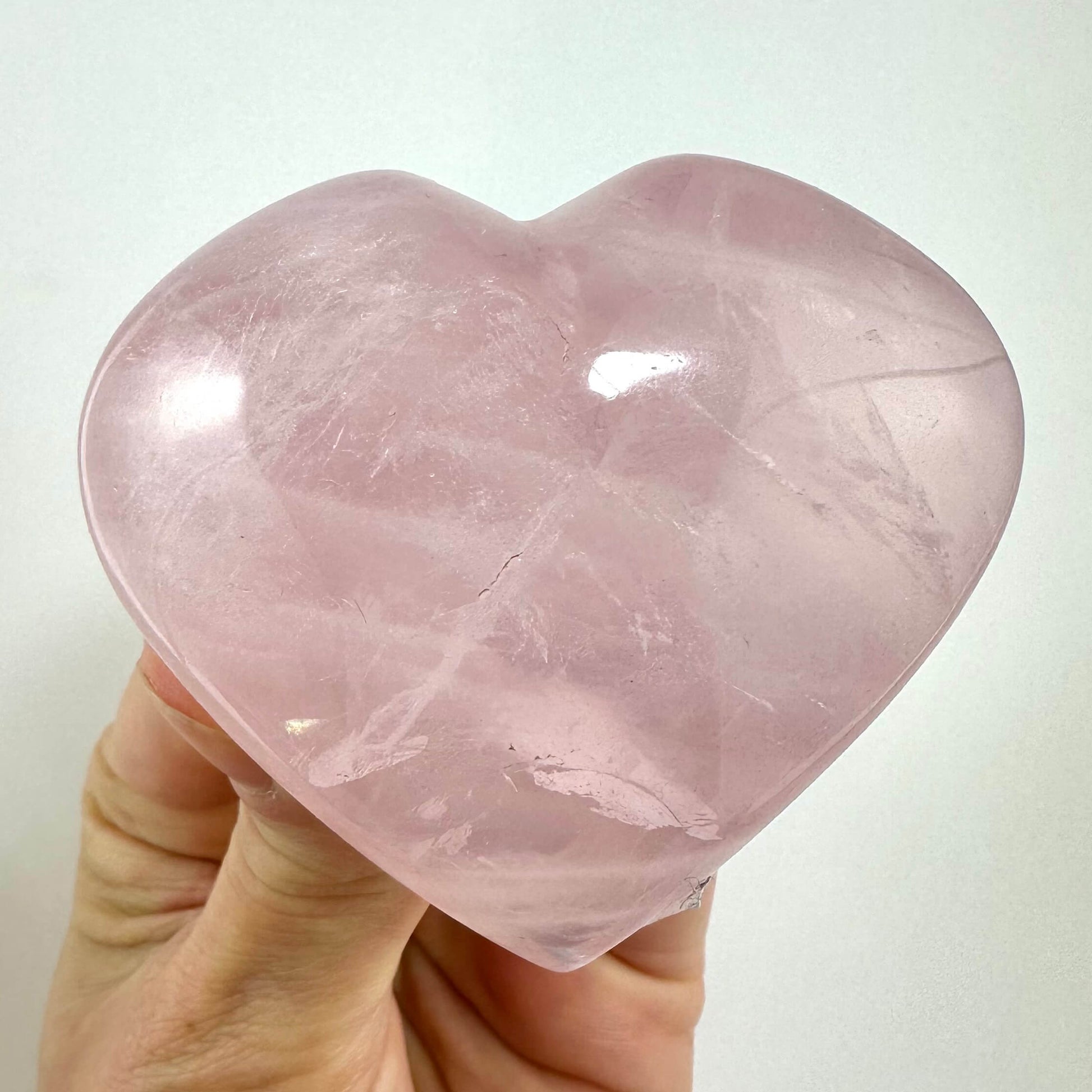 Rosenkvarts hjerte nr. 4 er en blid krystal, der åbner for selvkærlighed og skaber indre ro – perfekt som meditationssten eller smykke.