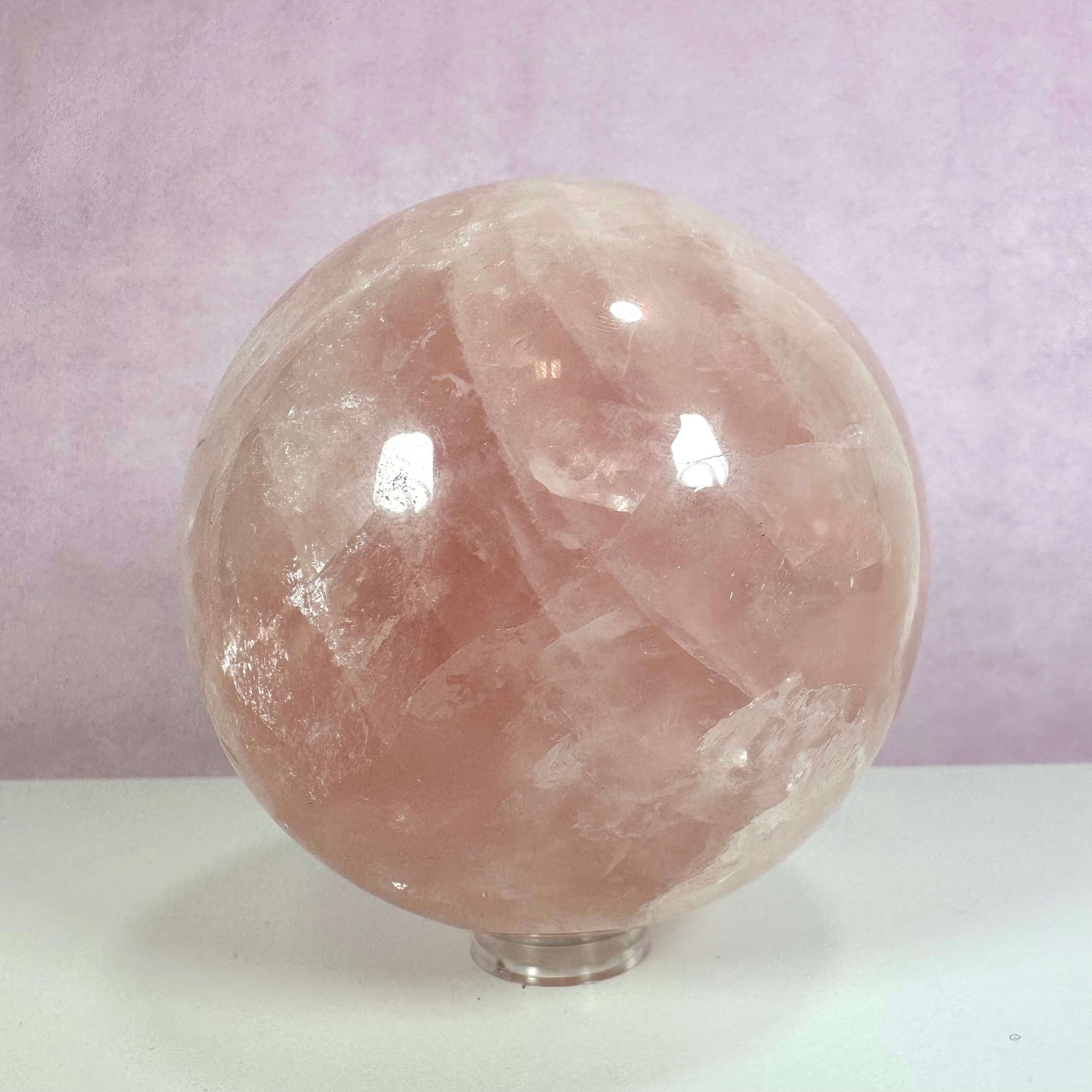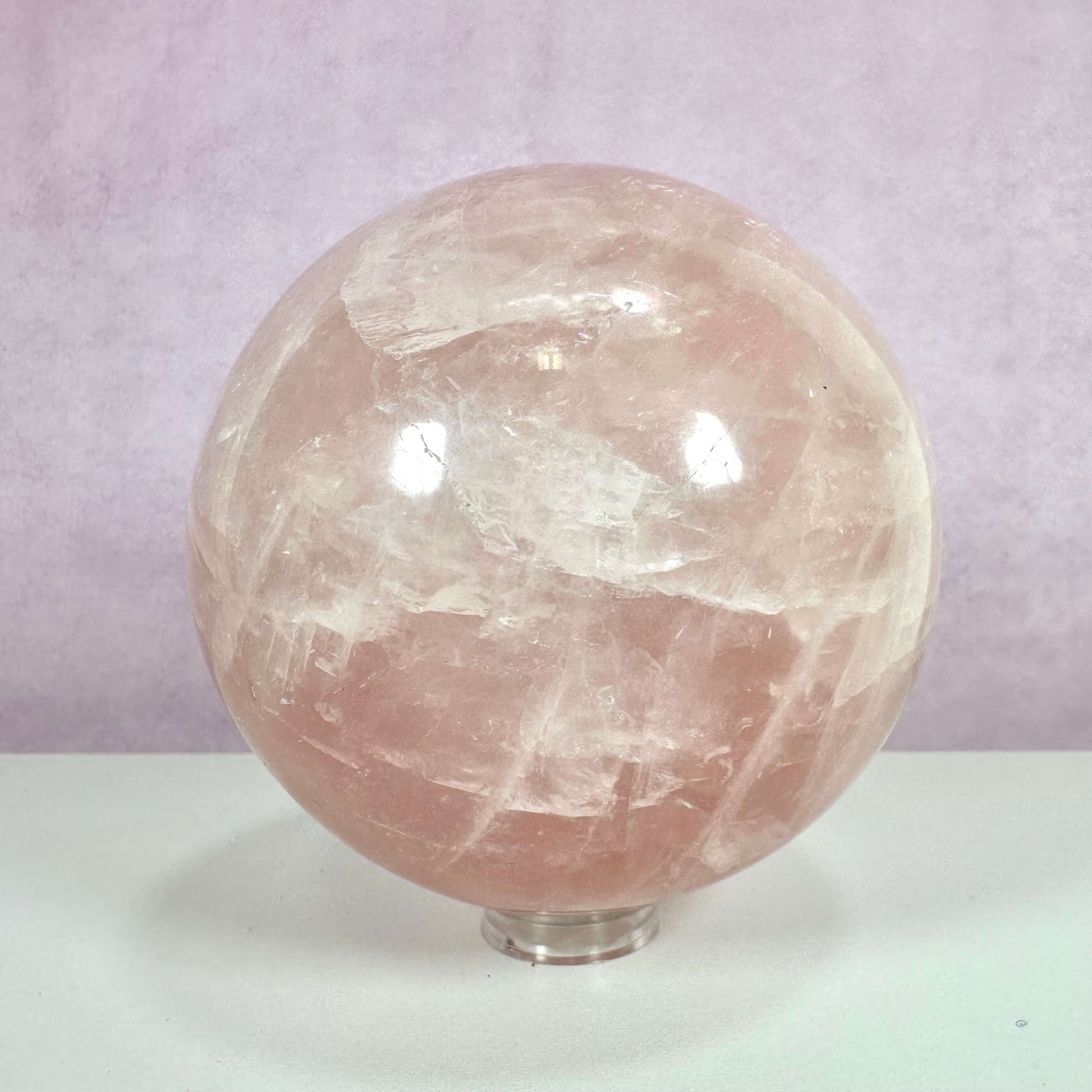 Rosenkvarts kugle xl nr 1 udstråler blid pink glød og skaber ro i dit hjem.